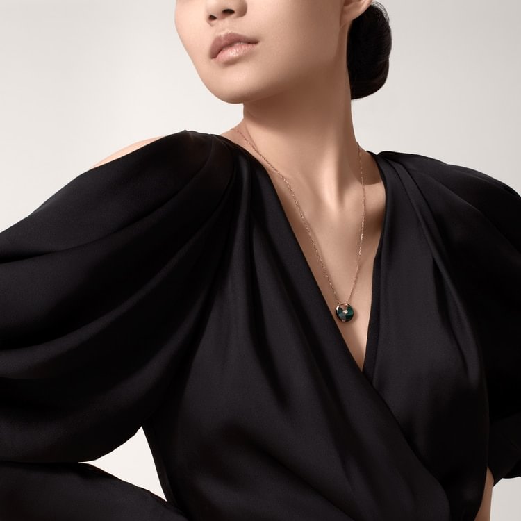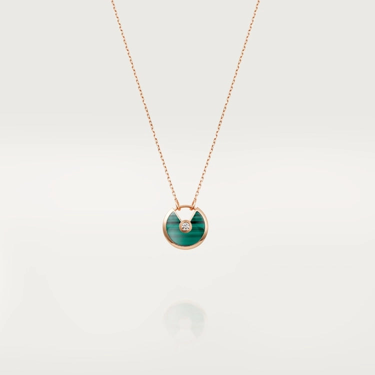アミュレット ドゥ カルティエ ネックレス、スモールモデル、18Kローズゴールド(750/1000)、マラカイト、ブリリアントカット ダイヤモンド1個(0.09カラット)。モチーフの直径:17mm。チェーンの長さ:60cm。