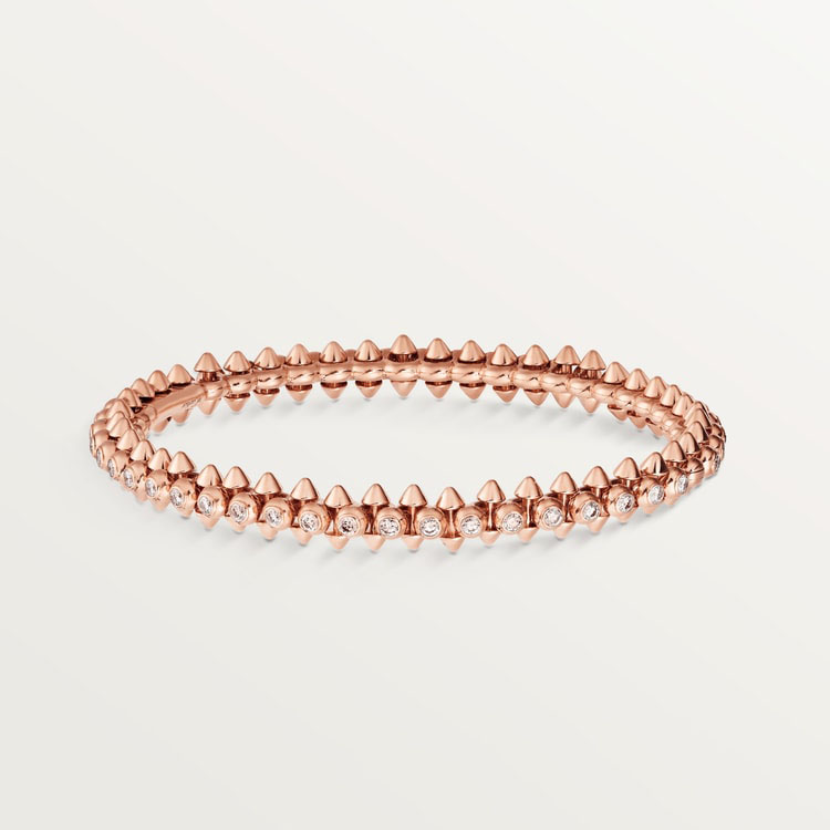 1. クラッシュ ドゥ カルティエ ブレスレット、18Kローズゴールド(750/1000)、ブリリアントカットダイヤモンド51個(計1.51カラット)をセット。幅:6.8mm(サイズ17)。