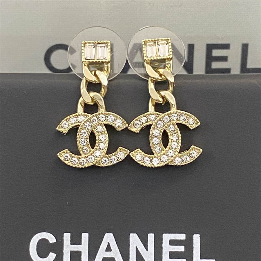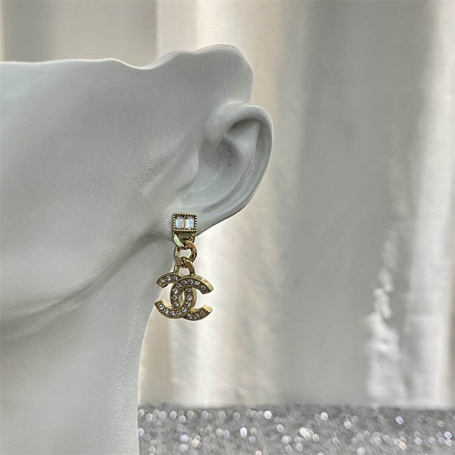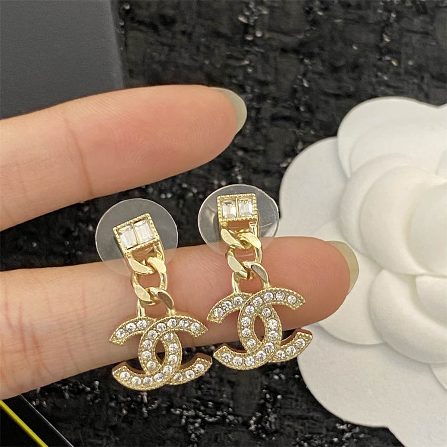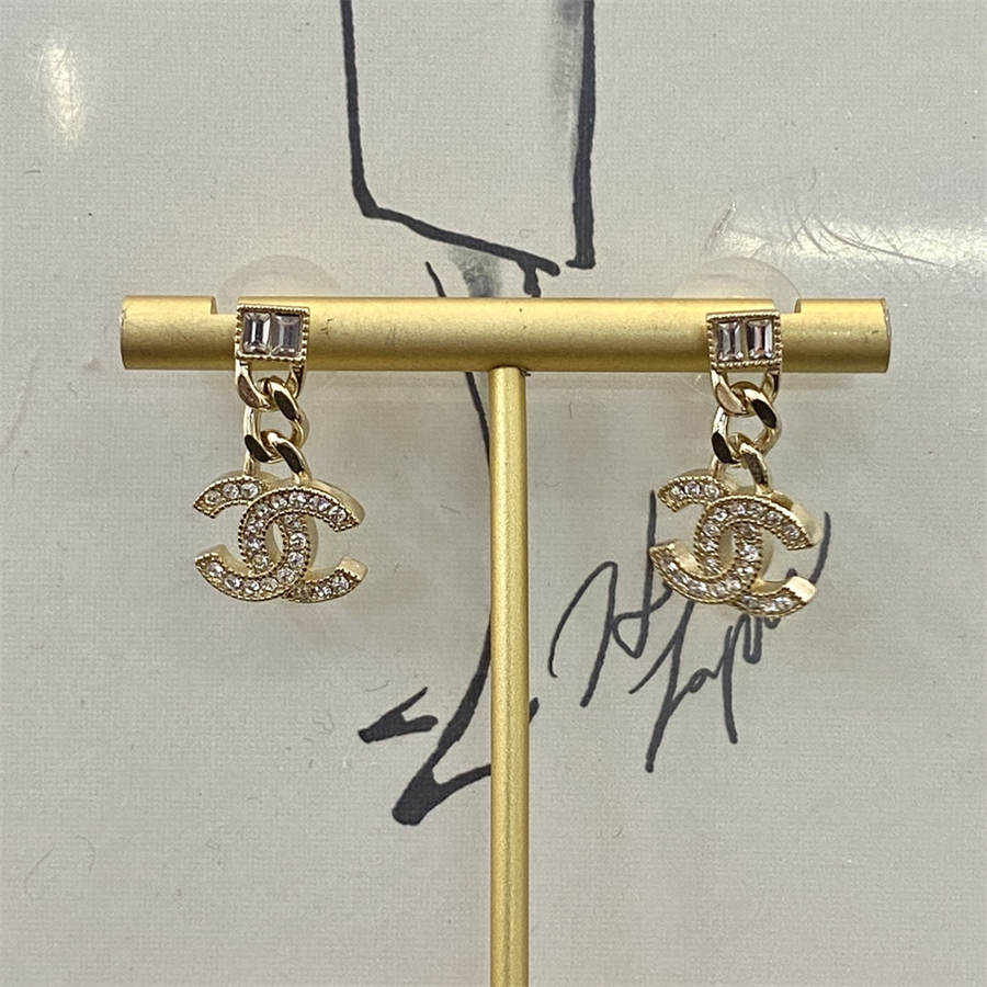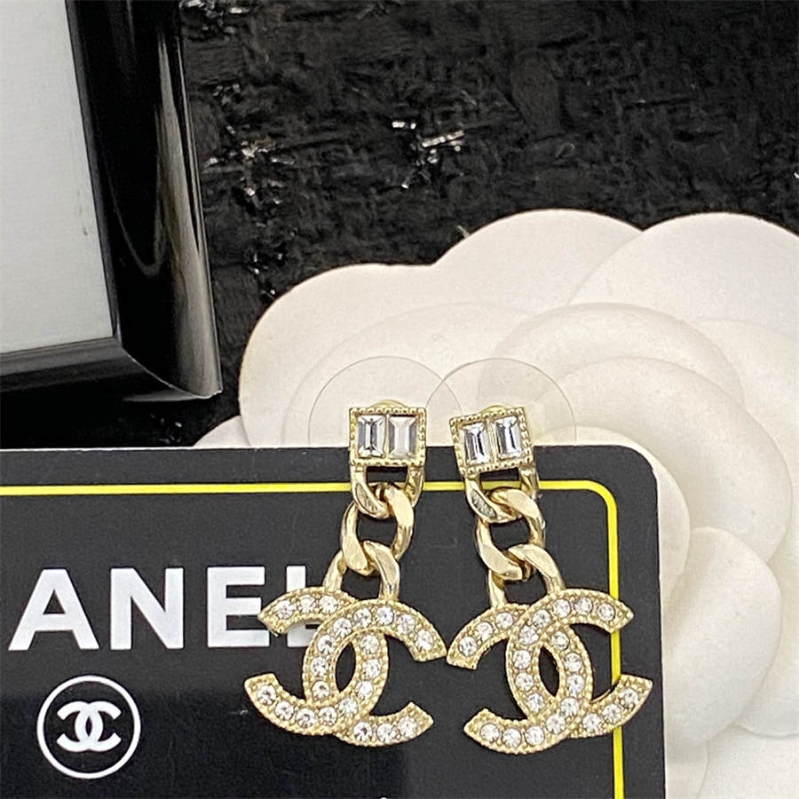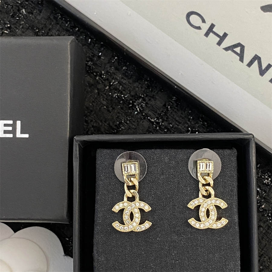 シャネルのラージペールゴールドチェーンスクエアダイヤモンドダブルCイヤリング