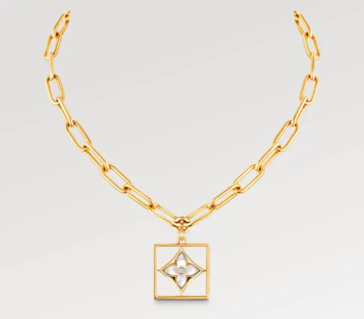 B ブロッサム コレクションの18Kイエローゴールドネックレスは、アイコニックなモノグラム・フラワーが大胆に咲き誇るデザインです。ホワイトマザーオブパールを彫刻したモチーフは、輝くダイヤモンドでアクセントを添え、ゴールドのフレームで囲まれています。幾何学的なラインと彫刻的なボリュームが、どんなシルエットにもモダンな雰囲気を添えます。
