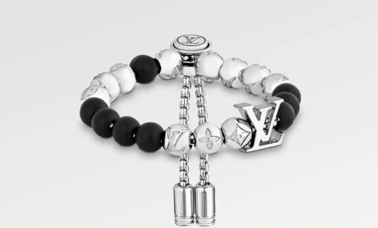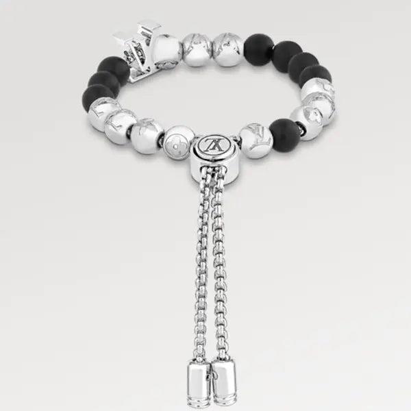 若々しい異素材の融合が、モノグラム・ビーズ・ブレスレットを目を引くステートメントピースに仕上げています。調節可能なバンドは、ダークトーンとライトトーンの対比が際立つデザインです。LVイニシャルをはじめとするメゾンの象徴的なシグネチャーが、プレッシャーボタン式の留め具と両端の先端にエングレービングされています。