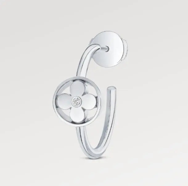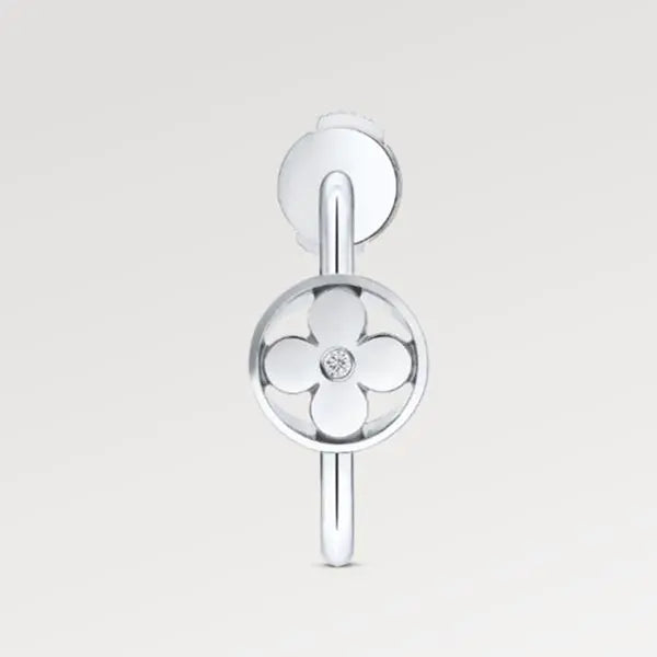 この「イディール ブロッサム」スモールフープイヤリングは、1896年にジョルジュ・ルイ・ヴィトンが創作したモノグラム・フラワーに、18Kホワイトゴールドの控えめなエレガンスを添えています。完璧な小さなサークルの中に繊細な花が咲き、その中央にはきらめくダイヤモンドがあしらわれています。単体ではもちろん、コレクションの他のアイテムと組み合わせて個性的なスタイルを演出することもできます。