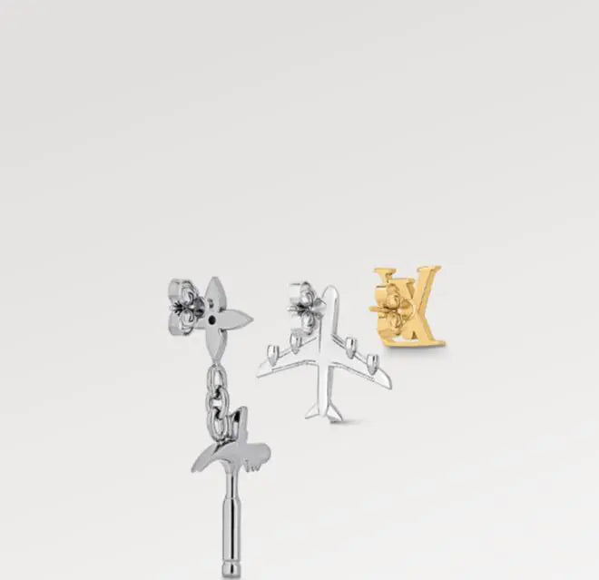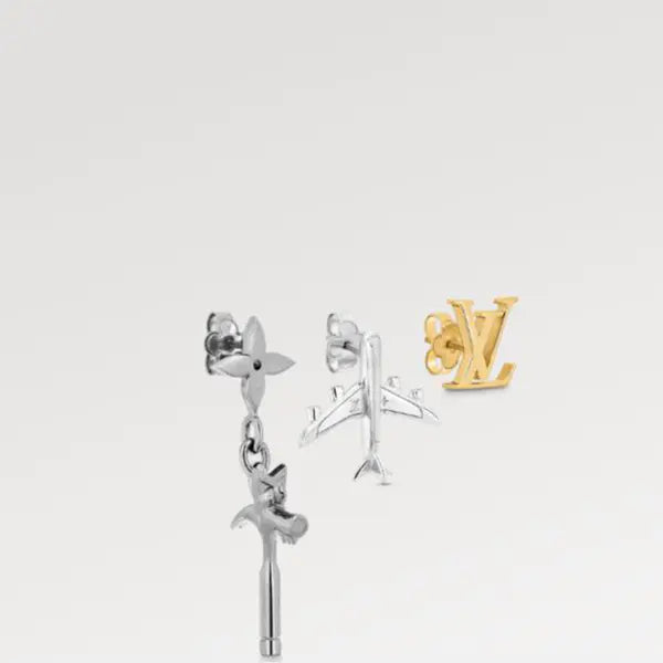 LVコミックスのイヤリング3個セットは、今シーズンのテーマである「旅」と「建築」を、メゾンの象徴的なモチーフにオマージュを捧げて表現しています。ハンマー、LVイニシャル、そしてモノグラム・フラワーとLVイニシャルがエングレービングされた飛行機があしらわれています。磨き上げられた金具がモダンな美しさを演出します