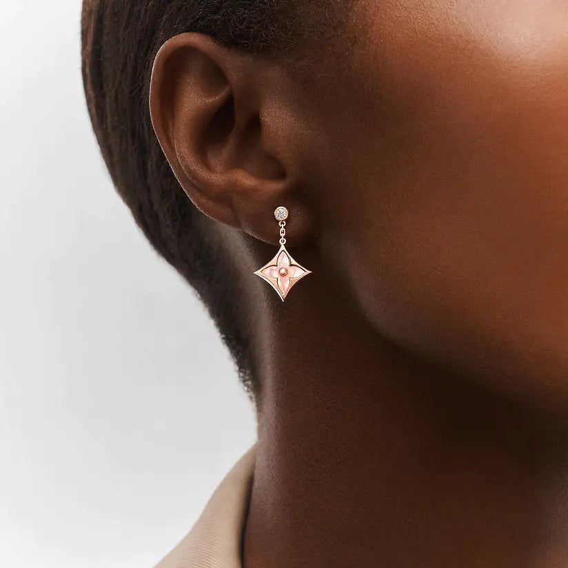 カラー ブロッサム BBは、1896年にジョルジュ・ルイ・ヴィトンによって創作されたモノグラム・フラワーを称える作品です。18Kピンクゴールドのこのイヤリングでは、彫刻されたピンクのマザーオブパールに花が咲き誇り、ダイヤモンドのセッティングがそれを引き立てています。石の繊細な曲線を完璧に仕上げるには、数ヶ月もの作業が必要でした。