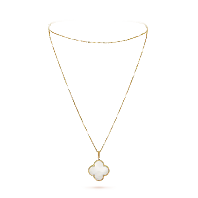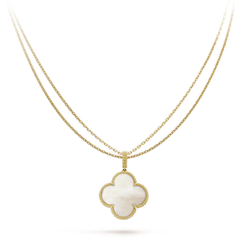 マジック アルハンブラ ロングネックレス、シングルペンダント、18K イエロー ゴールド、ホワイト マザー オブ パール。