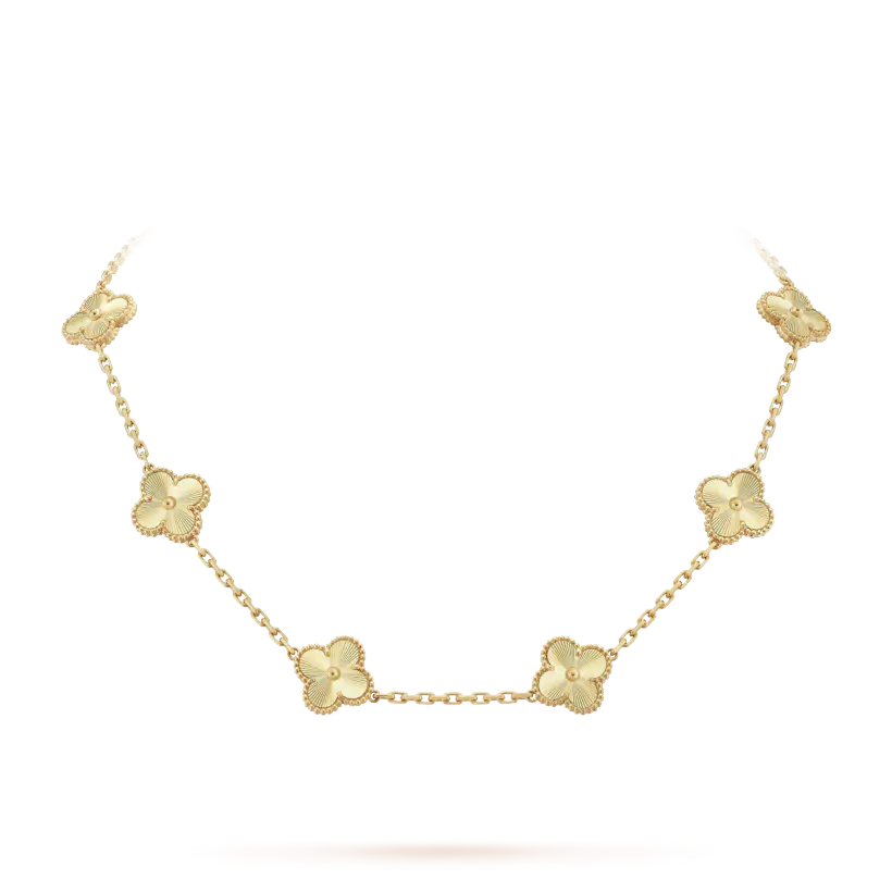 ヴィンテージ アルハンブラ ネックレス、10 個の四つ葉の幸運のトーテム、放射状パターンの 18K イエロー ゴールド。