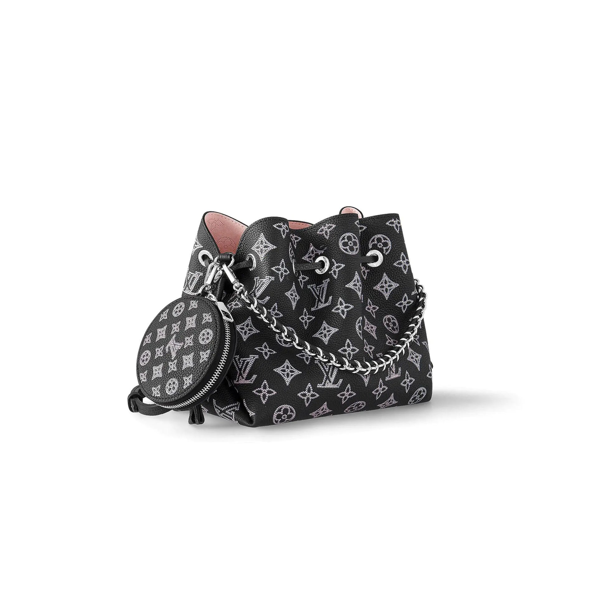 ベラ バケットバッグと付属のラウンド型コインケースは、パンチング加工を施したモノグラムパターンをあしらったマヒナカーフレザーを使用しています。ピンクとクリームのグラデーションがモチーフを際立たせ、彩りを添えています。トーンオントーンのレザートリムがデザインを引き立てます。バッグの内側にはペールピンクのライニングが施されています。