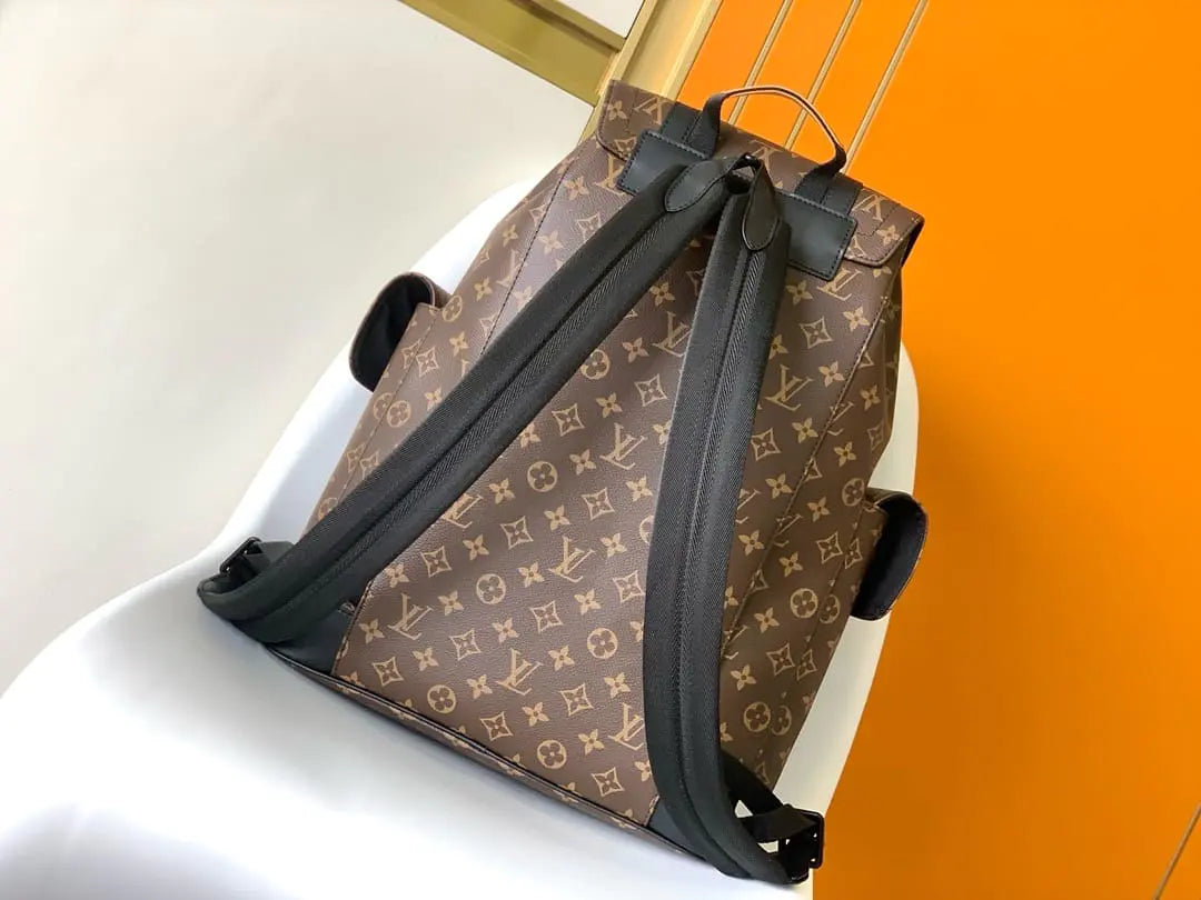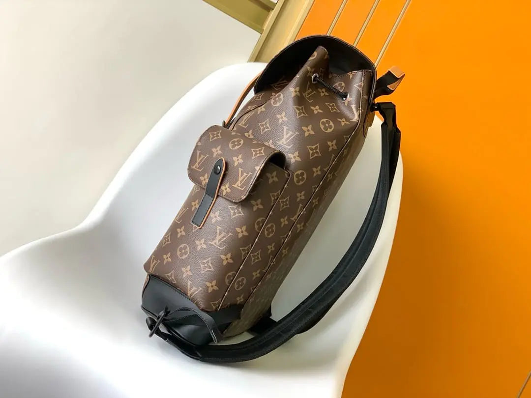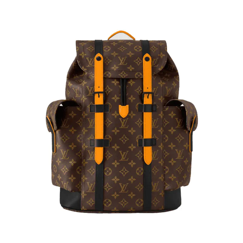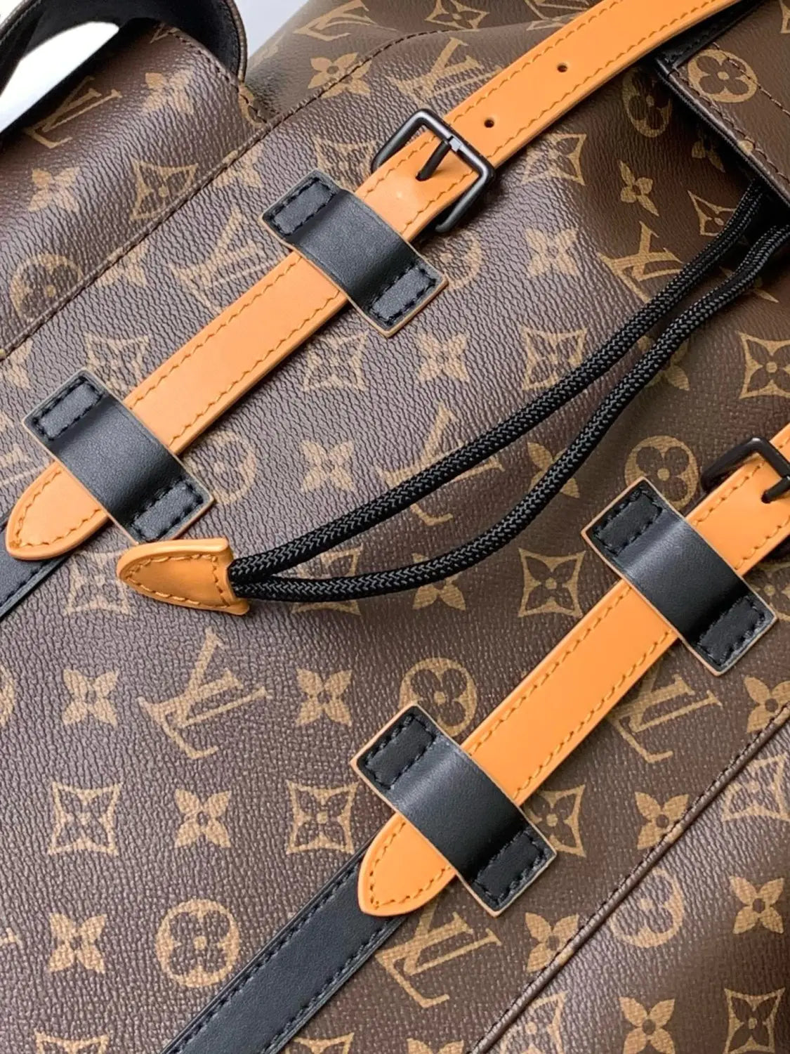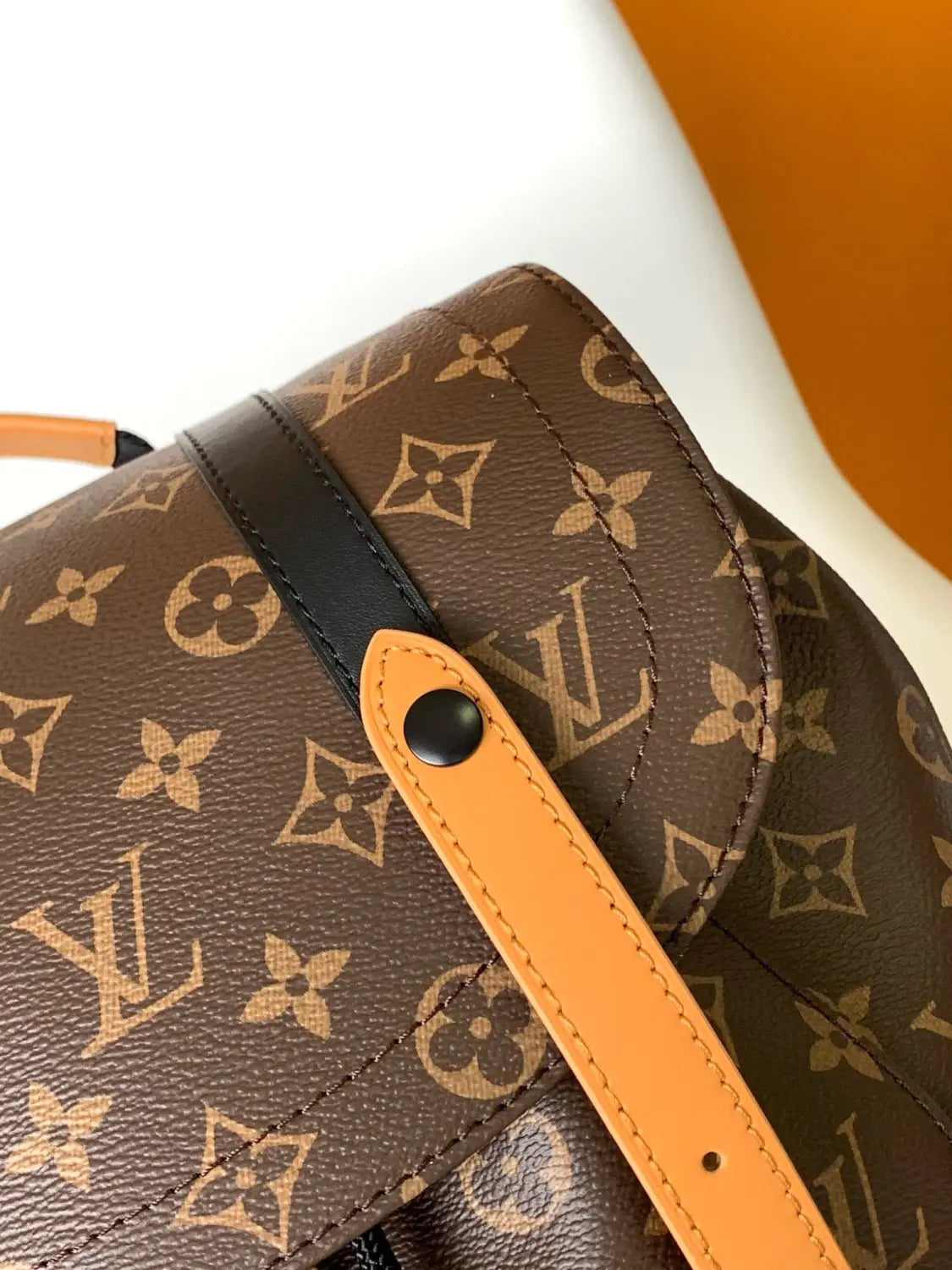 クリストファー MM バックパックは、モノグラム・マカサー キャンバスにブラックのカウハイドレザーのトリム、フロントバンドにはサフランカラーのレザーをあしらいました。ダークなモノグラム・キャンバスにあしらわれたカラーアクセントが、デザインに活気を与えています。リュックサックからインスピレーションを得たこのバックパックは、2つのボリュームのあるサイドポケットを備え、ドローストリングとスナップボタンで開閉します。