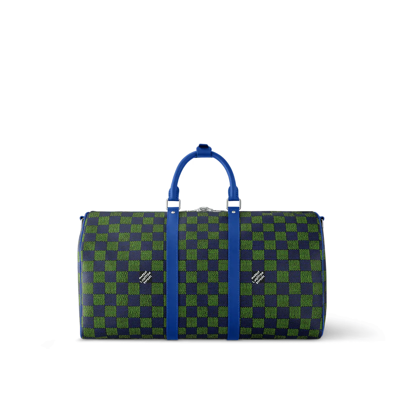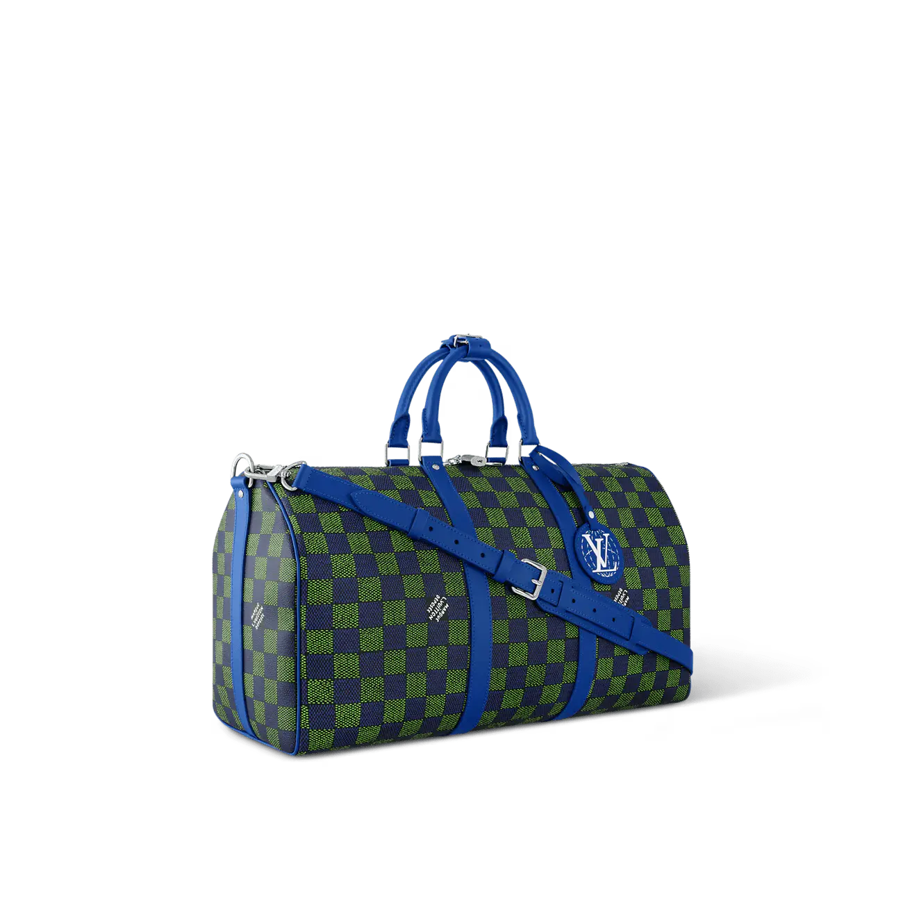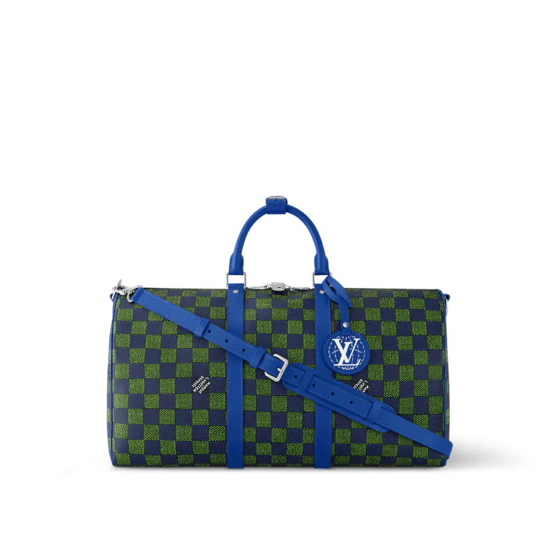 キーポル・バンドリエール50は、ファレル・ウィリアムスのダミエ・ヘリテージ・コーテッドキャンバスをブルーとグリーンのカラーウェイで美しく仕上げ、チェッカーボード模様にはクラシックな「Marque Louis Vuitton Déposée」の刻印がアクセントを添えています。ブルーのカウハイドレザートリム、トップハンドル、取り外し可能なショルダーストラップがバッグ全体を構成。内側のモノグラム・キャンバスのライニングは、メゾンの伝統を彷彿とさせます。