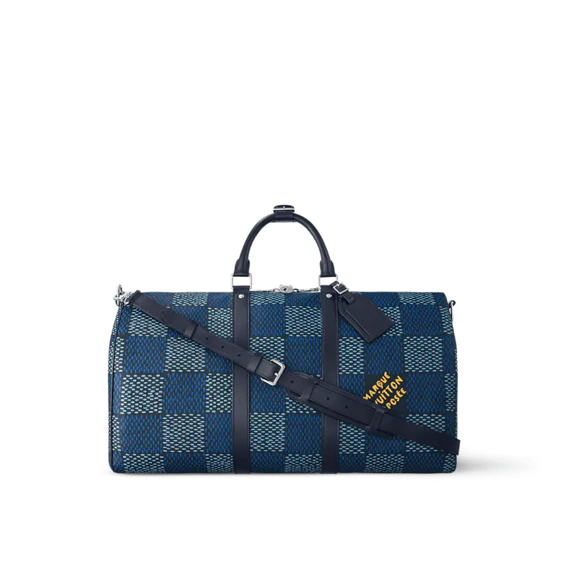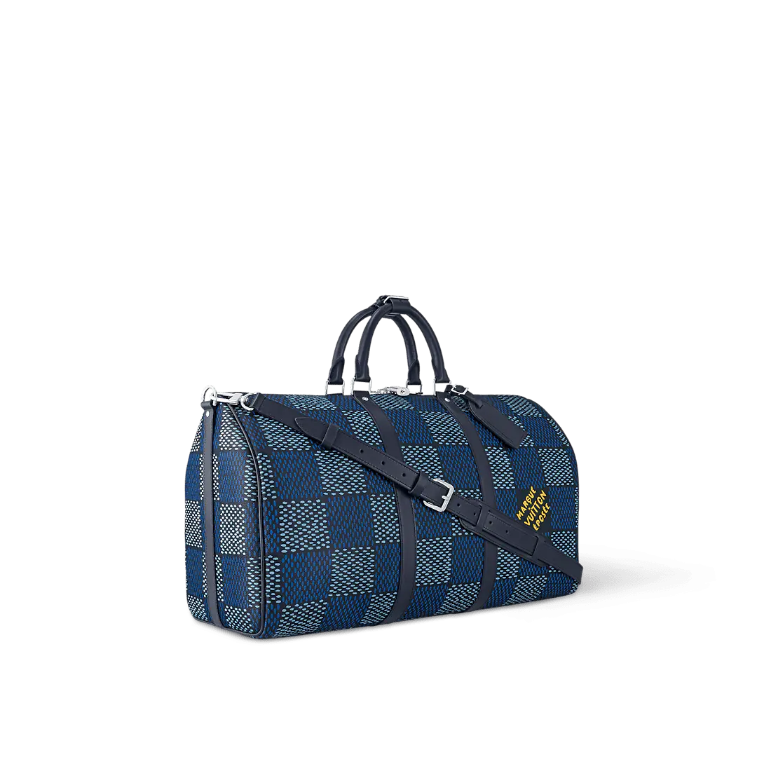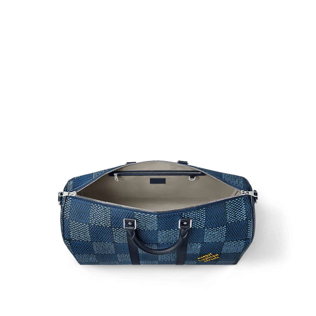 このキーポル バンドリエール 50 トラベルバッグは、ファレル ウィリアムスがデザインしたダミエ ヘリテージ キャンバスを使用してレトロなスタイルを表現し、大きなチェック柄に Marque L.Vuitton Déposée のロゴを組み込んでおり、1880 年代のオリジナルのダミエ パターンをさりげなく表現しています。