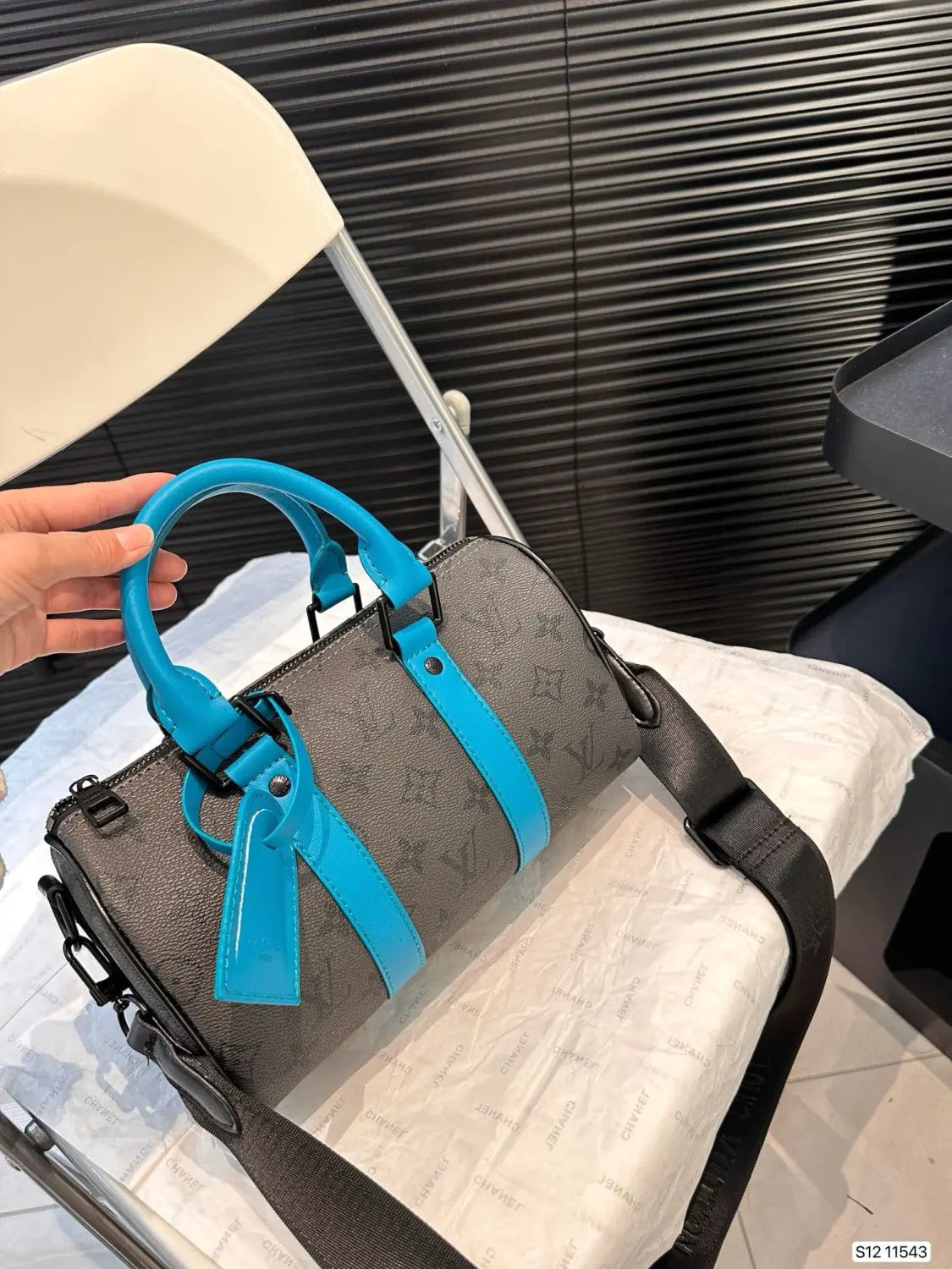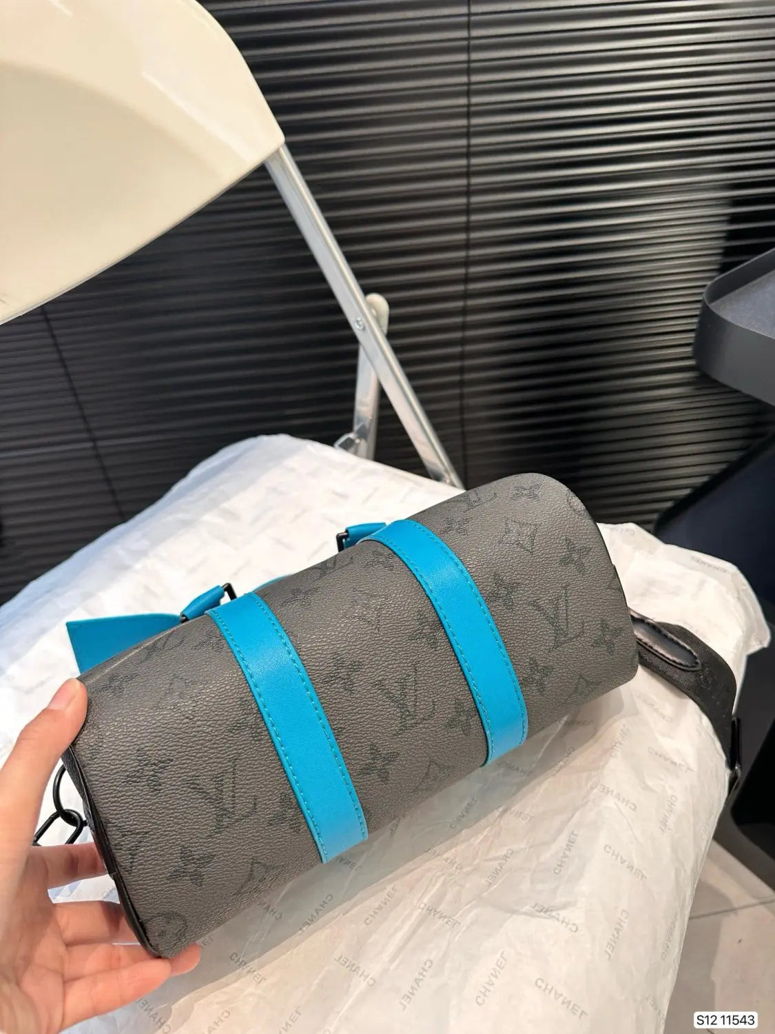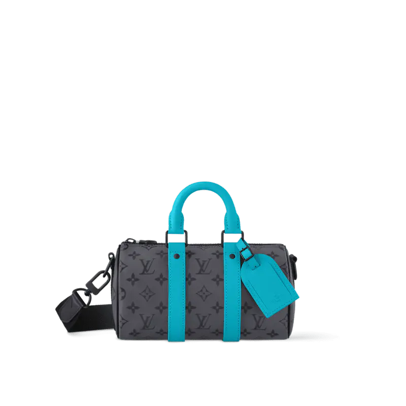 モノグラム・エクリプス・リバース キャンバスにターコイズカラーのレザートリムを合わせた、キーポル・バンドリエール 25 シティバッグ。サイドの補強バンド、トップハンドル、ネームタグは鮮やかなカラーでアクセントを添え、コンパクトなバッグに躍動感を添えています。マットブラックの金具と、取り外し・調節可能なブラックカラーのテキスタイルストラップが、デザインを引き立てます。