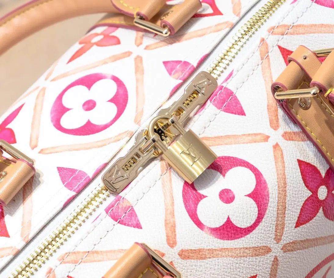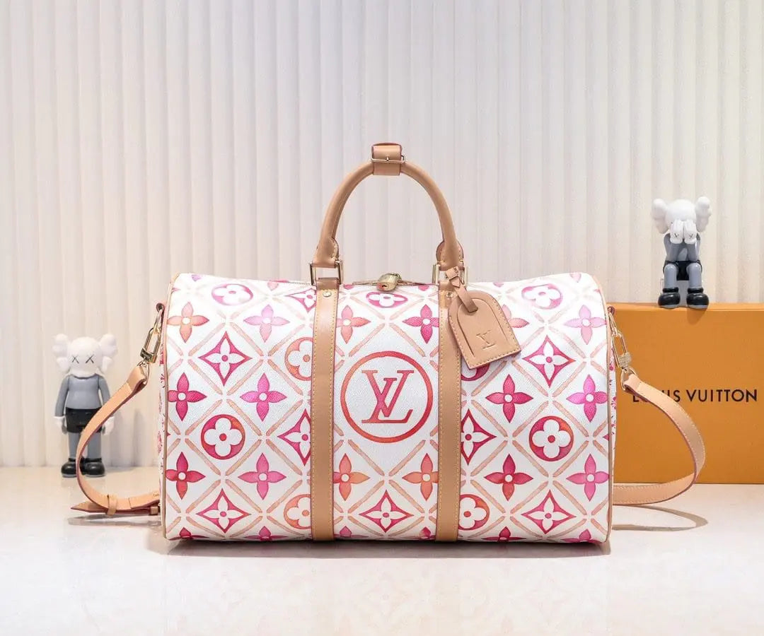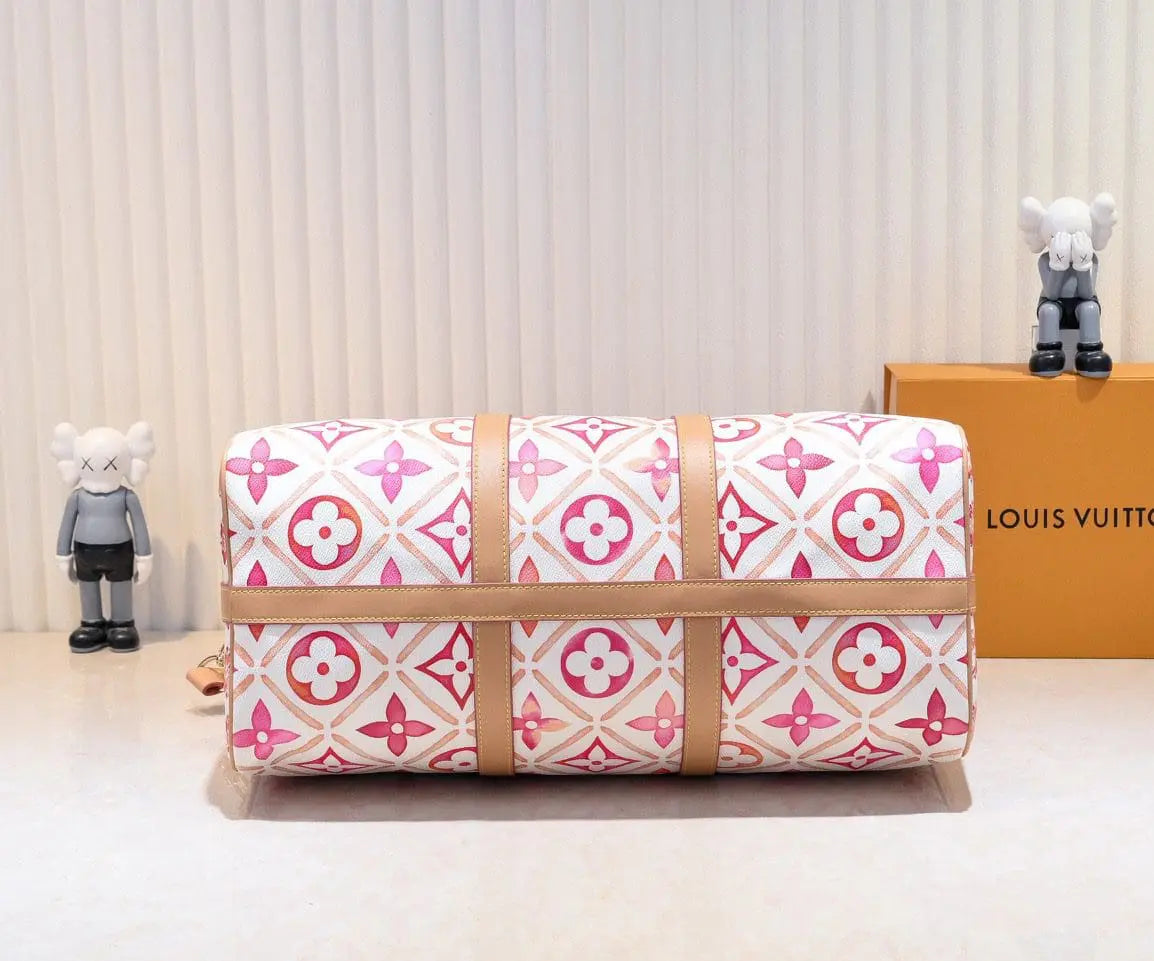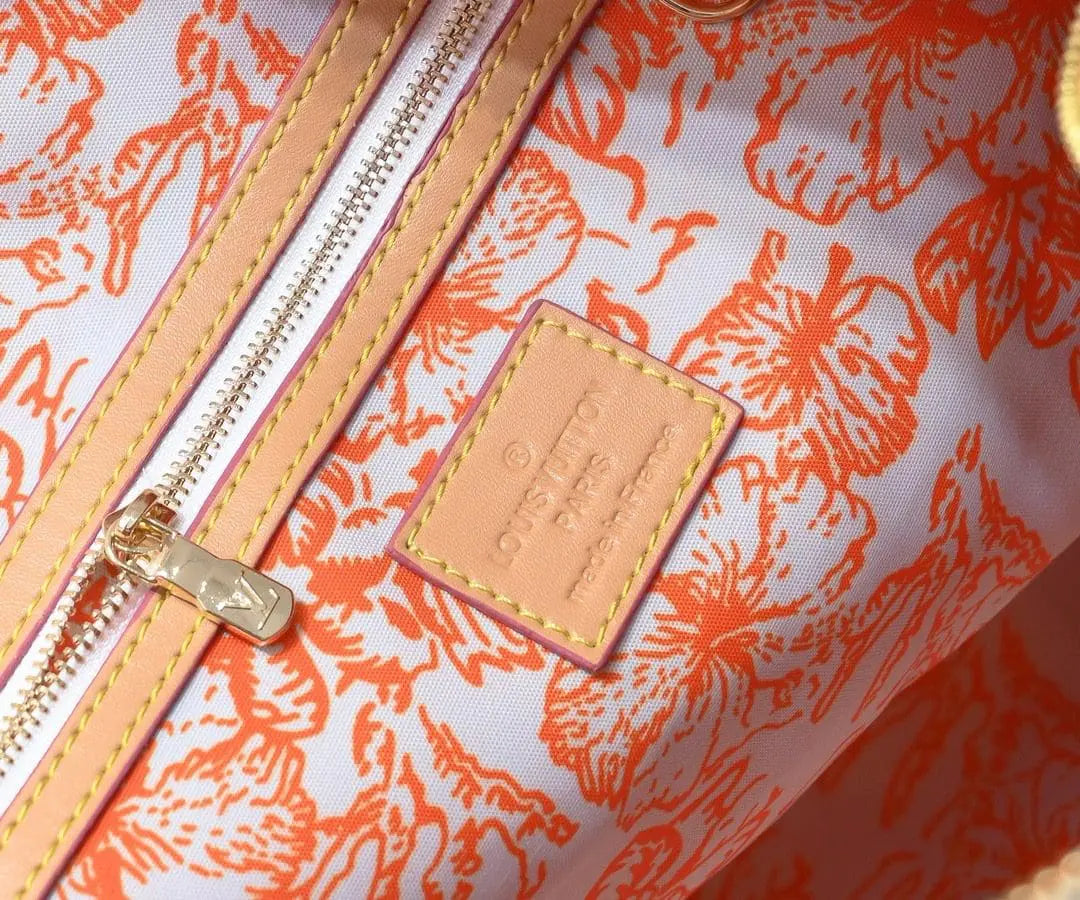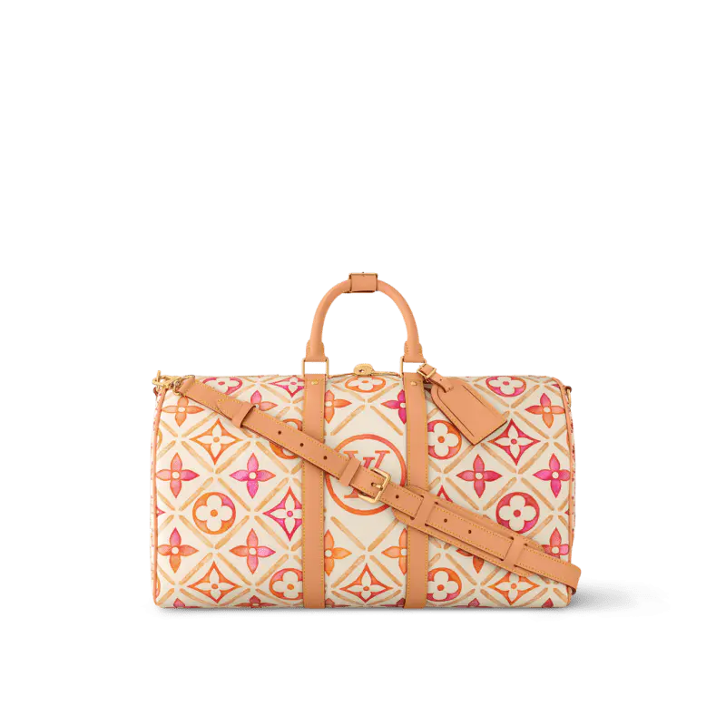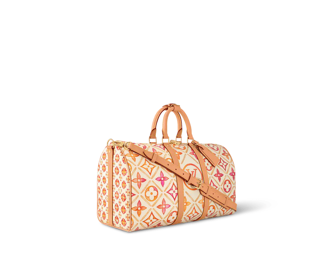 週末にぴったりのキーポル・バンドリエール 45は、モノグラムタイルのコーテッドキャンバスにカラフルなモノグラム柄をあしらった、夏にぴったりのバッグです。トップハンドル、サイドバンド、取り外し可能なストラップはすべて天然牛革製です。機内持ち込みバッグとしても使えるコンパクトサイズで、内側にはジッパー付きポケットが付いています。