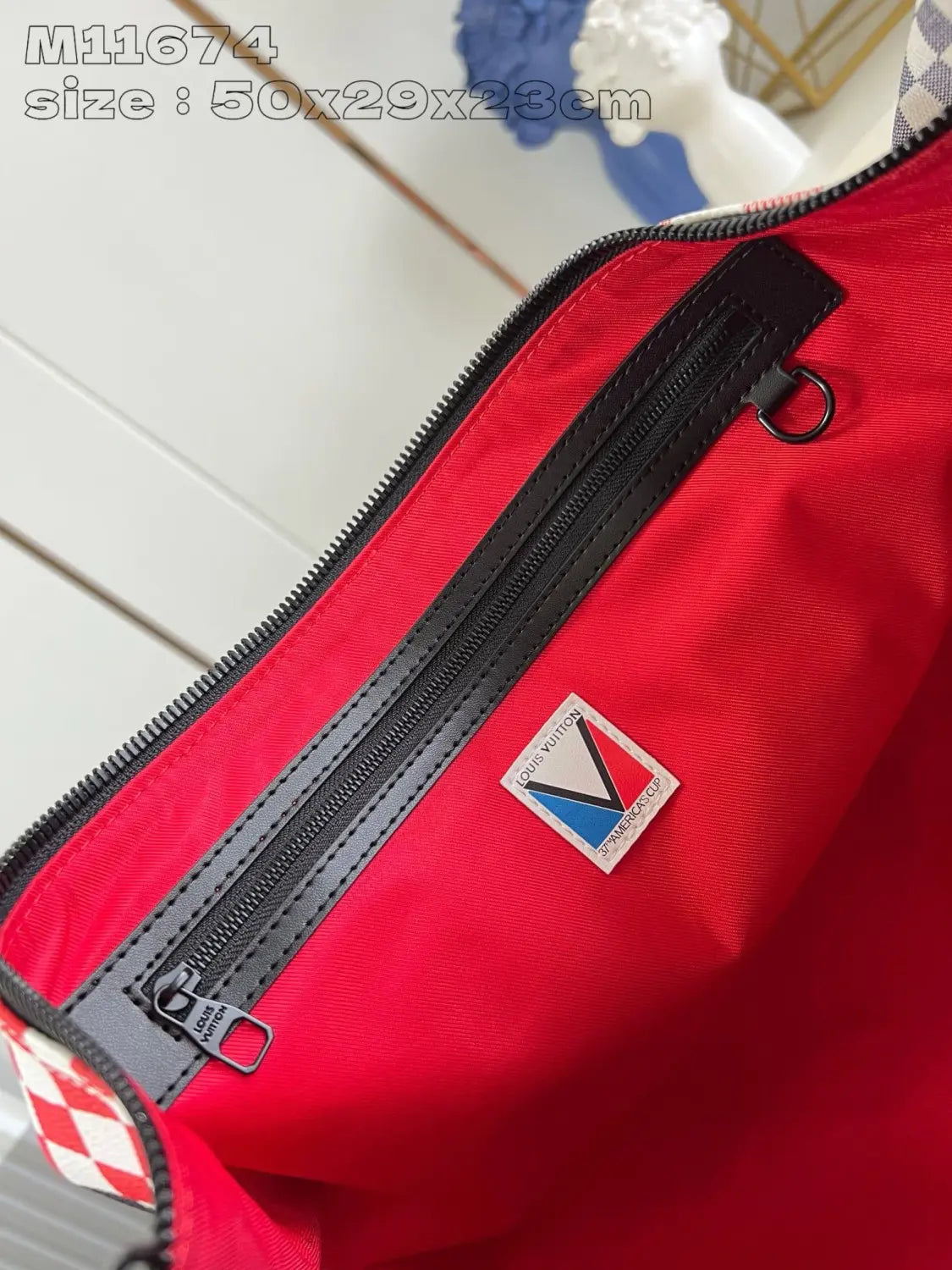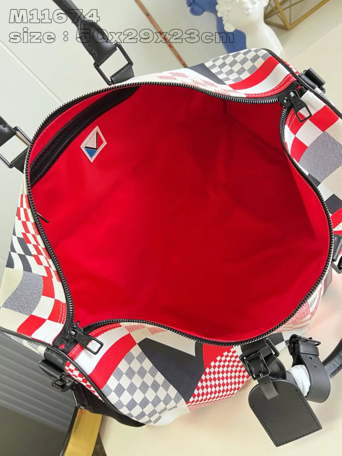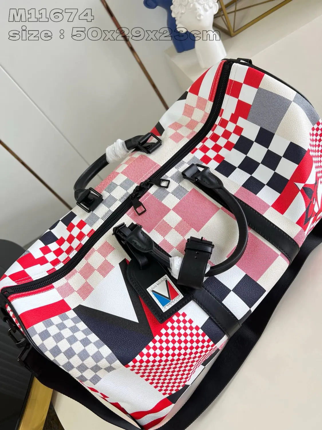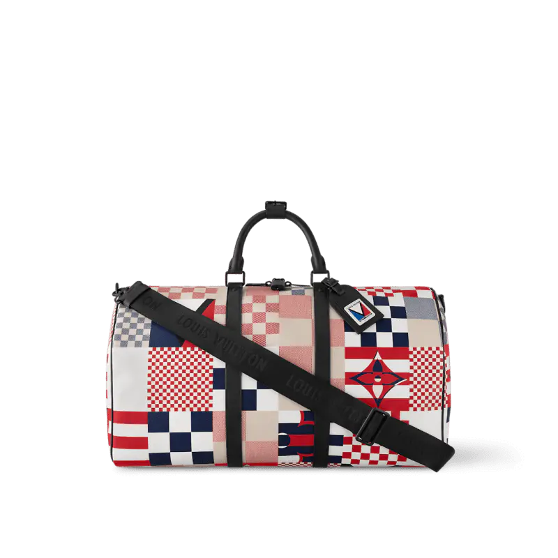 アメリカズカップコレクションの一つである、目を引くキーポル・バンドリエール50バッグは、ダミエ・フラッグス・キャンバスで作られています。ダミエ・フラッグス・プリントは、海事界における旗信号の伝統を想起させます。様々な旗をパッチワークのように捉えたダミエ・パターンは、チェック柄プリントで表現され、スケールと色彩を巧みに操っています。50