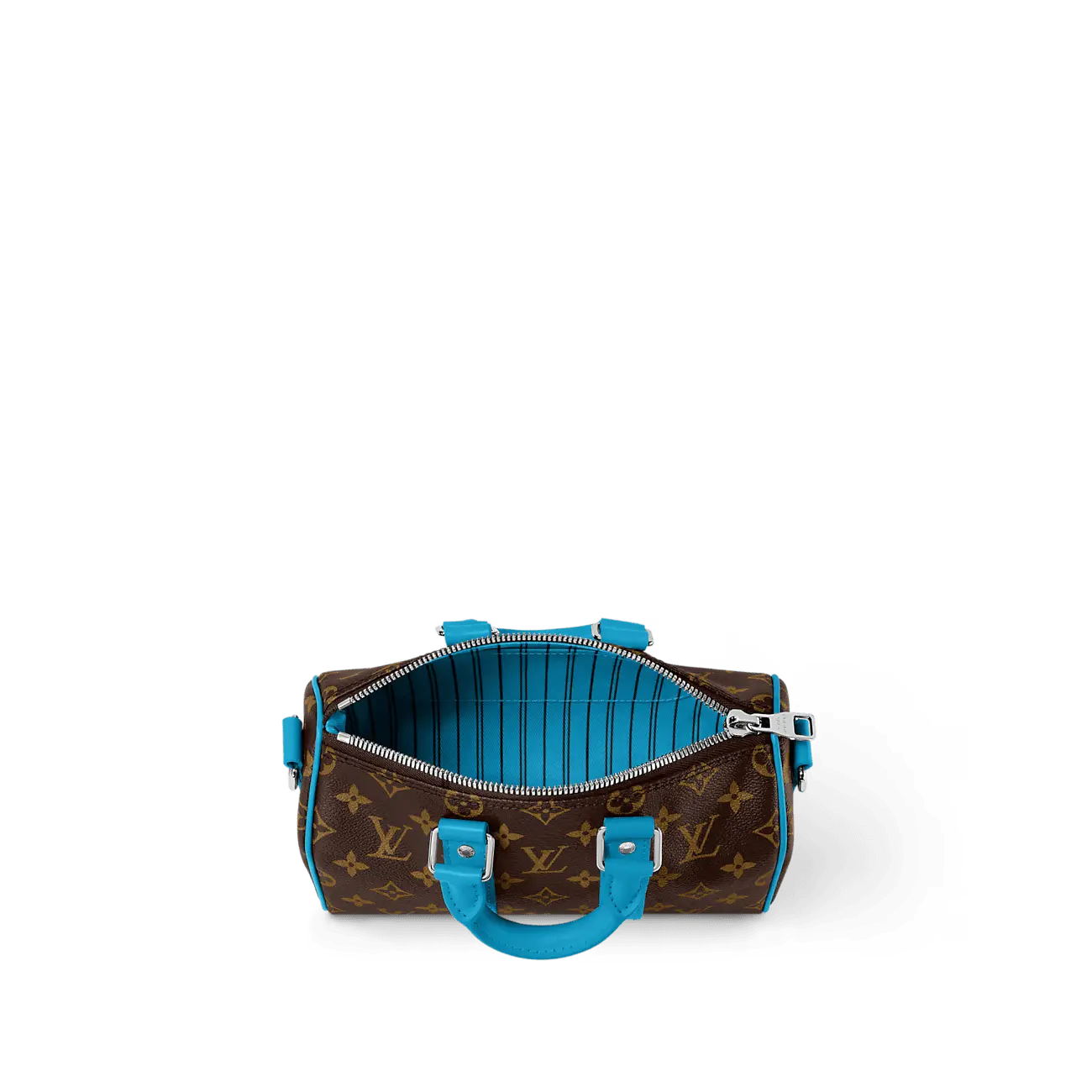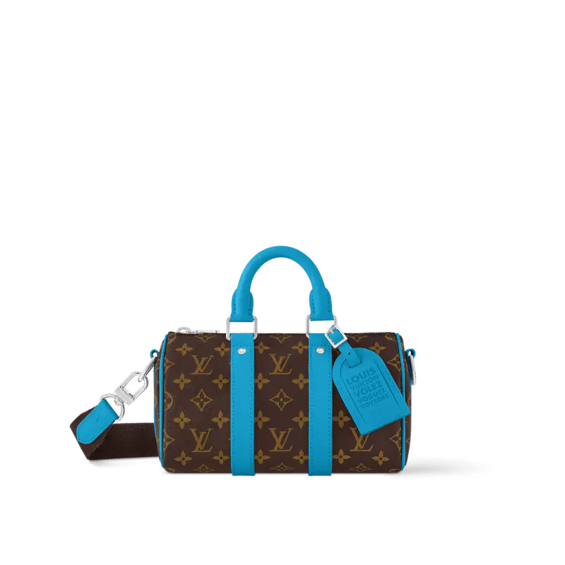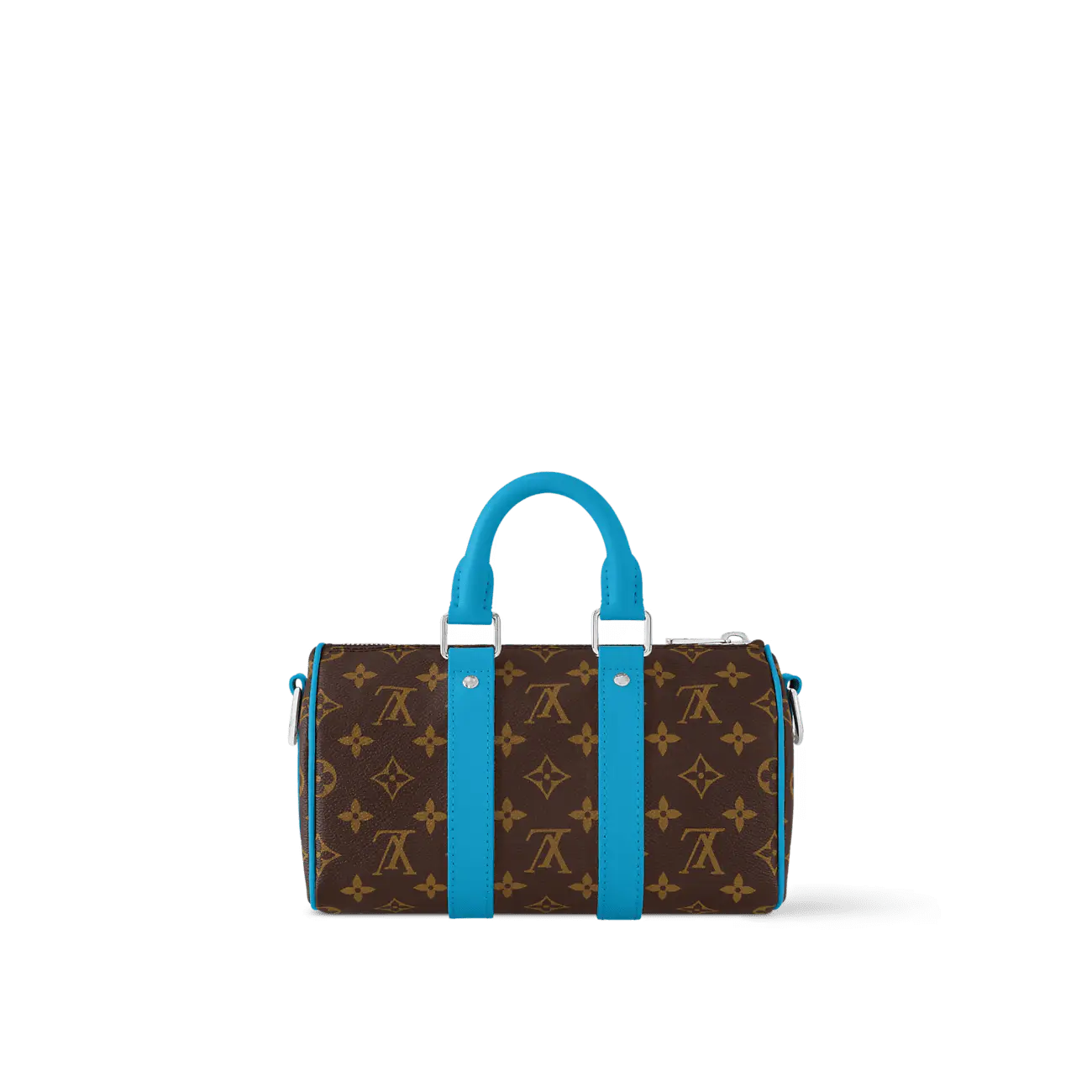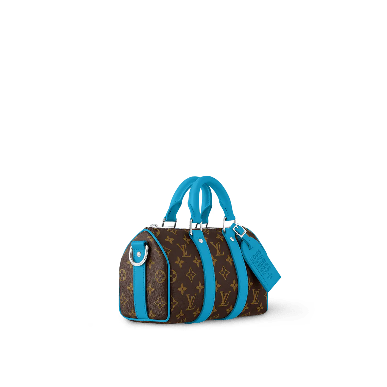キーポル・バンドリエール 25 シティバッグは、LVカラーマニア コレクションの一環として、モノグラム・マカサー キャンバスとカラーレザーで仕立てられています。サイドのバンドとトップハンドルのカラーは、テキスタイルライニングのカラーと調和しています。伝統的なネームタグは、メゾンのヴィンテージシグネチャーである「Volez, Voguez, Voyagez」を用いて再解釈されています。