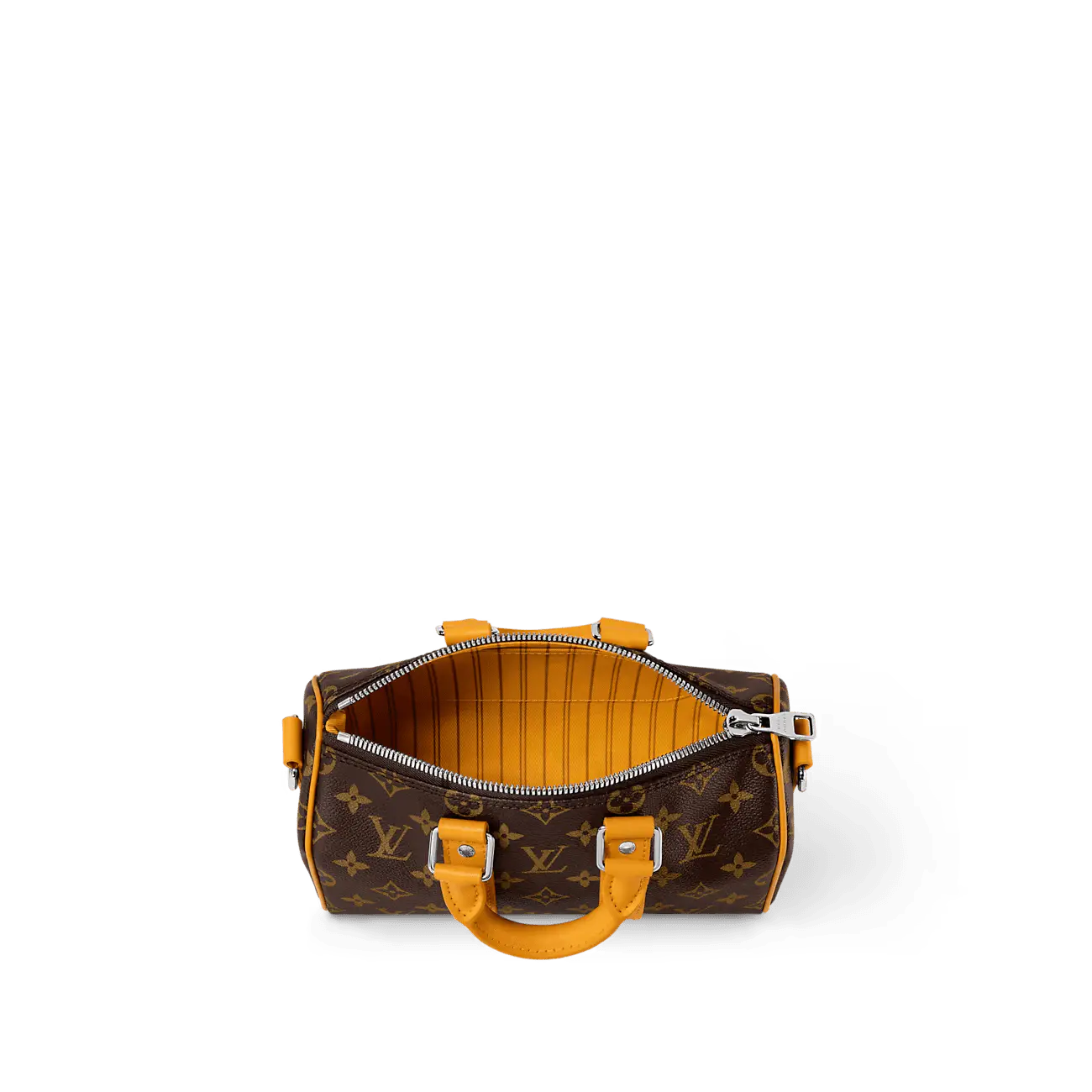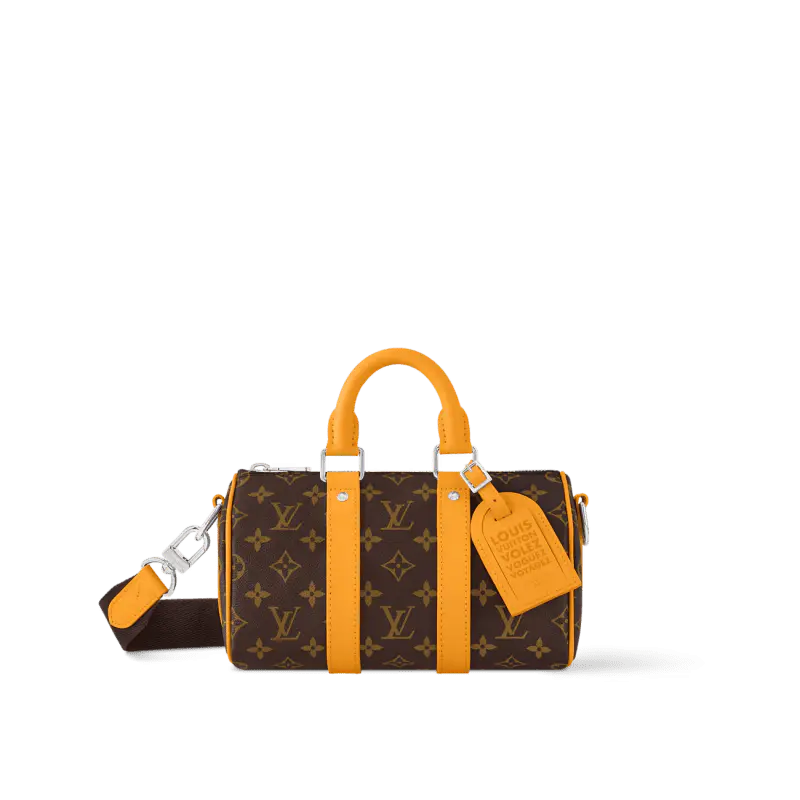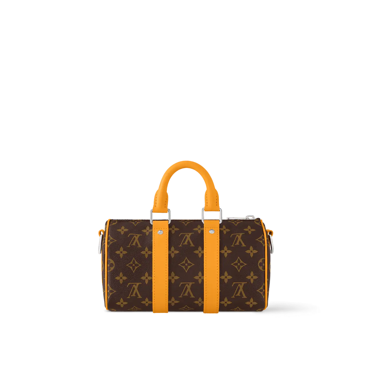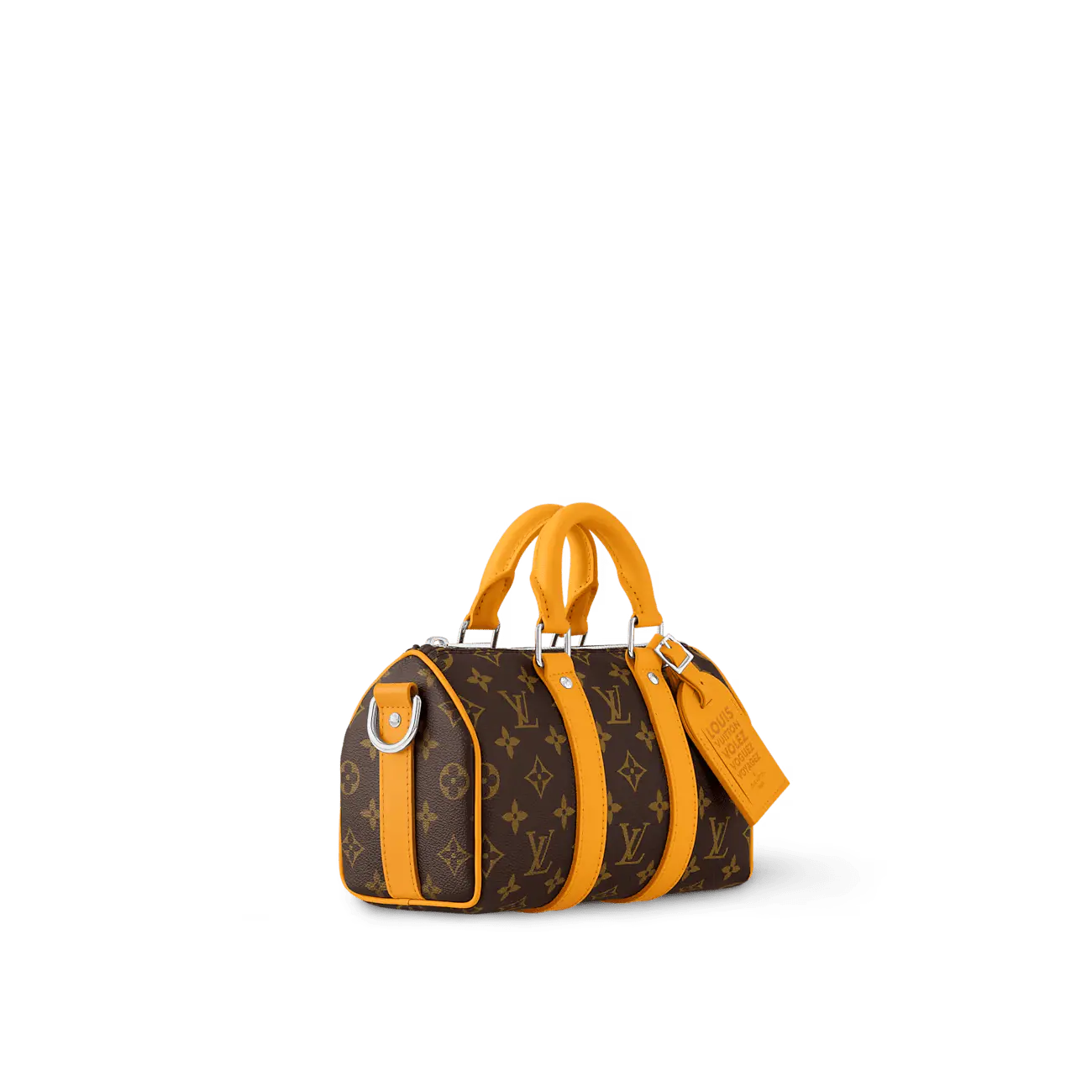 キーポル・バンドリエール 25 シティバッグは、LVカラーマニア コレクションの一環として、モノグラム・マカサー キャンバスとカラーレザーで仕立てられています。サイドのバンドとトップハンドルのカラーは、テキスタイルライニングのカラーと調和しています。伝統的なネームタグは、メゾンのヴィンテージシグネチャーである「Volez, Voguez, Voyagez」を用いて再解釈されています。