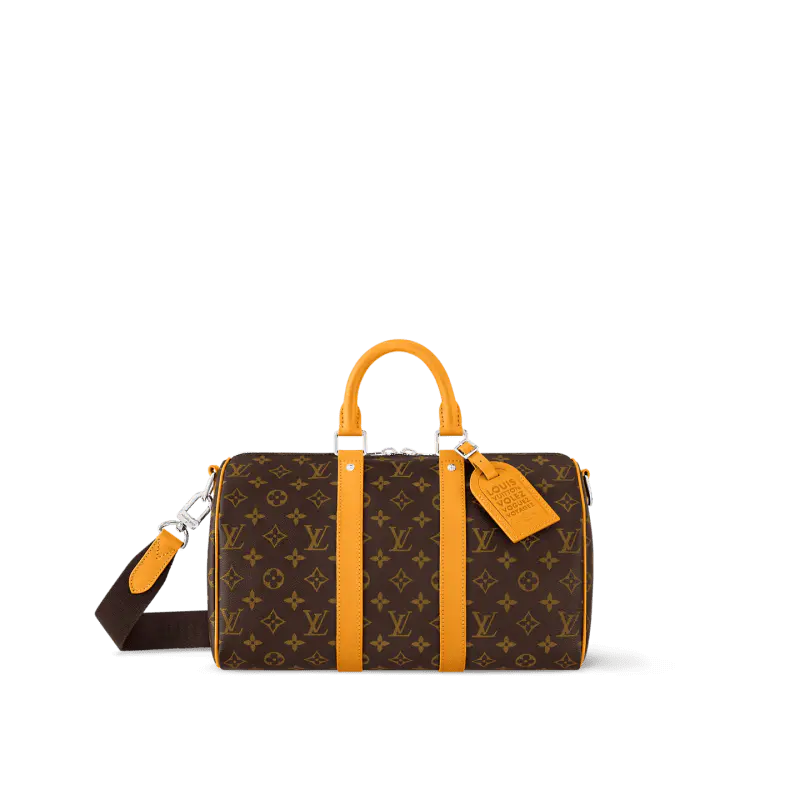 モノグラム・マカサーのコーテッドキャンバスを使用したキーポル・バンドリエール 35は、サイドバンドとトップハンドルにカラーカウハイドレザーを採用。取り外し可能なネームタグも同色のレザー製で、メゾンのヴィンテージシグネチャーである「Volez, Voguez, Voyagez」が刻印されています。内側のライニングもカラートリムと同色です。