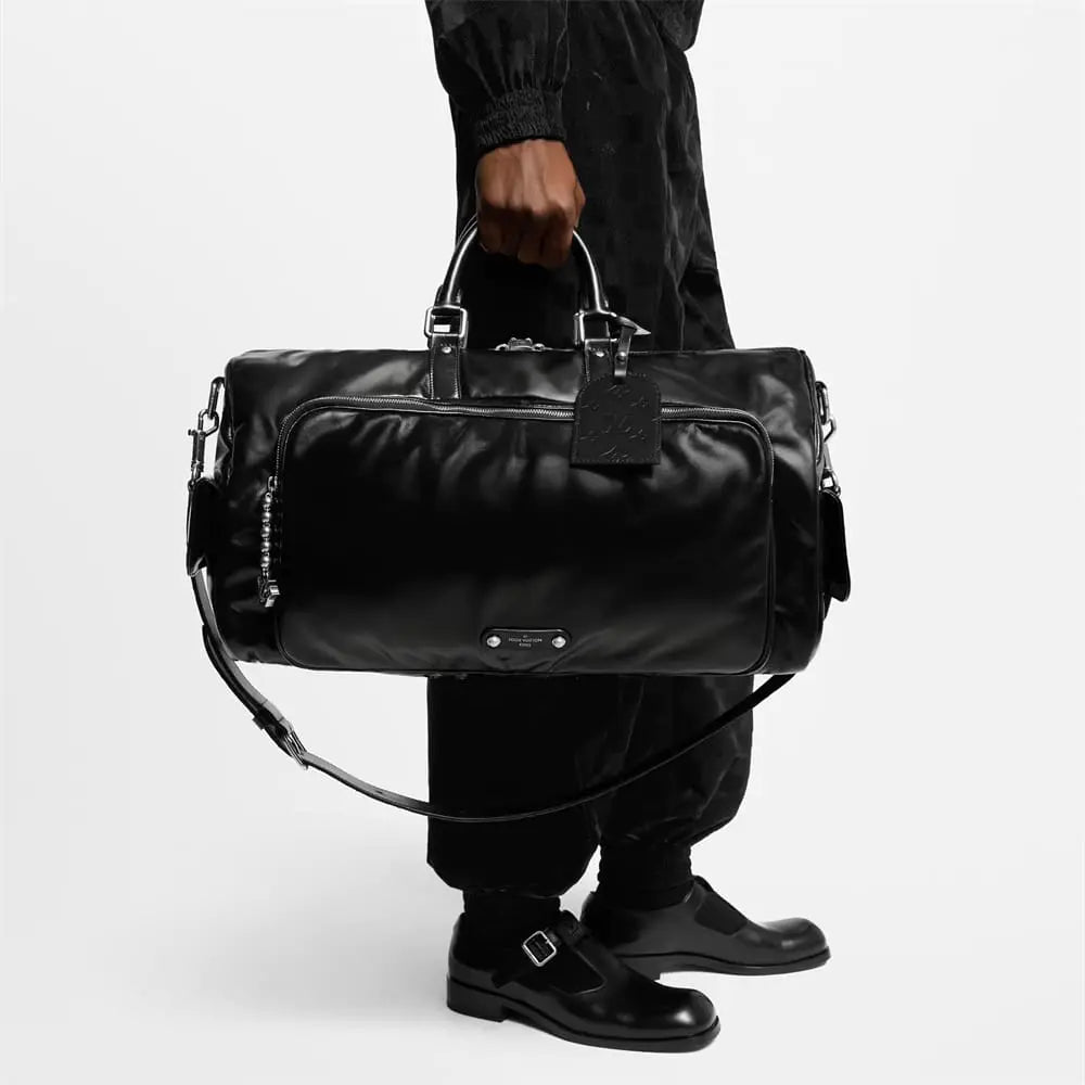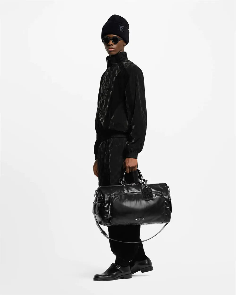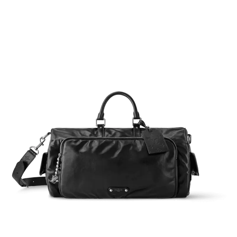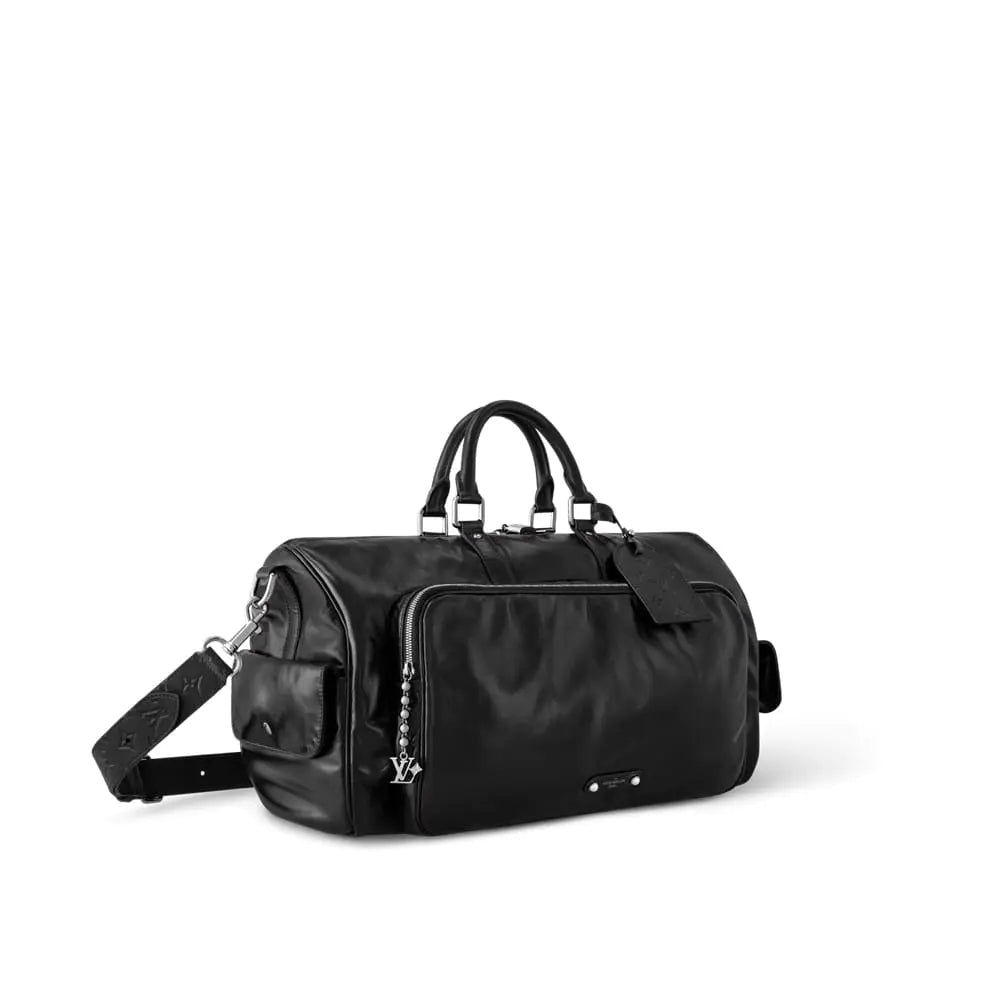 ファレル・ウィリアムズは、深みのあるブラックに身を包んだキーポル・カーゴ・バンドリエール50で、夜の神秘を彷彿とさせます。光沢のあるブラックのカーフスキンを使用し、キーポルのクラシックなラインが光を受けてきらめきます。外側のジップポケットのジッププルにあしらわれたLVイニシャルチャームなど、シルバートーンの金具がレザーの輝きを完璧に引き立てます。