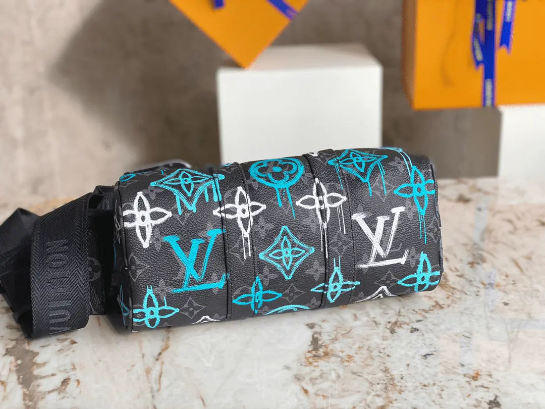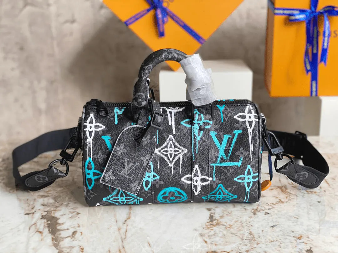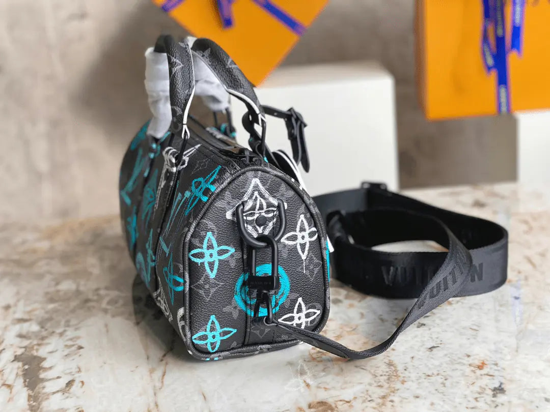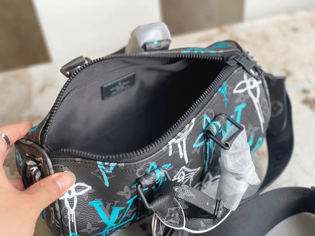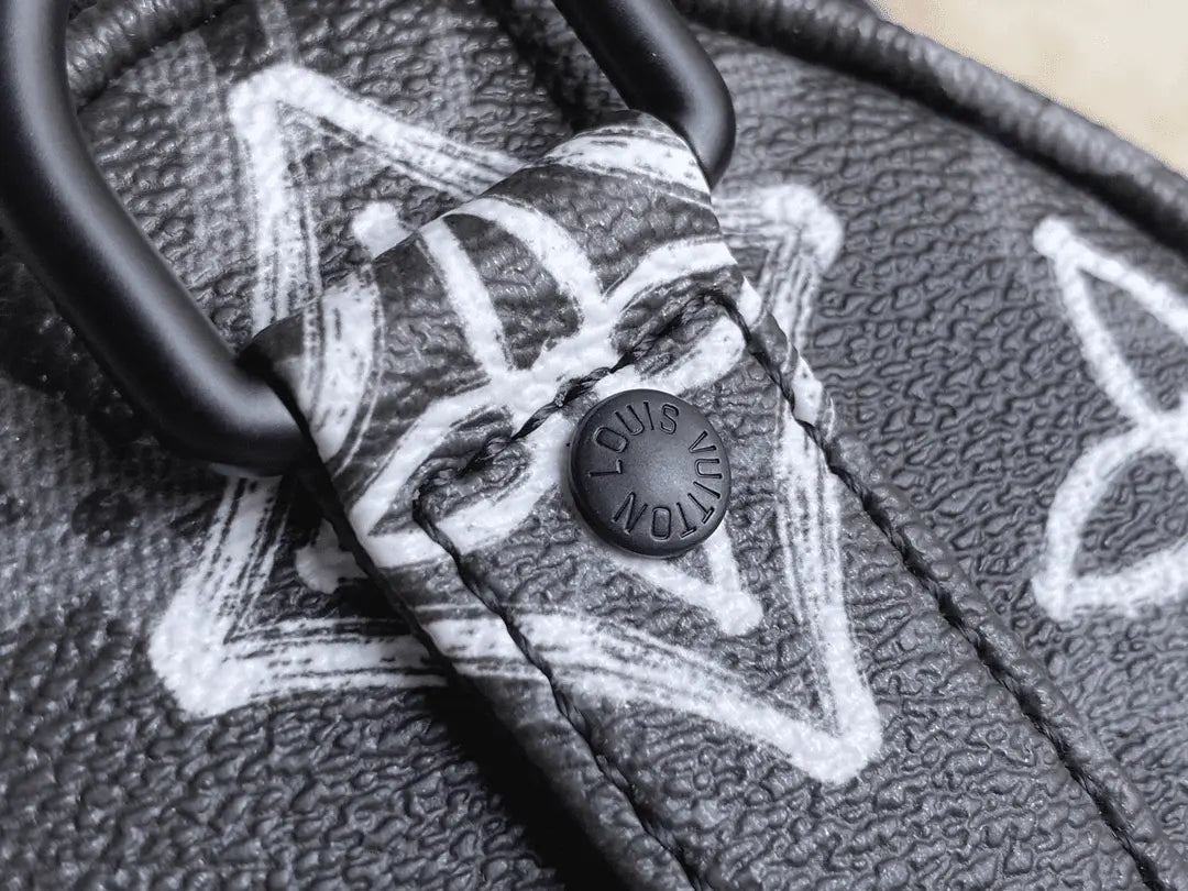 M21399 プリントピローバッグ スピーディシリーズ このキーポル バンドリエール 25 ハンドバッグは、モノグラム・エクリプス キャンバスを使用し、スプレーペイントで描かれたモノグラム柄がストリートアートの雰囲気を醸し出しています。コンパクトなデザインは都会的な機動性を備え、サイドストラップとレザーネームプレートはキーポル トラベルバッグの特徴的な要素です。サイズ:25 x 15 x 11 cm (縦 x 横 x 高さ)