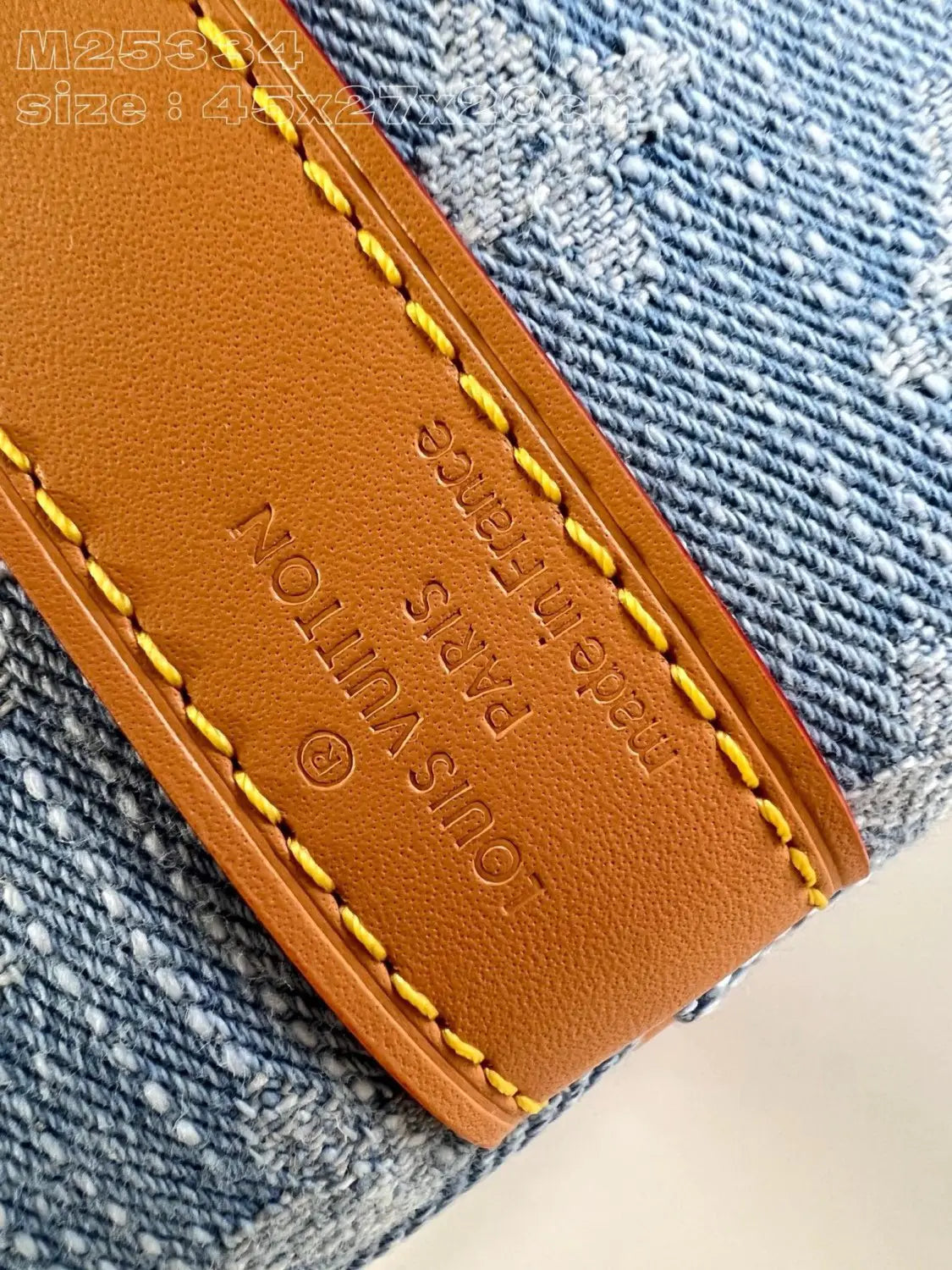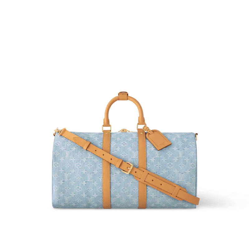 モノグラムデニムが、キーポル・バンドリエール 45に夏のスピリットを吹き込みます。季節感のあるライトブルーのバッグは、100%オーガニックコットン製で、モノグラム柄を織り込んでいます。ストーンウォッシュ加工が施され、一つ一つが個性的なデザインです。サイドの補強バンドと取り外し可能なショルダーストラップには、カウハイドレザーのトリムが施され、デニムの質感を引き立てます。
