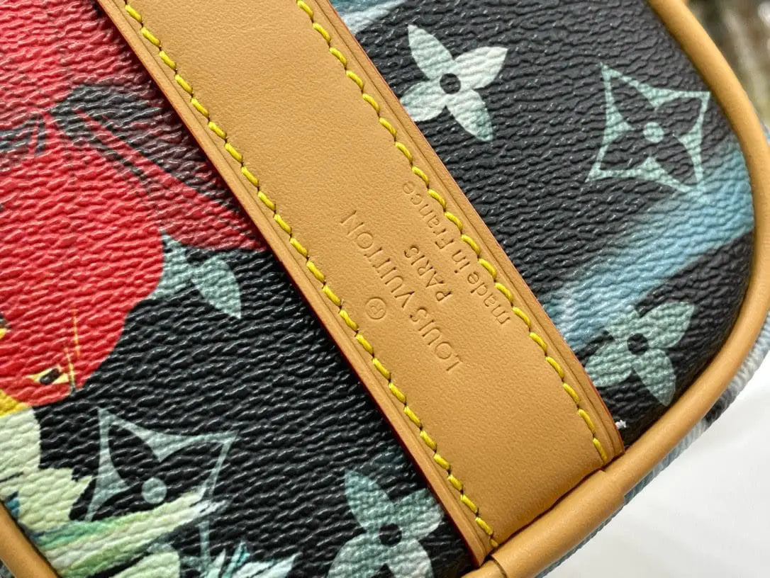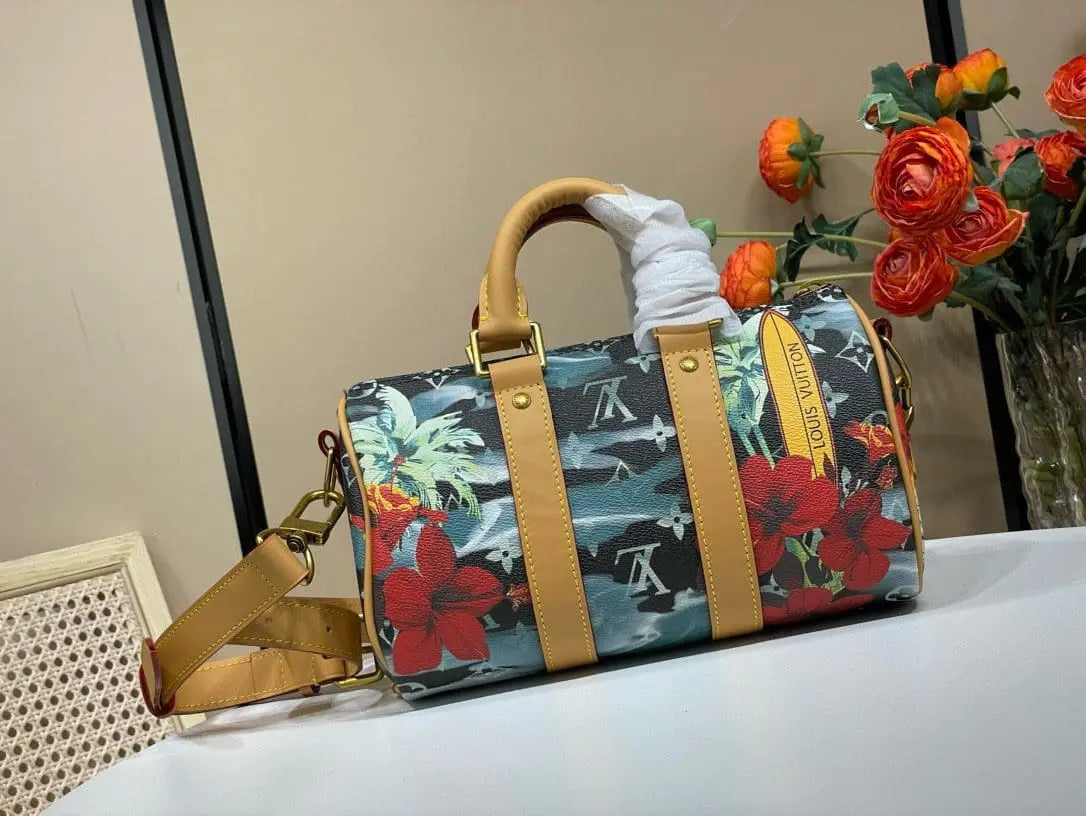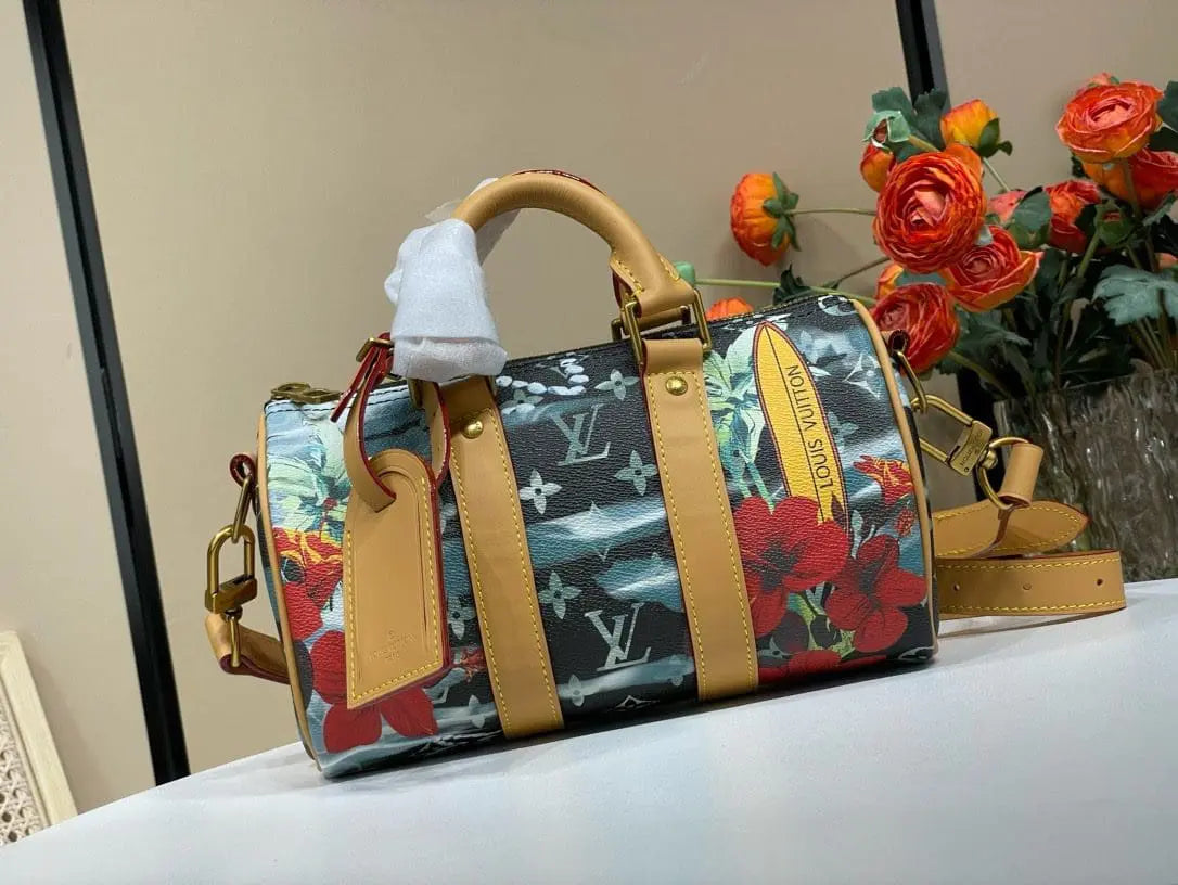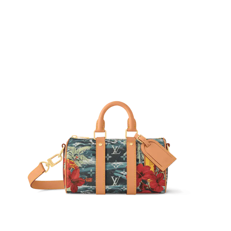 キーポル・バンドリエール 25は、ルイ・ヴィトンの有名なキーポル・トラベルバッグの小型版です。ファレル・ウィリアムスのモノグラム・サーフィン・キャンバスを使用し、様々な夏らしいモチーフを組み合わせた精巧なプリントが特徴です。バッグのデザインとトロピカルプリントが、このシティバッグにヴィンテージ感を与えています。取り外し可能なストラップと2つのロールドレザートップハンドルが、様々な持ち方を可能にします。