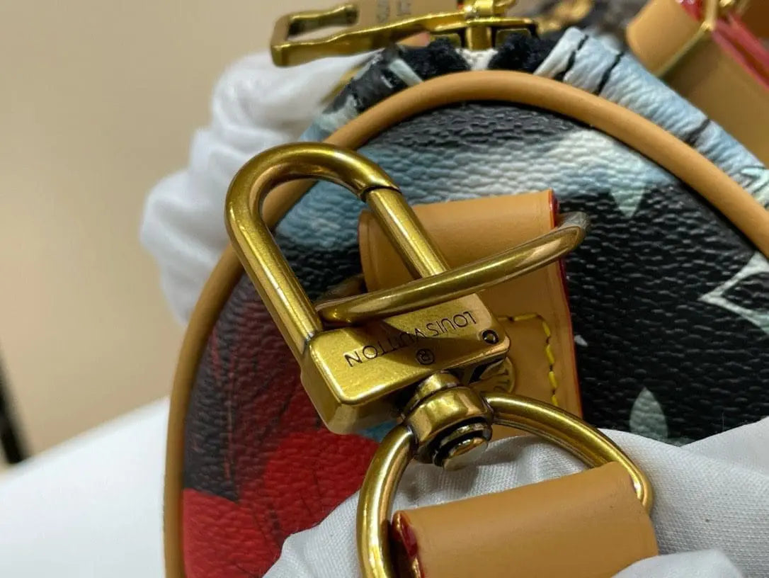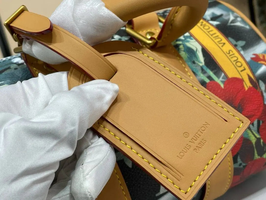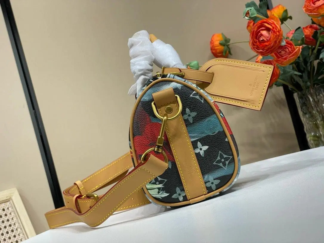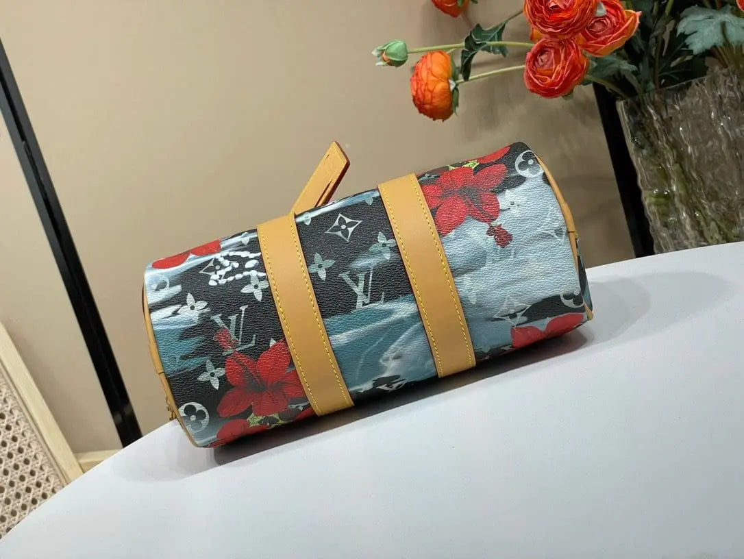 キーポル・バンドリエール 25は、ルイ・ヴィトンの有名なキーポル・トラベルバッグの小型版です。ファレル・ウィリアムスのモノグラム・サーフィン・キャンバスを使用し、様々な夏らしいモチーフを組み合わせた精巧なプリントが特徴です。バッグのデザインとトロピカルプリントが、このシティバッグにヴィンテージ感を与えています。取り外し可能なストラップと2つのロールドレザートップハンドルが、様々な持ち方を可能にします。
