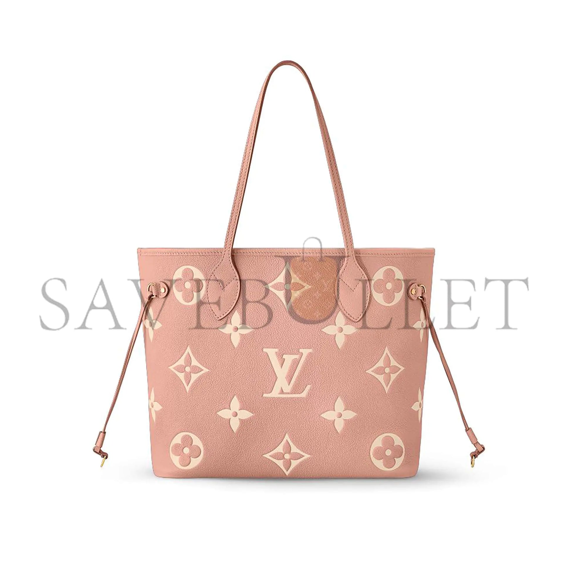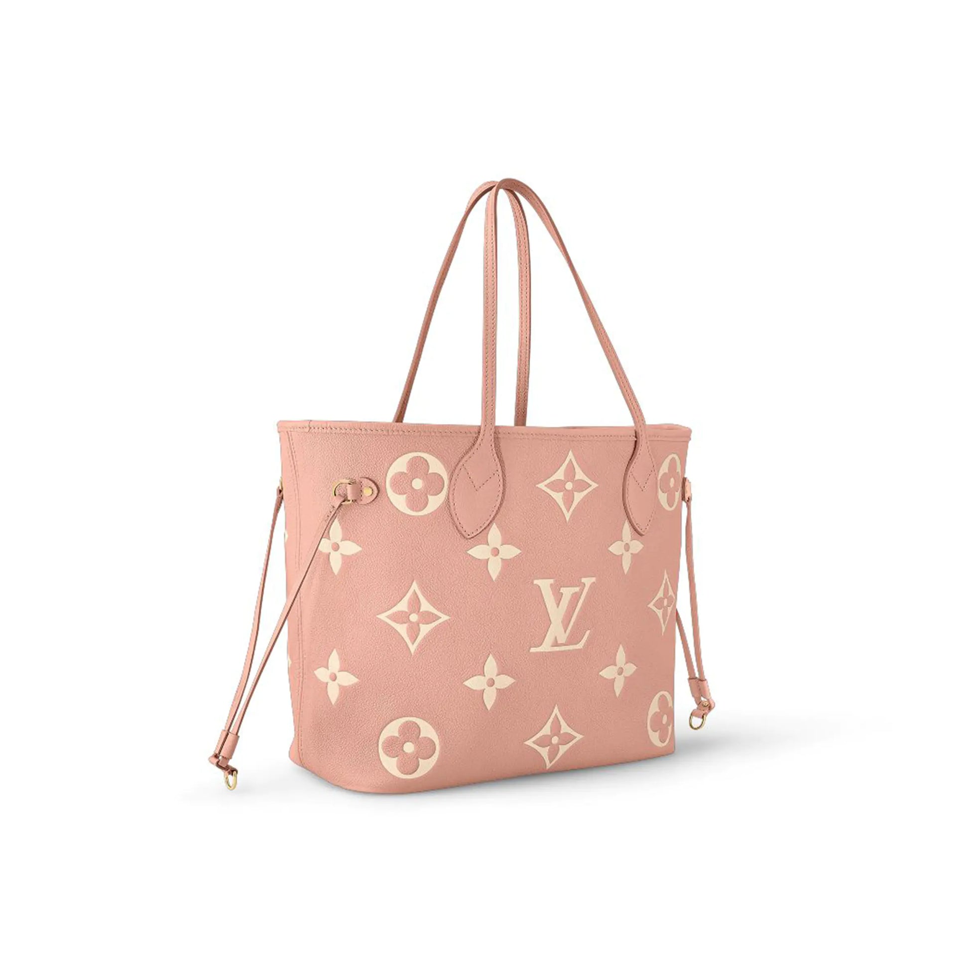 ネヴァーフルMMトートバッグは、クリームカラーのモノグラム・ブロッサムとLVロゴをピンク地にあしらった、エンボス加工のモノグラム・アンプラントレザーを使用しています。サイドのレースは、締めればすっきりとしたシルエットに、緩めればカジュアルな印象になり、中身へのアクセスも容易です。用途の広いバッグです。