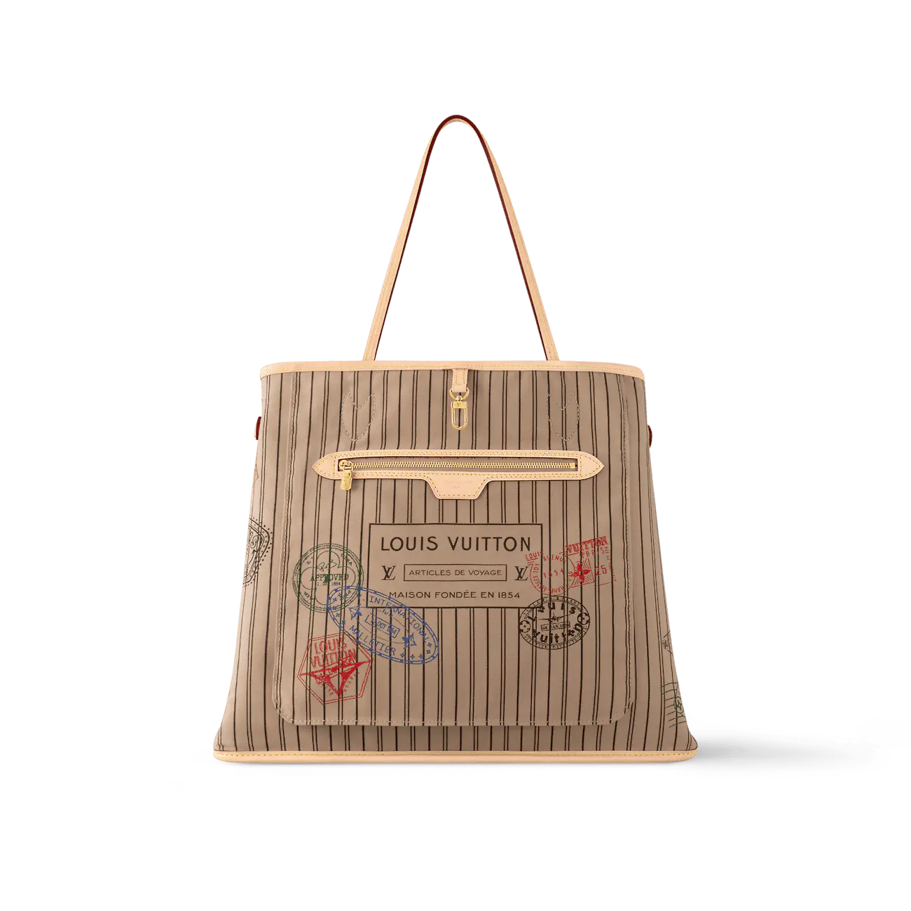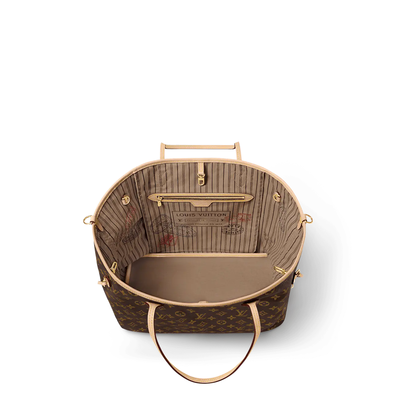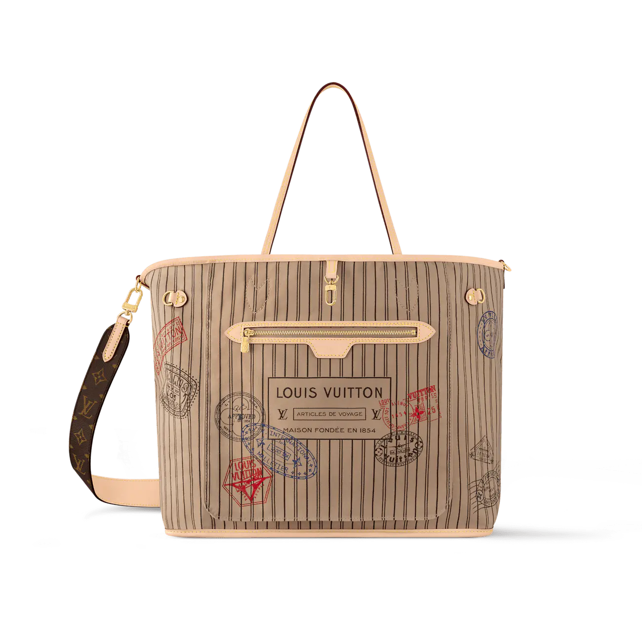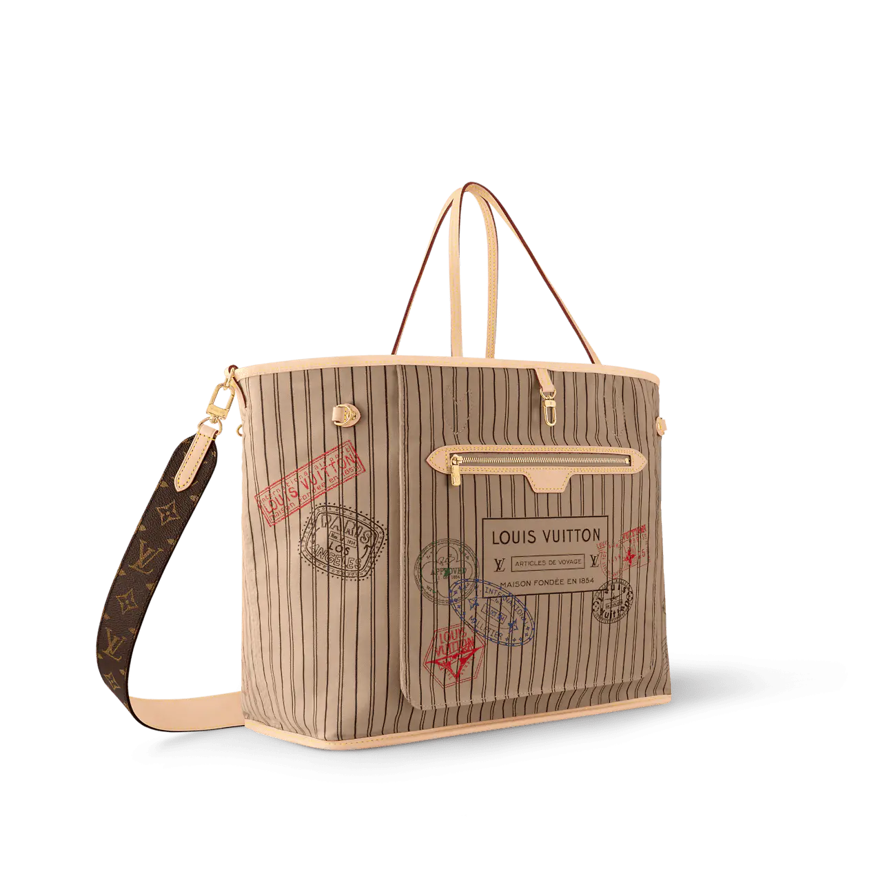 アイコニックなネヴァーフル・ハンドバッグが、今シーズンに向けて新たなリバーシブルデザインで生まれ変わりました。ゴールドトーンの金具が輝くこのネヴァーフル・バンドリエール・インサイド・アウトGMは、シグネチャーのモノグラム・キャンバスを使用し、裏面にはカラフルなスタンプパターンがあしらわれています。汎用性の高いこのモデルは、サイドフックでホーボースタイルにもアレンジできます。取り外し可能なストラップでショルダーバッグとしてもお使いいただけます。