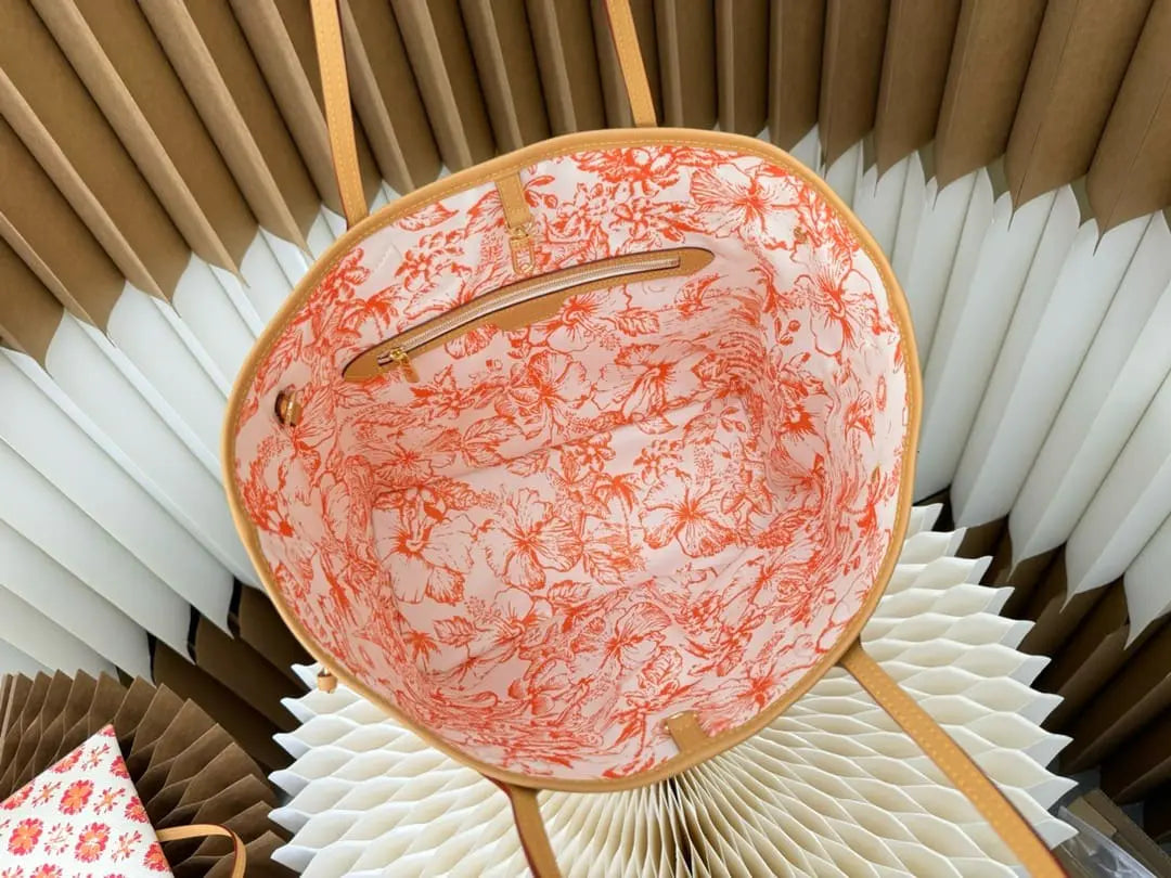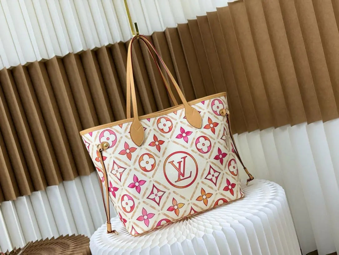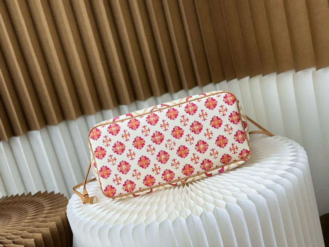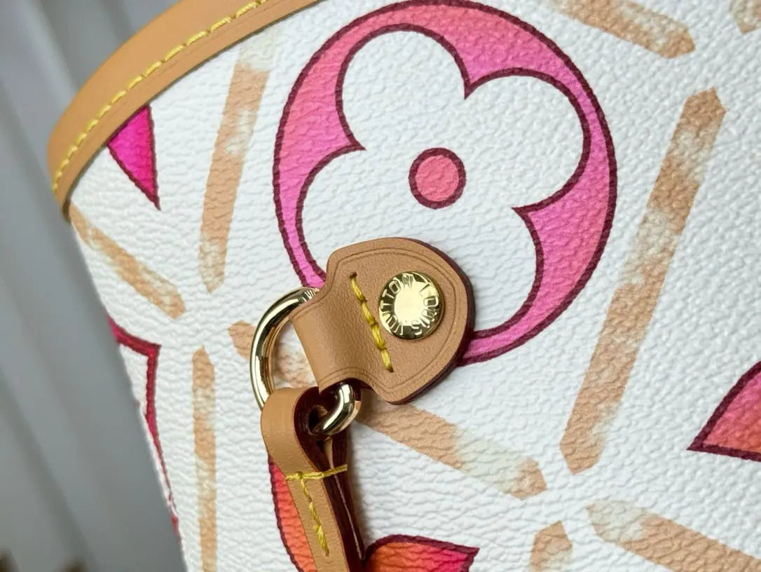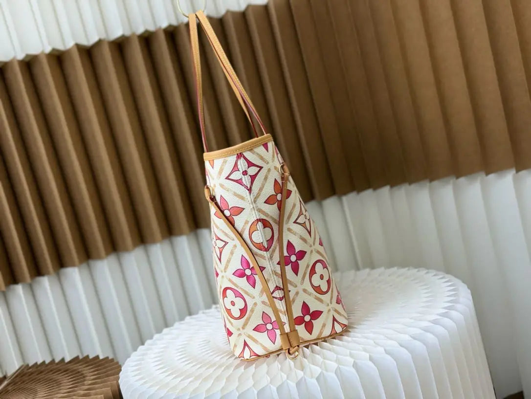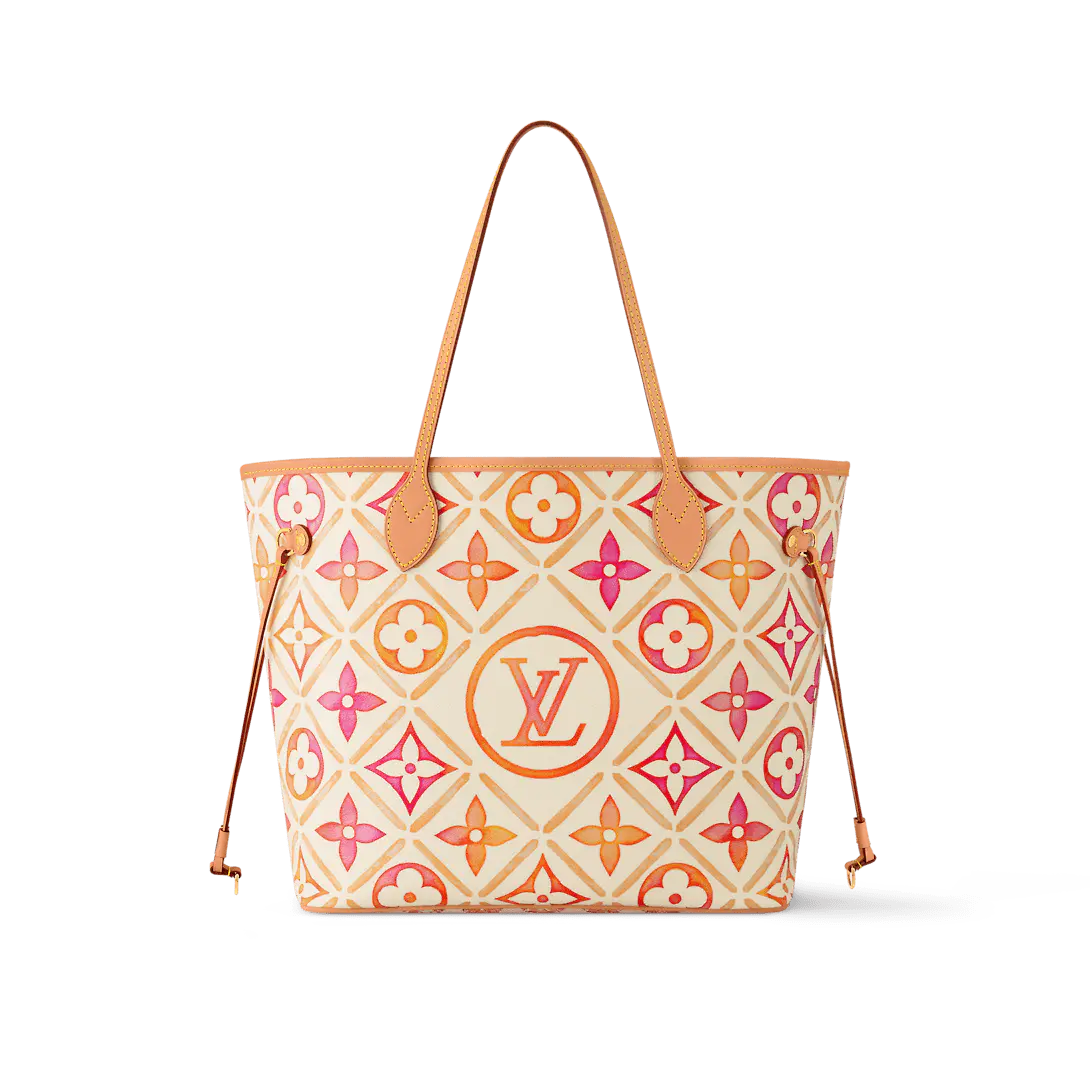 ネヴァーフルMMトートは、モノグラム・タイル・キャンバスを使用し、バッグ上部とハンドルにはレザートリムが施されています。水彩画のようなモノグラム・パターンに、中央にLVサークルがあしらわれています。取り外して単体でも使用できる、同系色のプリントが施されたジップ付きポーチが付属しています。