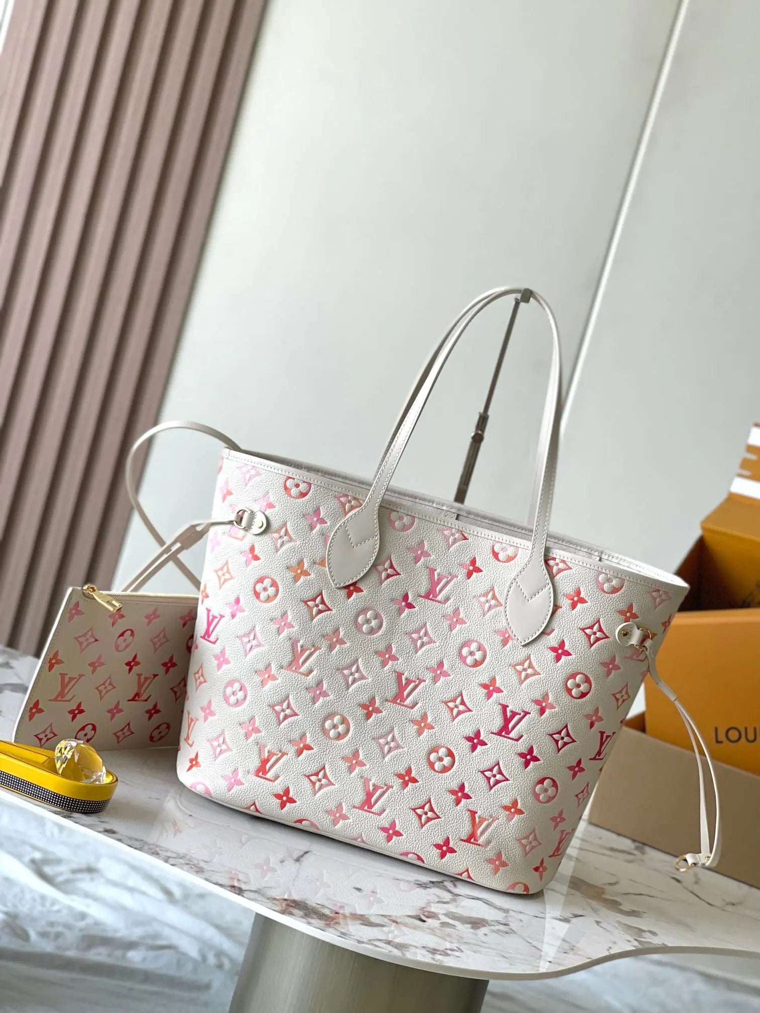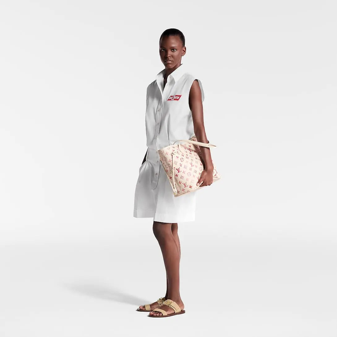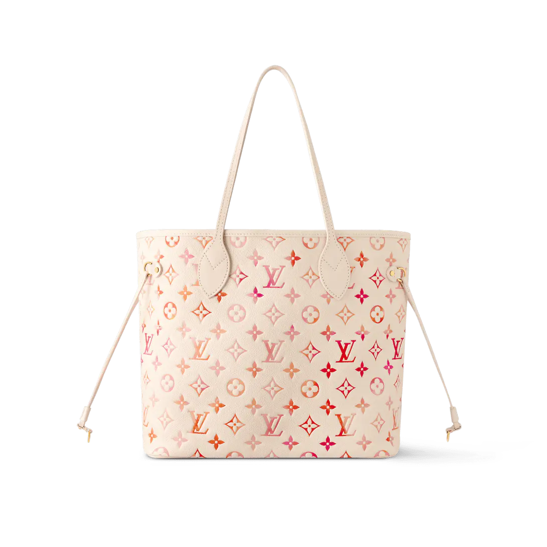 このネヴァーフルMMトートバッグは、モノグラム・アンプラント サンライズ アクアレルレザーを使用しています。モノグラムのエンボス加工の上に、オレンジ、ピンク、フューシャのグラデーションプリントを施した独特の質感が、喜びに満ちた雰囲気を醸し出します。質感を高めるため、表面にはほんのりとした光沢感のあるスクリーンプリントが施され、朝露のようにきらめきます。