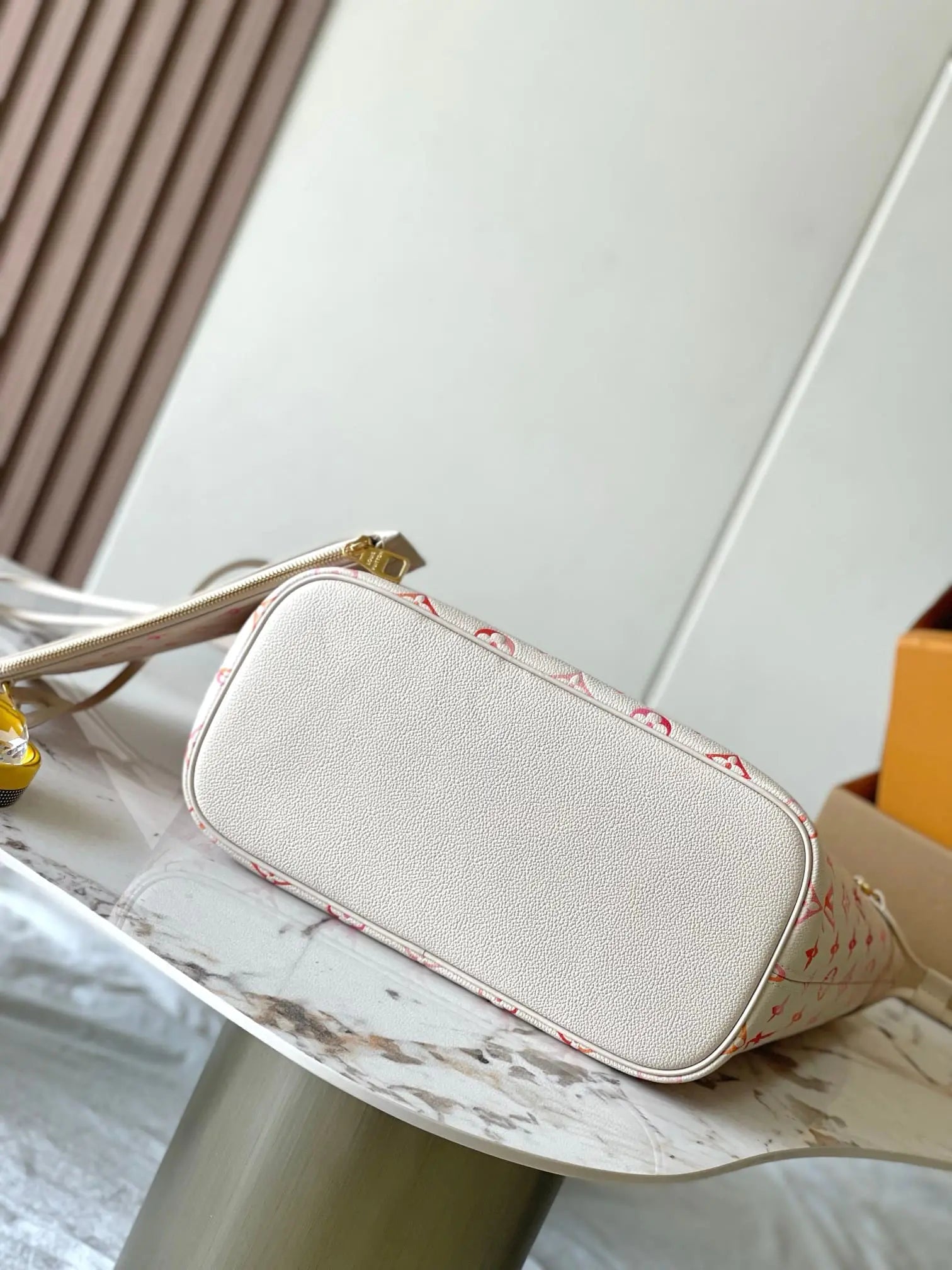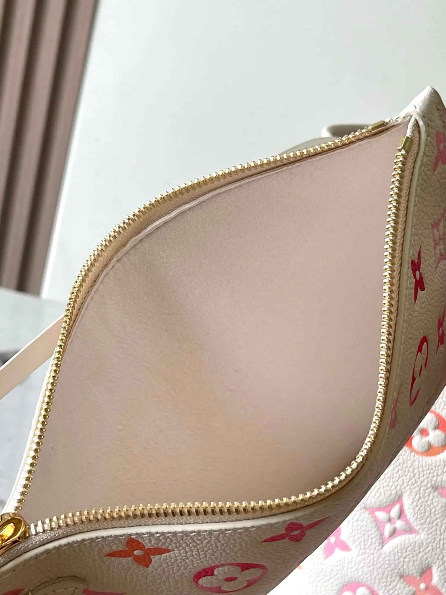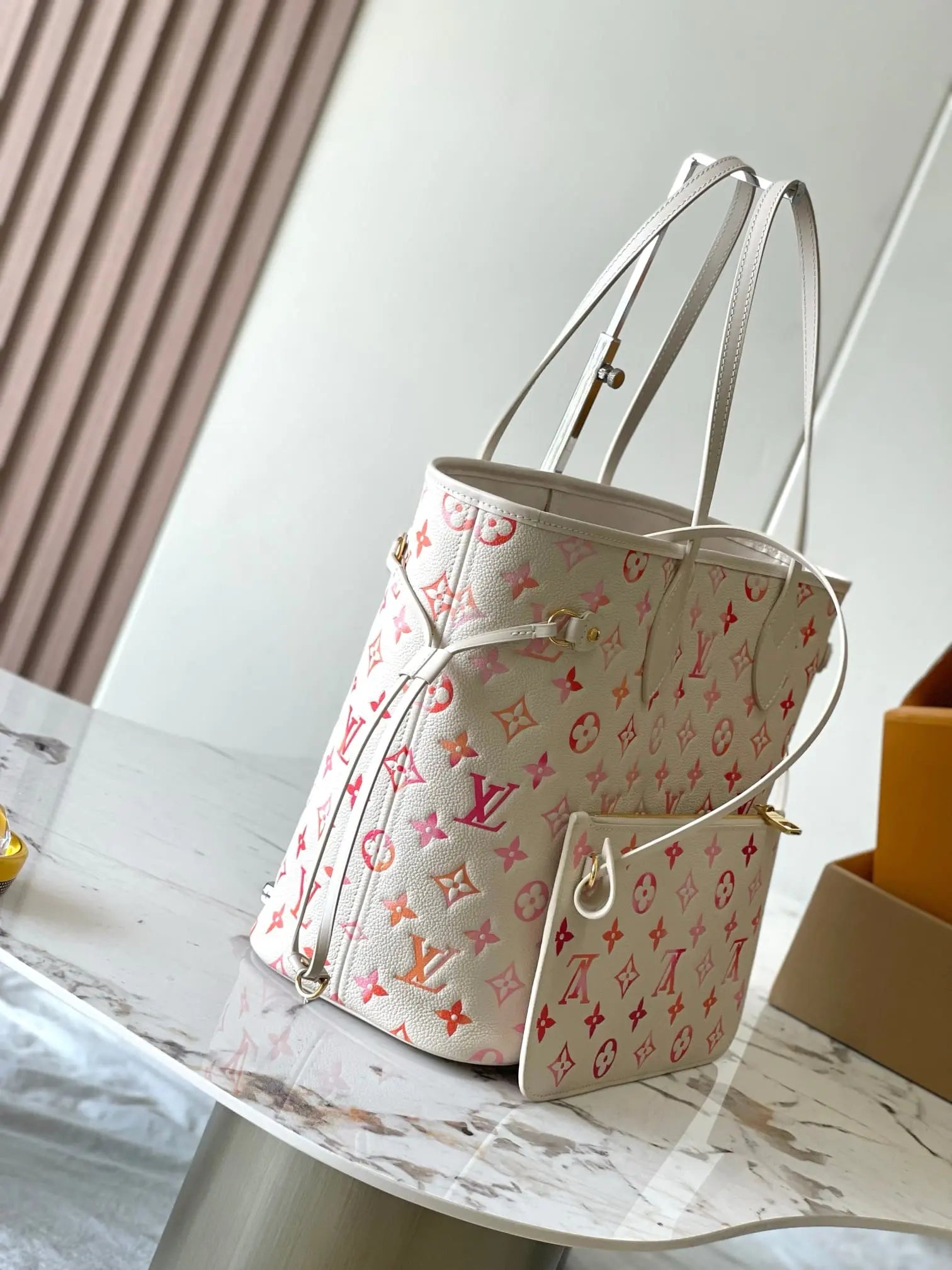 このネヴァーフルMMトートバッグは、モノグラム・アンプラント サンライズ アクアレルレザーを使用しています。モノグラムのエンボス加工の上に、オレンジ、ピンク、フューシャのグラデーションプリントを施した独特の質感が、喜びに満ちた雰囲気を醸し出します。質感を高めるため、表面にはほんのりとした光沢感のあるスクリーンプリントが施され、朝露のようにきらめきます。