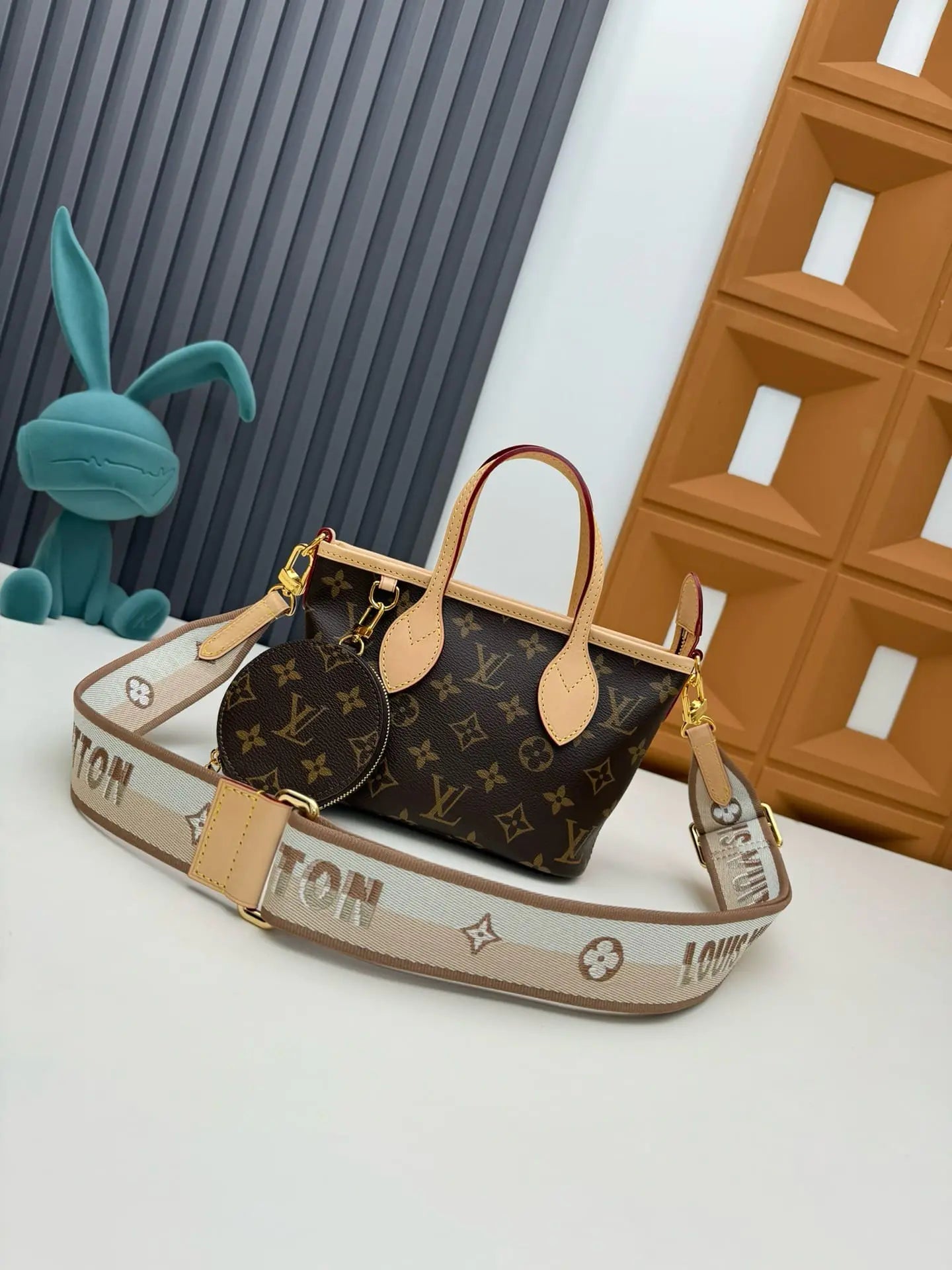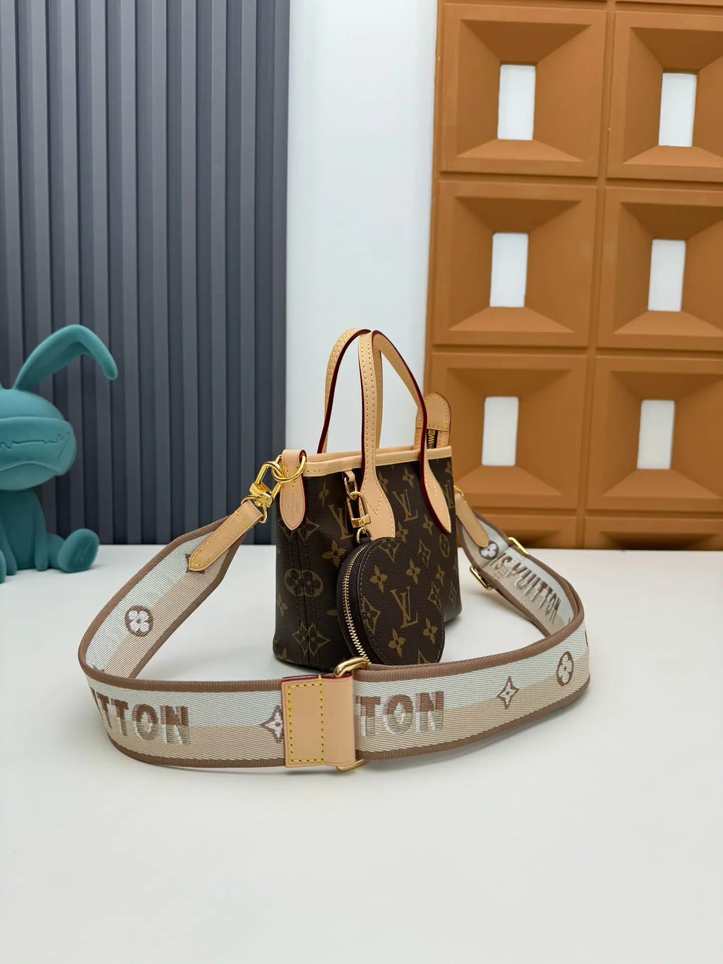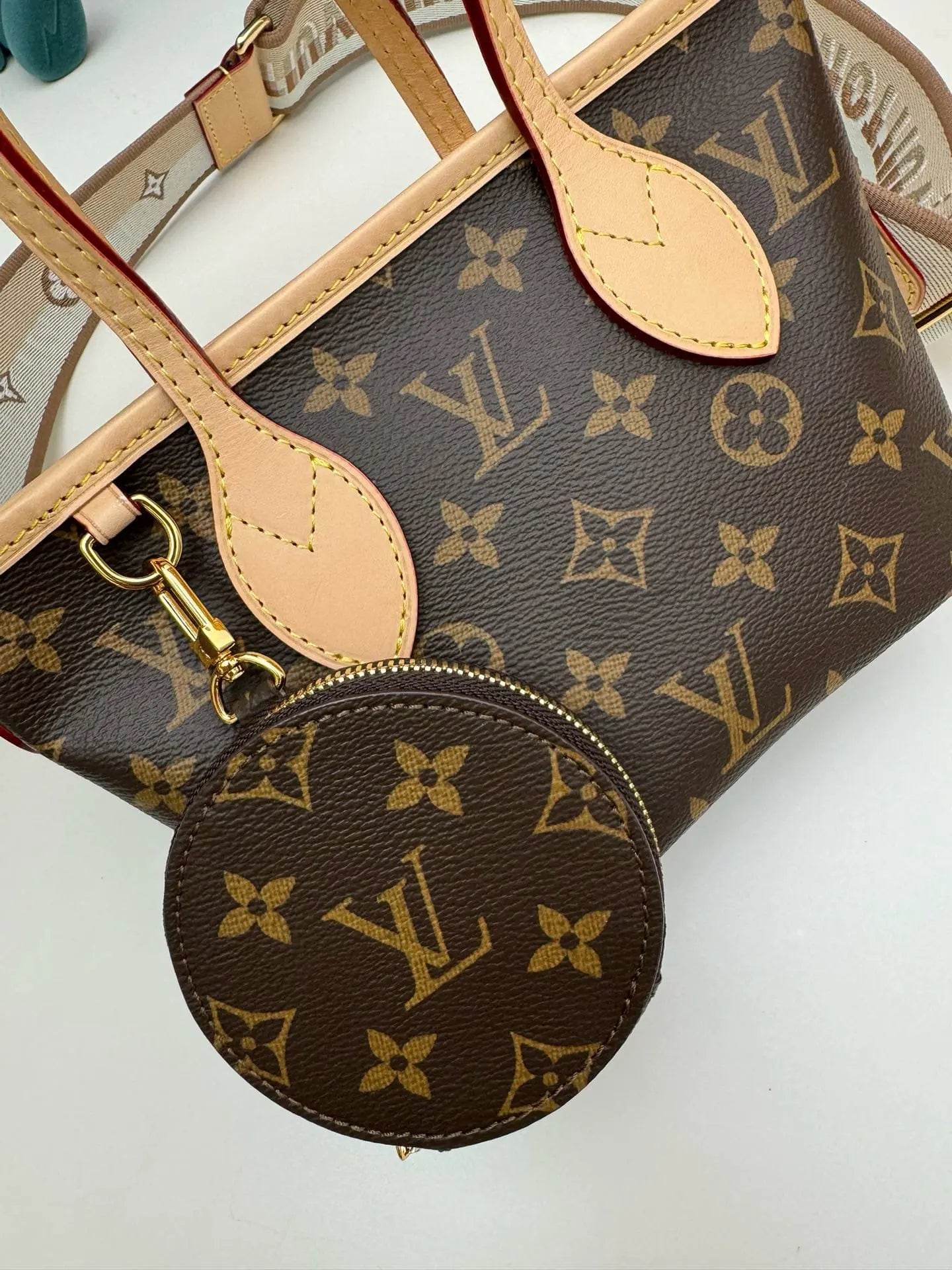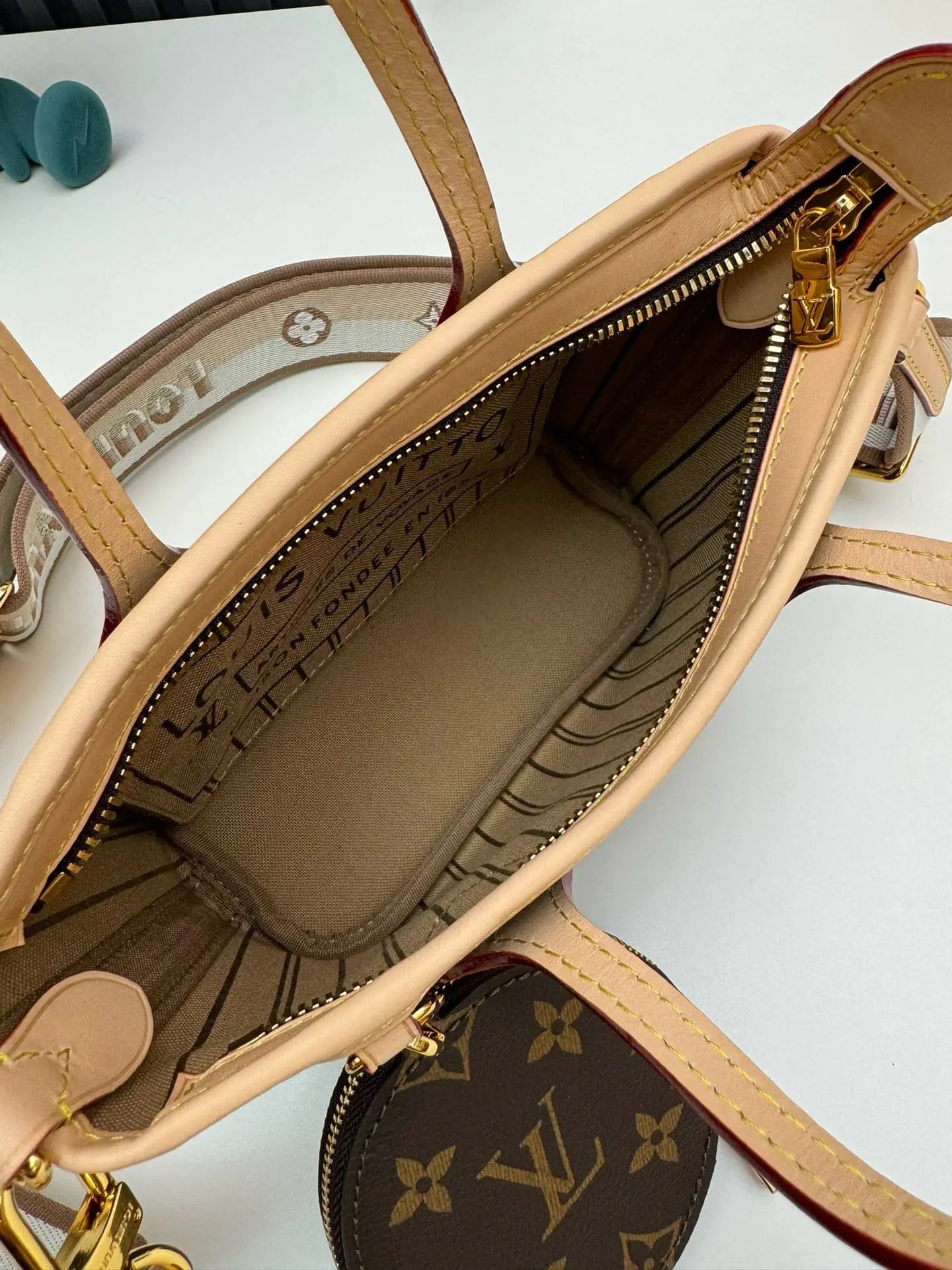 今シーズン、メゾンの永遠の人気アイテム「ネヴァーフル」がミニトートバッグとして生まれ変わります。「ネヴァーフル BB」ハンドバッグです。このミニバージョンは、調節・取り外し可能なテキスタイルストラップと、Dリングに取り付けられた遊び心のあるコインケースが特徴です。スマートフォンやコンパクトな財布など、ちょっとした必需品を収納するのにちょうど良いサイズです。