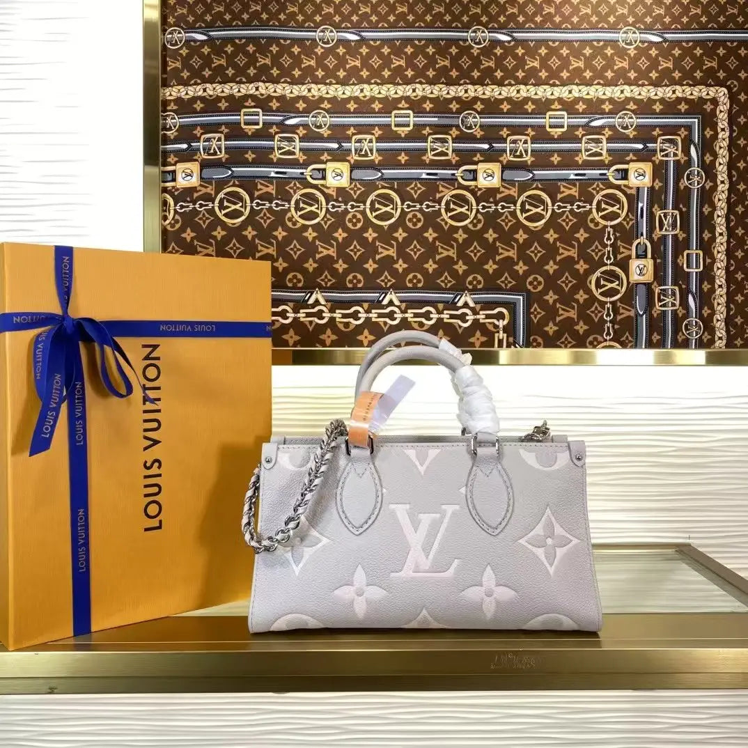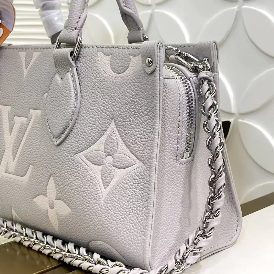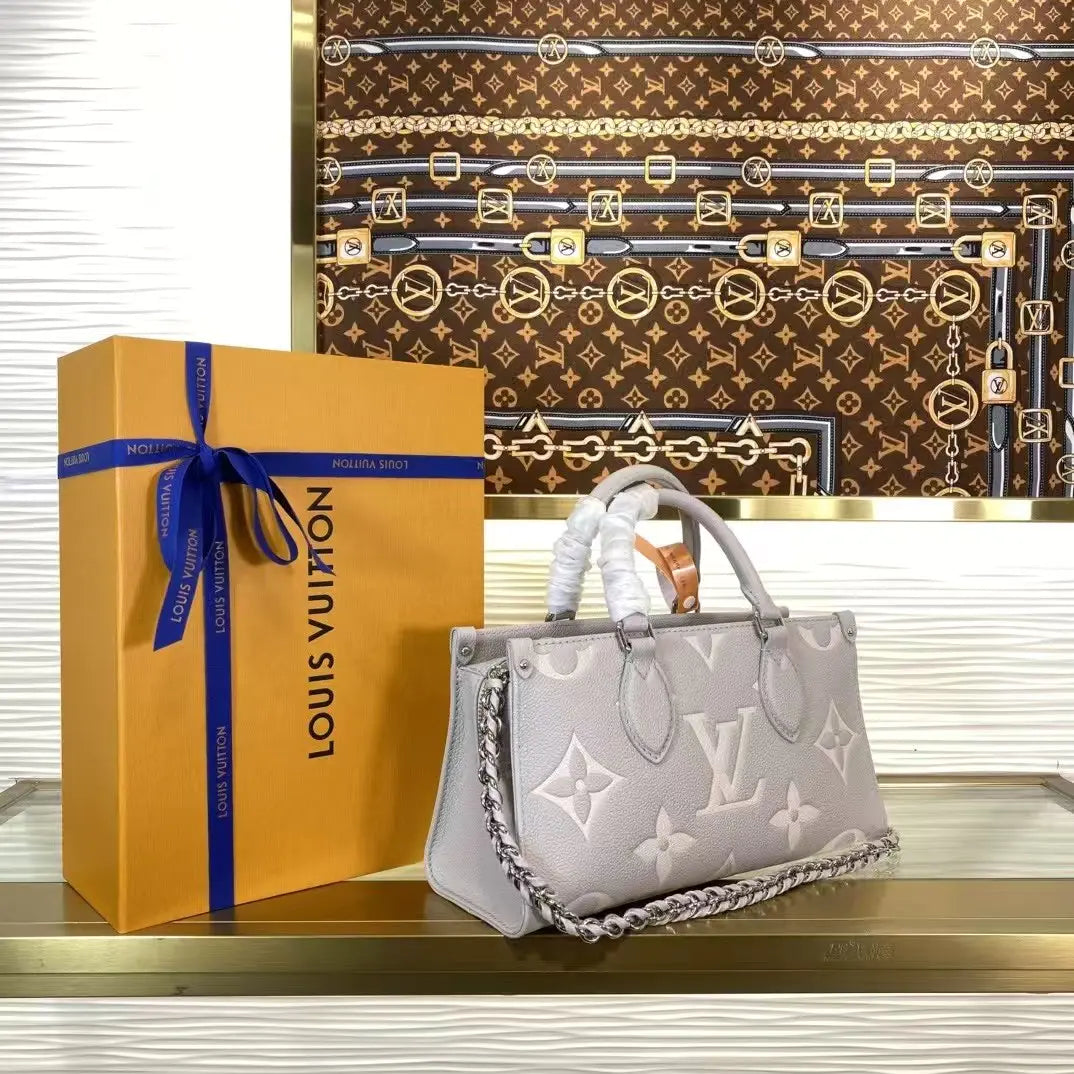 美しいプロポーションのイーストウエストシルエットで表現された「OnTheGo イーストウエスト トート」が登場。モノグラム・アンプラント レザーに、同系色のジャイアントモノグラムモチーフをエンボス加工したコンパクトなモデルは、毎日の必需品を整理整頓できる内部空間を誇ります。2つの可動式トップハンドルと、取り外し可能なチェーンとレザーのストラップにより、様々な持ち方に対応します。