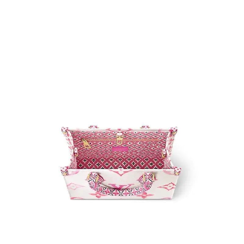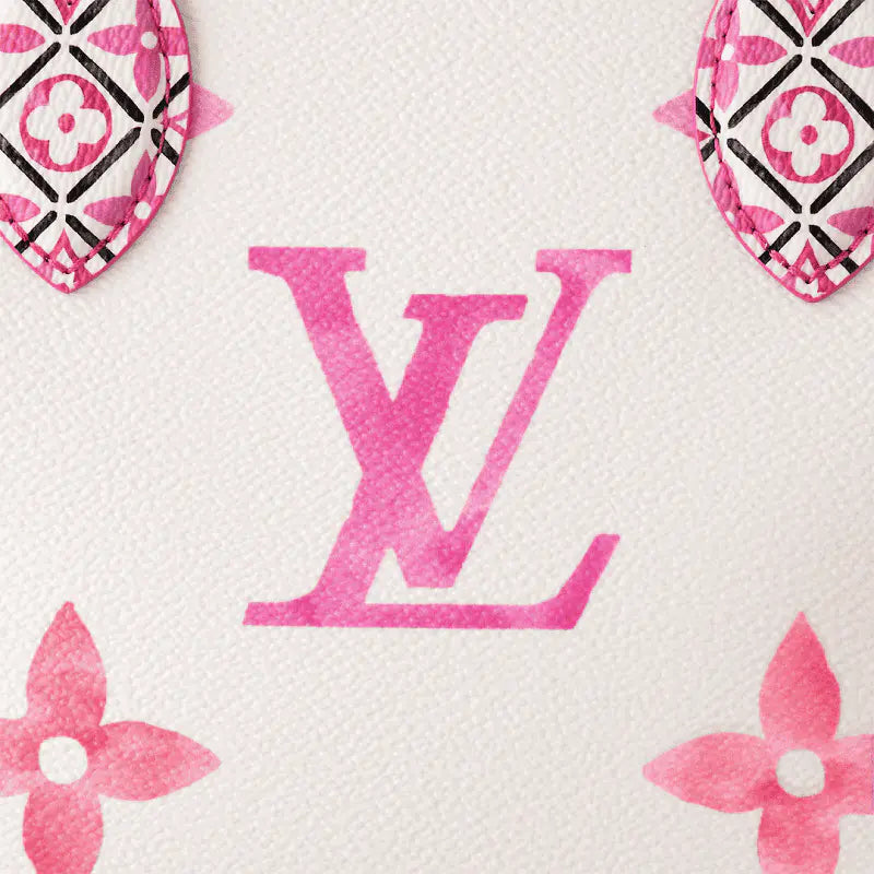 OnTheGo PMは、クリームカラーのキャンバス地にパステルカラーのジャイアントモノグラムパターンを施したハンドバッグサイズのトートバッグです。ポルトガルの伝統的なアズレージョ陶器にインスパイアされた、モノグラムフラワーのモチーフをあしらったトリムとトップハンドルが、このパターンと調和しています。取り外し・調節可能なストラップは肩掛けも可能です。