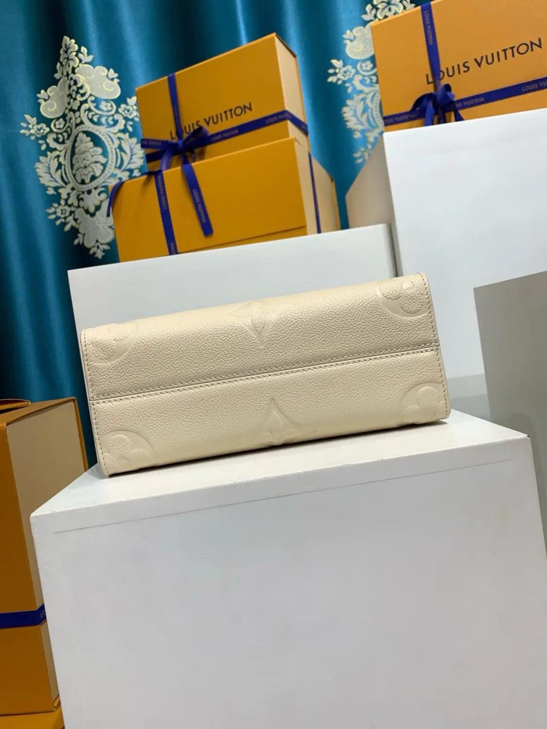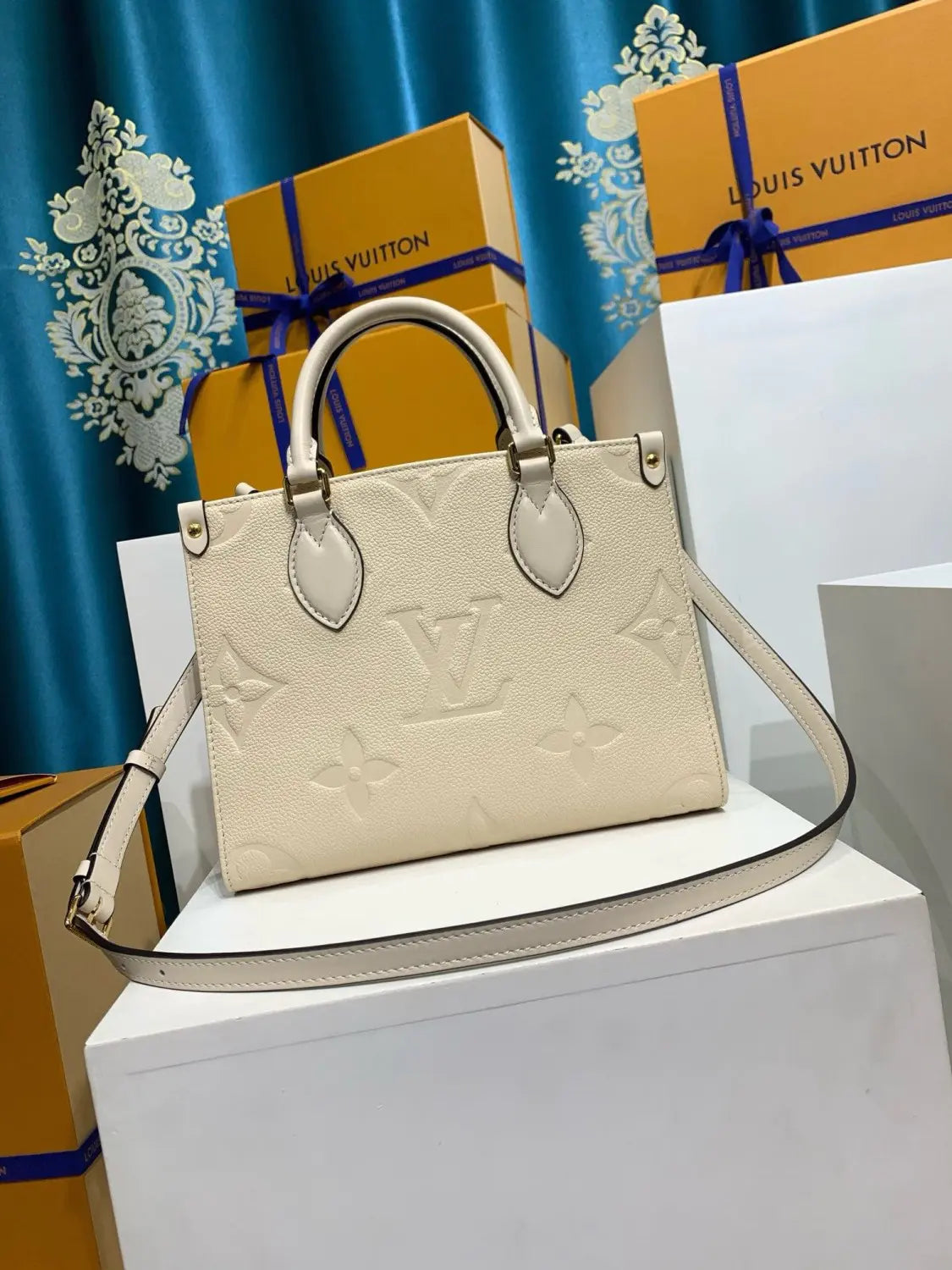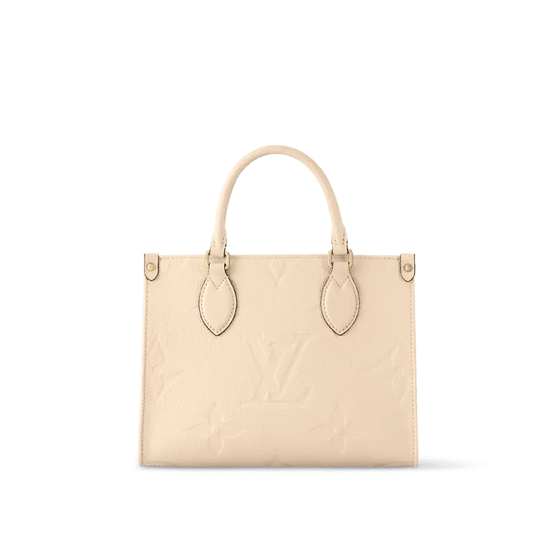 柔らかなクリームトーンのモノグラム・アンプラントレザーが、このOnTheGo PMバッグの輝きを放ちます。レザーにエンボス加工されたLVとモノグラム・フラワーが、この小ぶりなトートバッグの長方形のラインと見事に調和しています。iPad miniなどの小さな必需品を収納できます。2つのロールドレザートップハンドルと取り外し可能なストラップで、様々な持ち方が可能です。