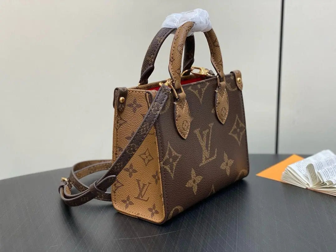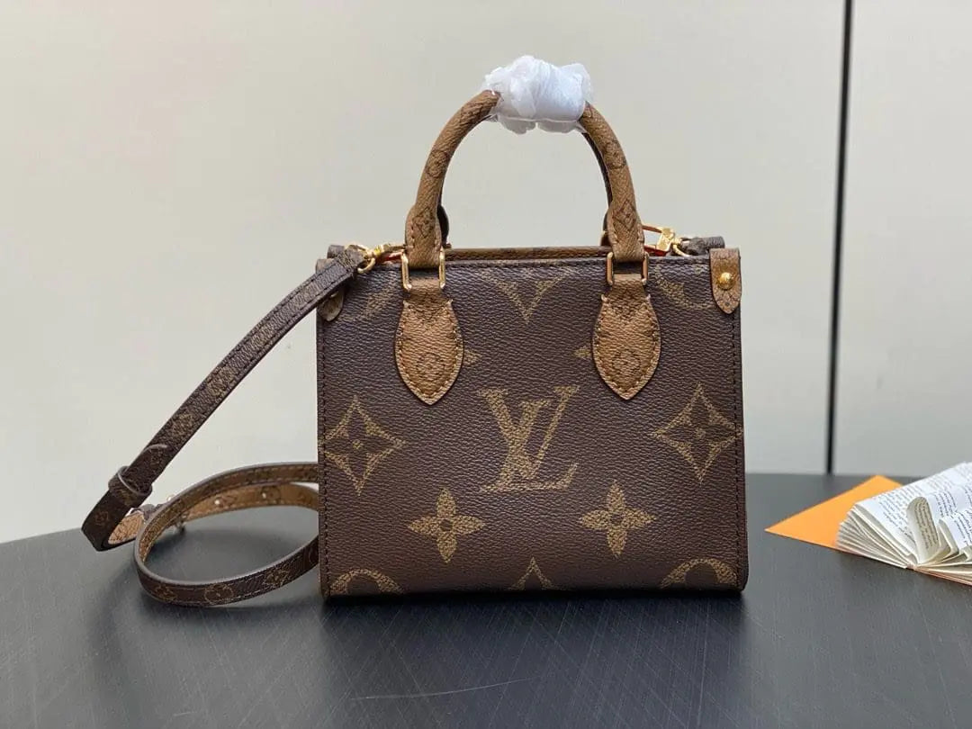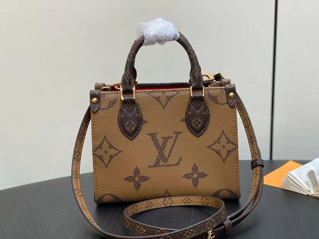 OnTheGoトートの魅力的なプチバージョンは、モノグラム・キャンバス製で、レザーハンドルとハンドルマウントにはモノグラム・リバースが施されています。このマイクロバッグは、フルサイズモデルのクラシックなディテールをすべて備え、スマートフォンも入る十分な大きさです。2つのトップハンドルに加え、取り外し・調節可能なストラップが付いています。