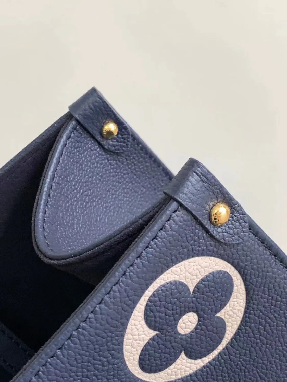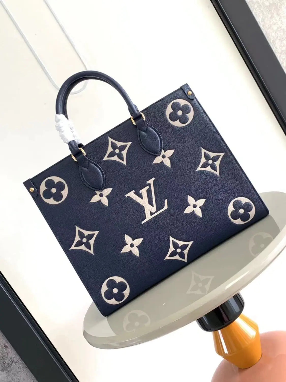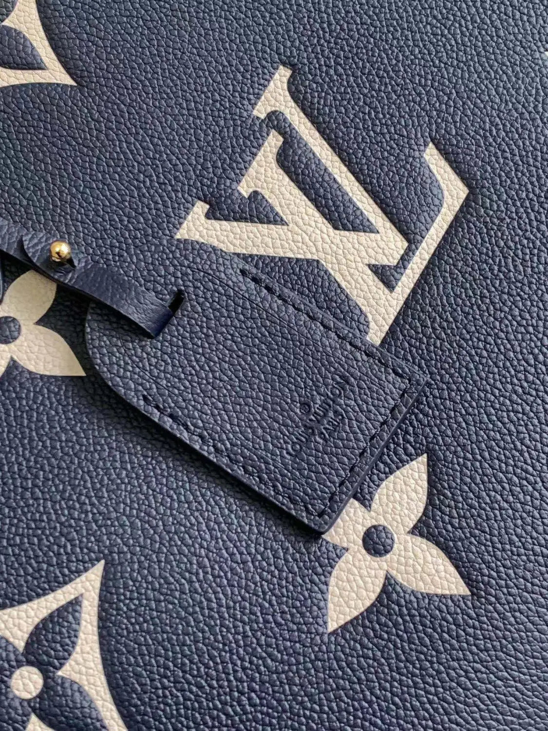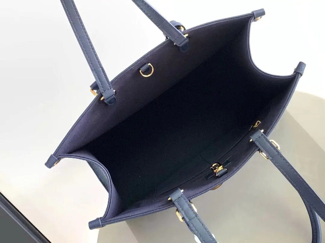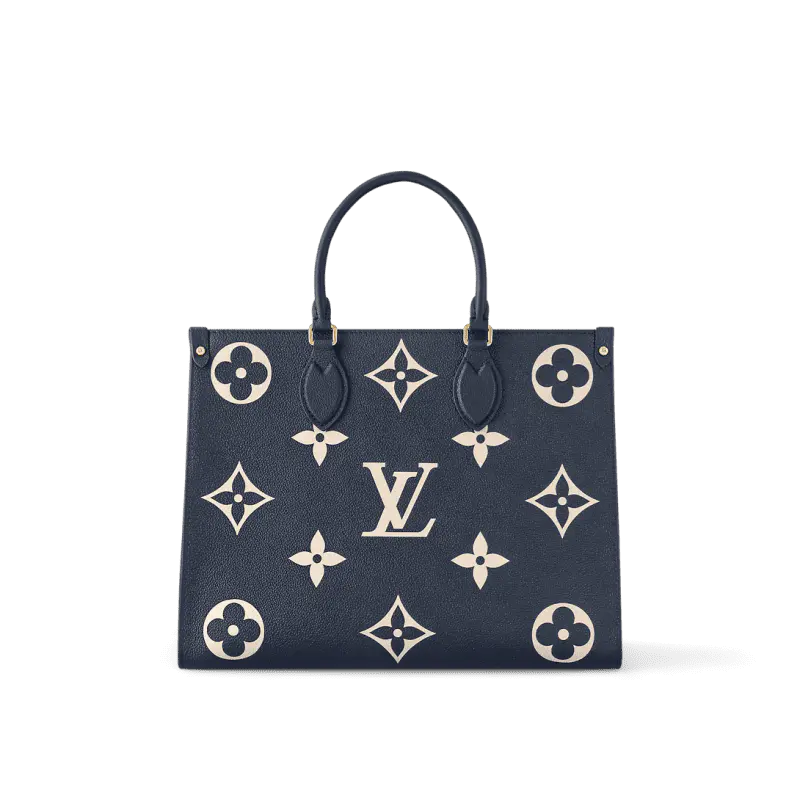 ノーティカルコレクションの一つ、モノグラム・アンプラントの牛革製トートバッグ「オンザゴー MM」は、象徴的なモノグラム・パターンをエンボス加工した後、レザーにプリントしています。13インチのノートパソコンが収まる十分な収納力があり、手持ち用の短いハンドル2本と肩掛け用の長いハンドル2本の2組のハンドルを備えています。