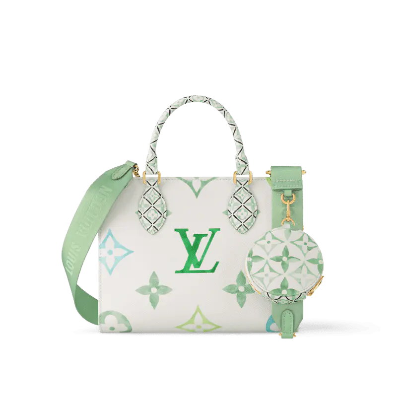 このOnTheGo PMのスモールトートバッグは、まるで水彩画のような巨大なモノグラムプリントが美しいコーティングキャンバス素材を使用しています。2つのトップハンドルには、ポルトガルの伝統的なアズレージョ陶器を彷彿とさせるモノグラムフラワーの模様があしらわれています。取り外し可能な幅広ストラップには、さりげなくLouis Vuittonのロゴが入り、同じく水彩画調のレザー製モノグラムチャームが付いています。