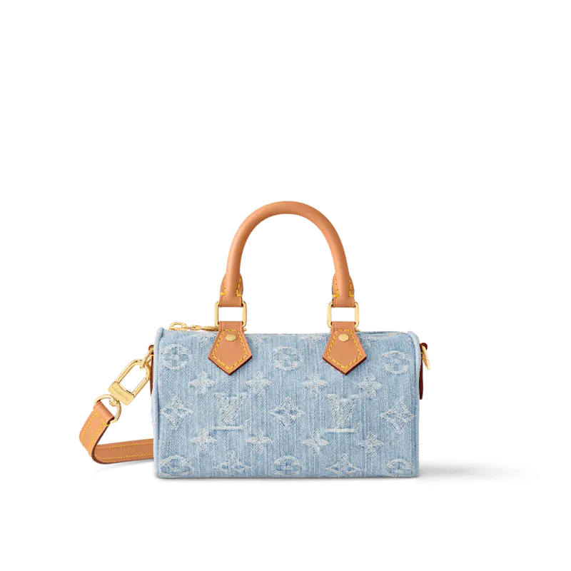 夏らしいナノ スピーディ バッグは、モノグラム柄を織り込んだピュアコットンデニム生地を使用し、ブリーチとストーンウォッシュ加工を施すことで、ファッショナブルなヴィンテージ感を演出しています。2本のハンドルと取り外し・調節可能なショルダーストラップには、ほのかなエイジング加工を施したナチュラルレザーがあしらわれています。