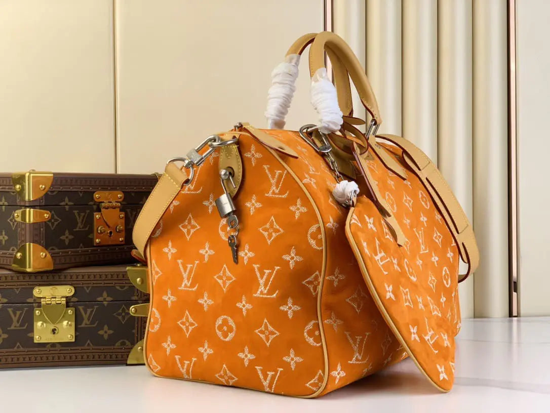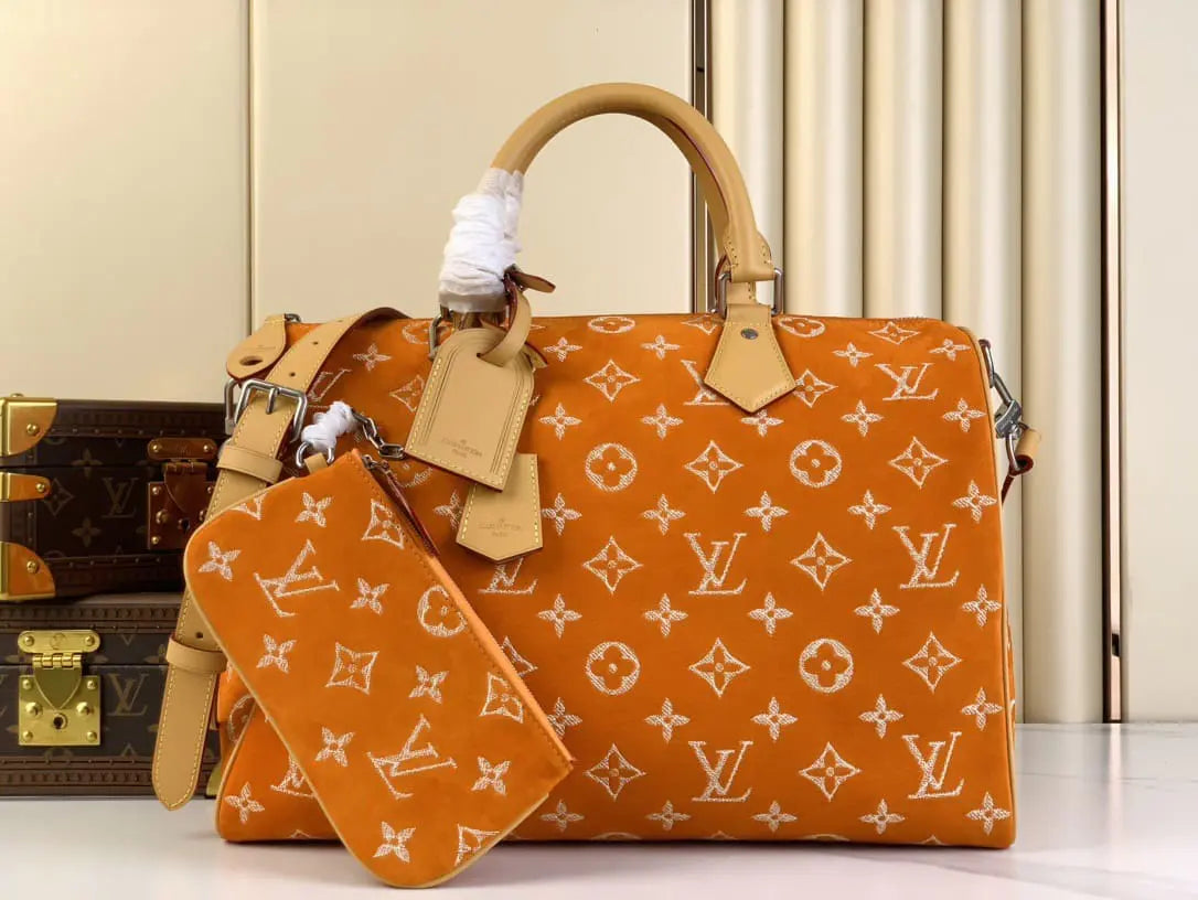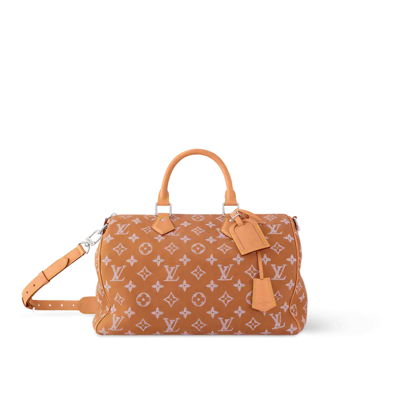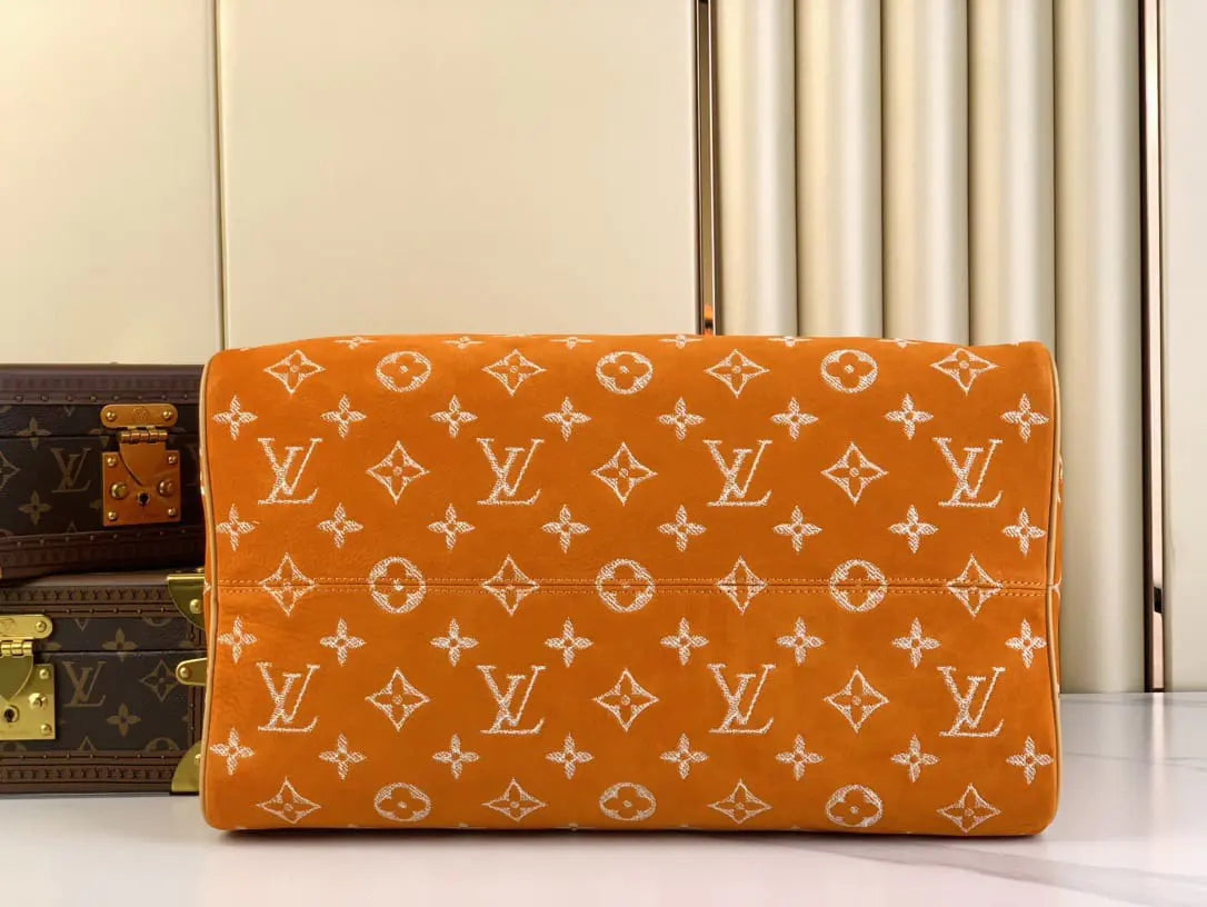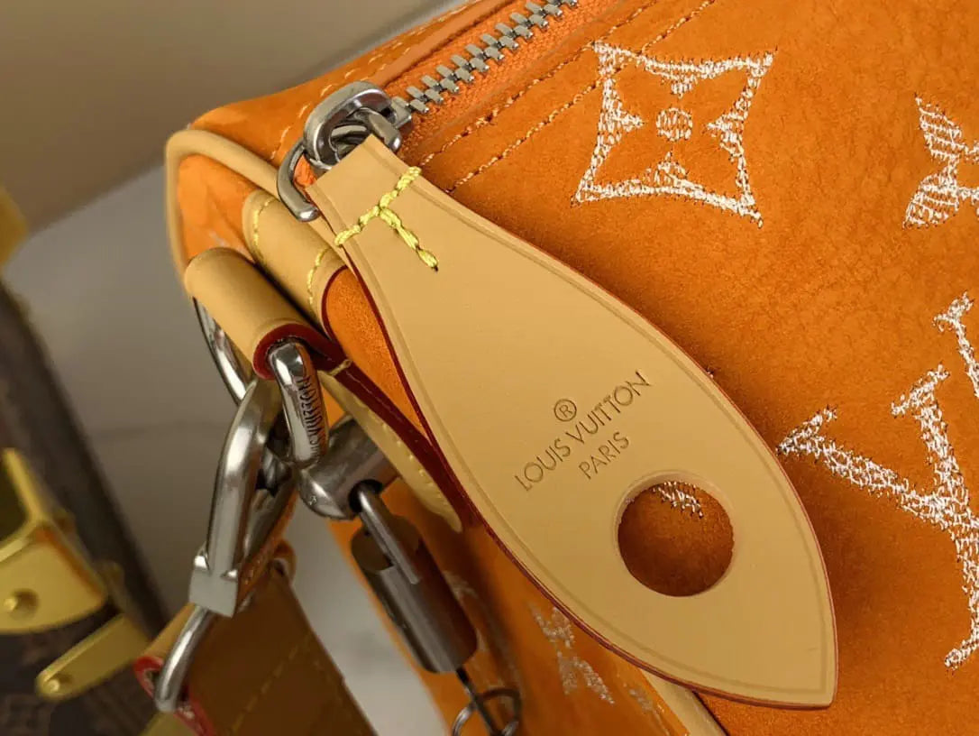 ヌバックカーフスキンを使用した「スピーディ P9 バンドリエール 40」は、独特のベルベットのような質感が特徴です。ツイル加工を施したレザー刺繍でモノグラムモチーフをあしらっています。刺繍工程はバッグ1点につき24時間かかり、約42万針ものステッチが丁寧に施されています。その後、レザーを着色顔料に浸すことで、均一な仕上がりを実現しています。