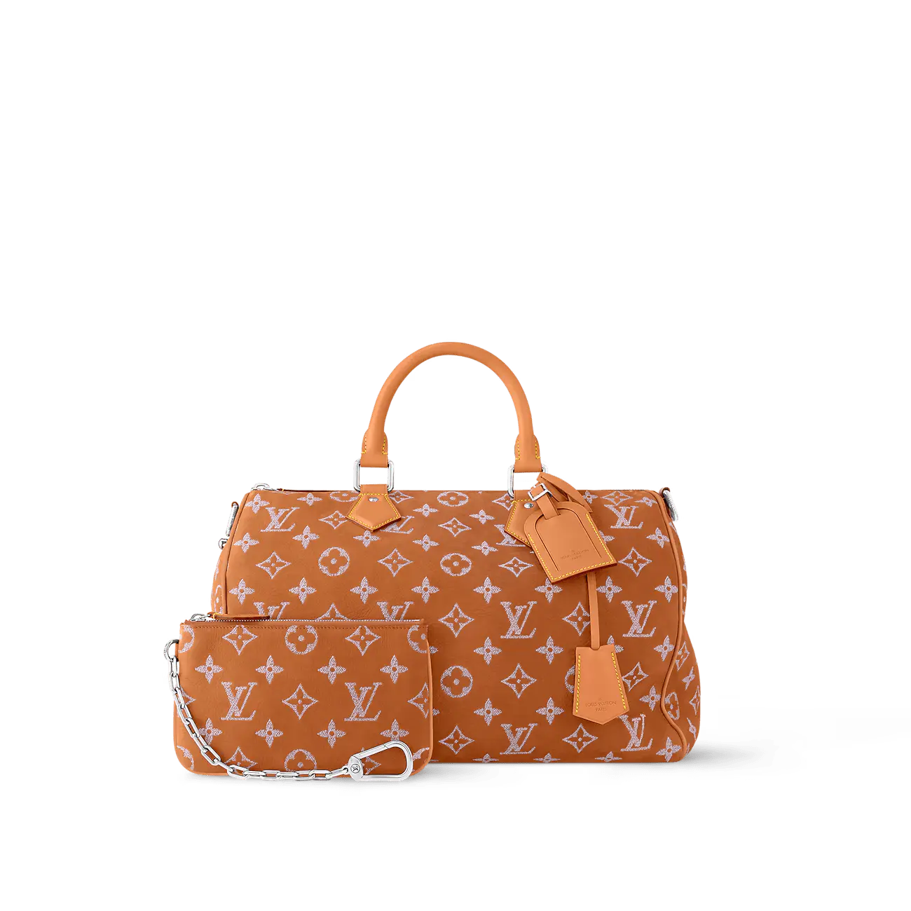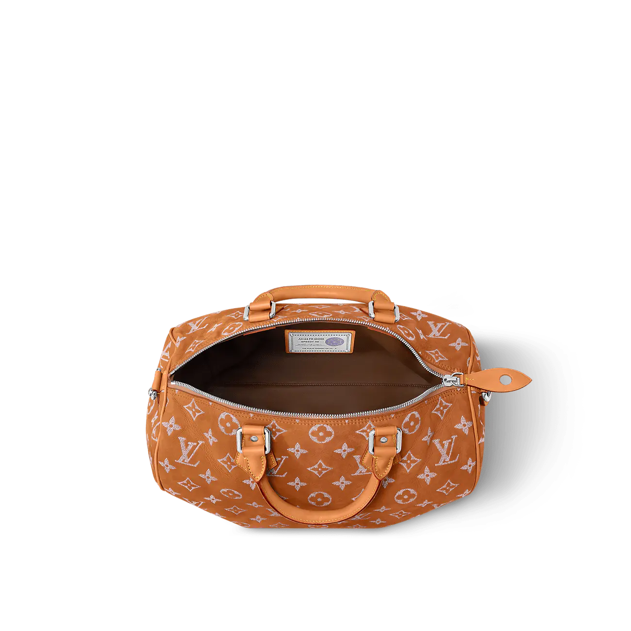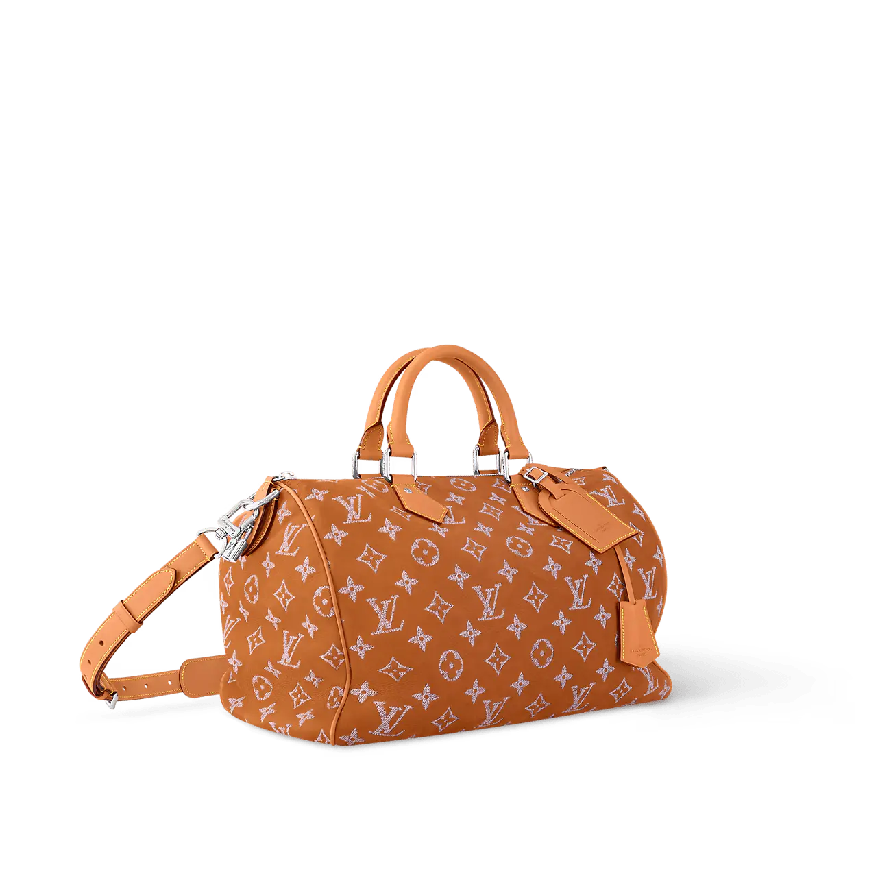 ヌバックカーフスキンを使用した「スピーディ P9 バンドリエール 40」は、独特のベルベットのような質感が特徴です。ツイル加工を施したレザー刺繍でモノグラムモチーフをあしらっています。刺繍工程はバッグ1点につき24時間かかり、約42万針ものステッチが丁寧に施されています。その後、レザーを着色顔料に浸すことで、均一な仕上がりを実現しています。