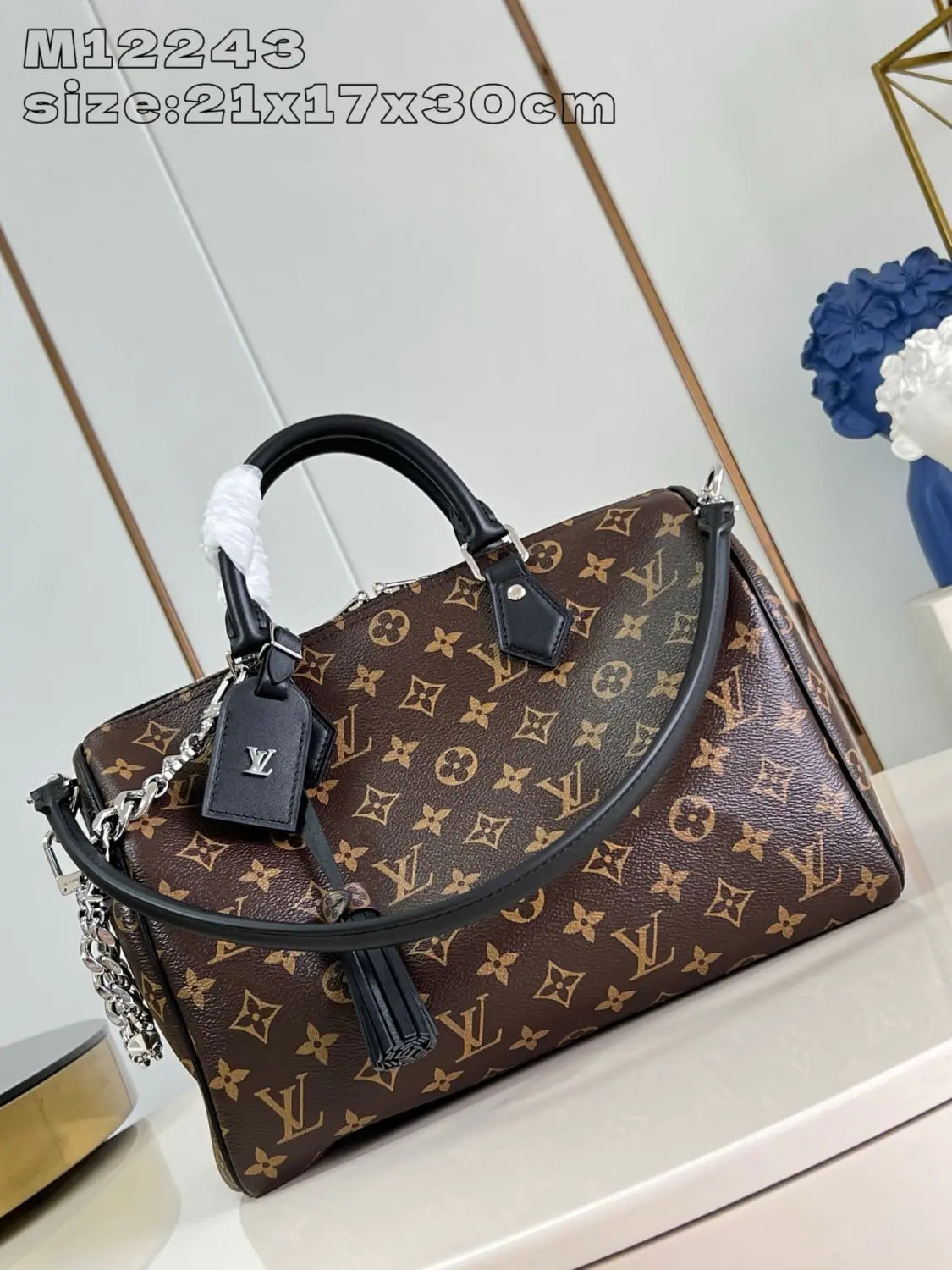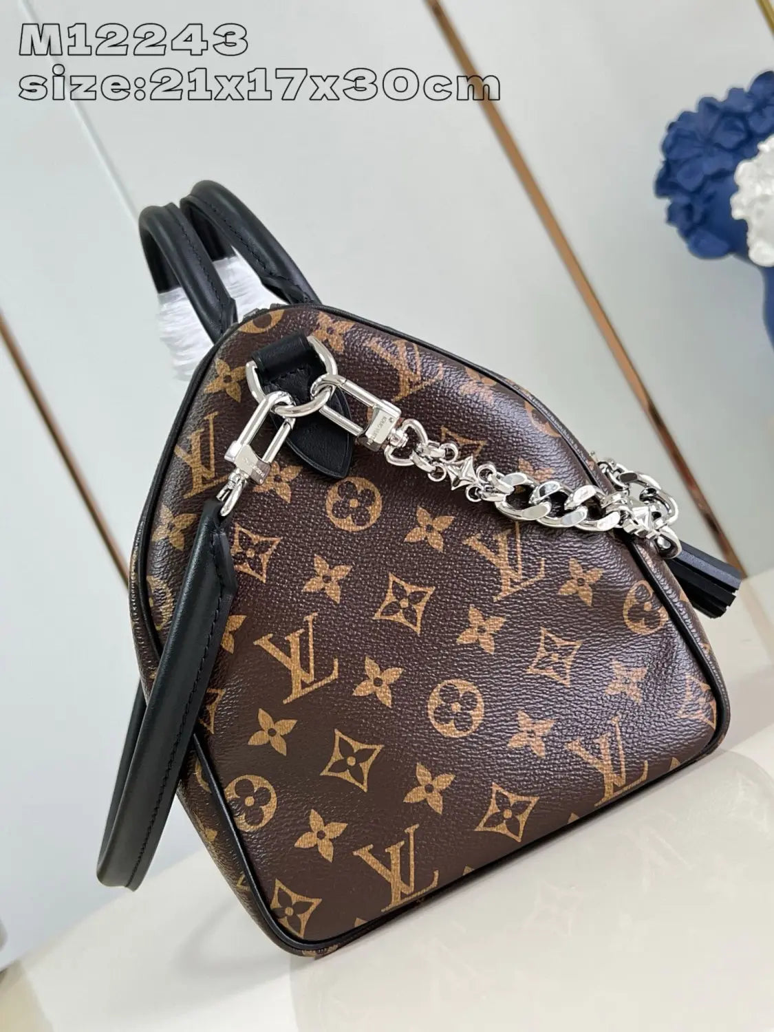 存在感を放つデザインの「スピーディ ソフト 30 ダーク」は、旅のお供に最適です。メゾンを象徴するモノグラム・コーテッドキャンバスにブラックレザーのトリミングを施し、ゴシック調の大胆なチェーンで仕上げました。シックで収納力のあるデザインには、ネームタグとタッセルが付属し、内側にはパスポートなどの貴重品を安全に収納できるジッパー付きポケットを備えています。新しいトロンハンドルが、バッグ全体の魅力をさらに引き立てます。