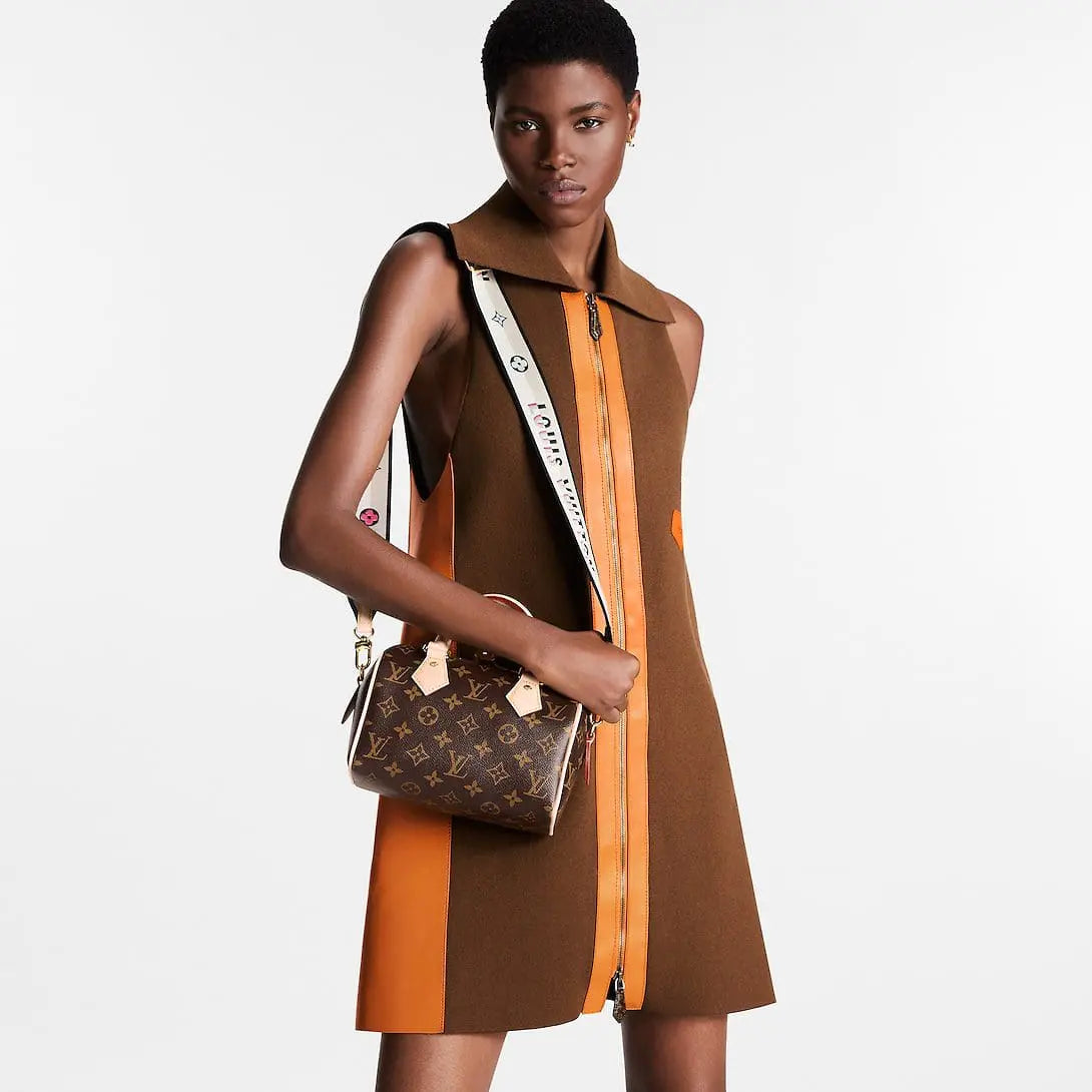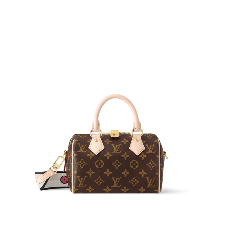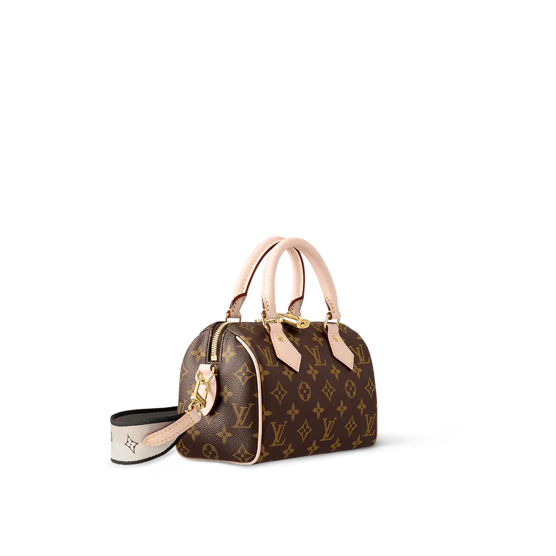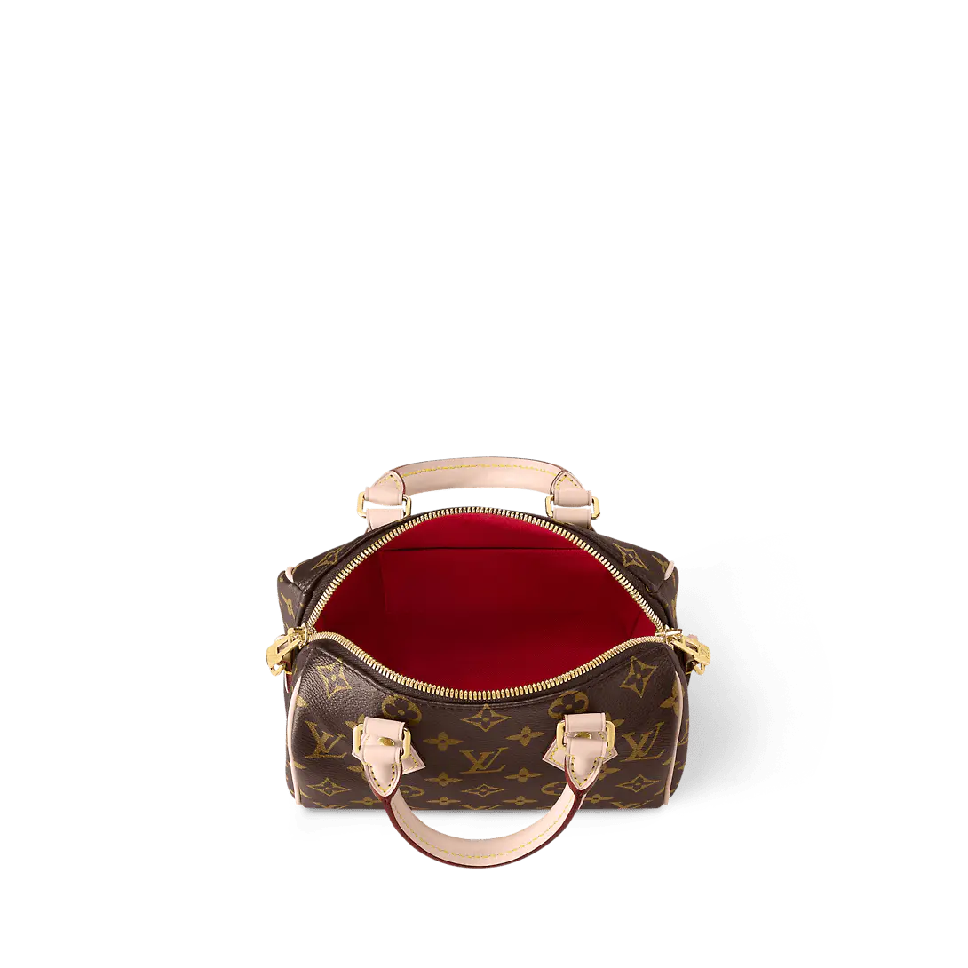 メゾンの歴史的なトラベルバッグ「スピーディ」の小型版とも言える「スピーディ・バンドリエール 20」は、モノグラム・キャンバスに天然牛革のトリムを施した逸品です。ロールドレザーのトップハンドルに加え、Louis Vuittonのシグネチャーが織り込まれた、取り外し・調節可能な幅広のテキスタイルストラップが付いています。クラシックなデザインは、赤いテキスタイルのライニングで引き立てられています。