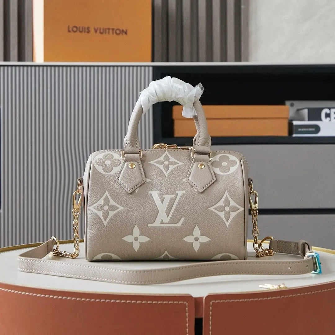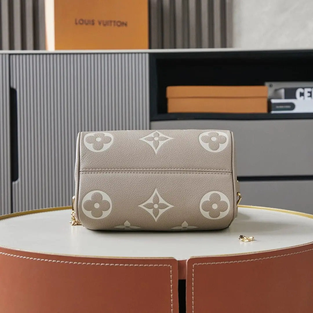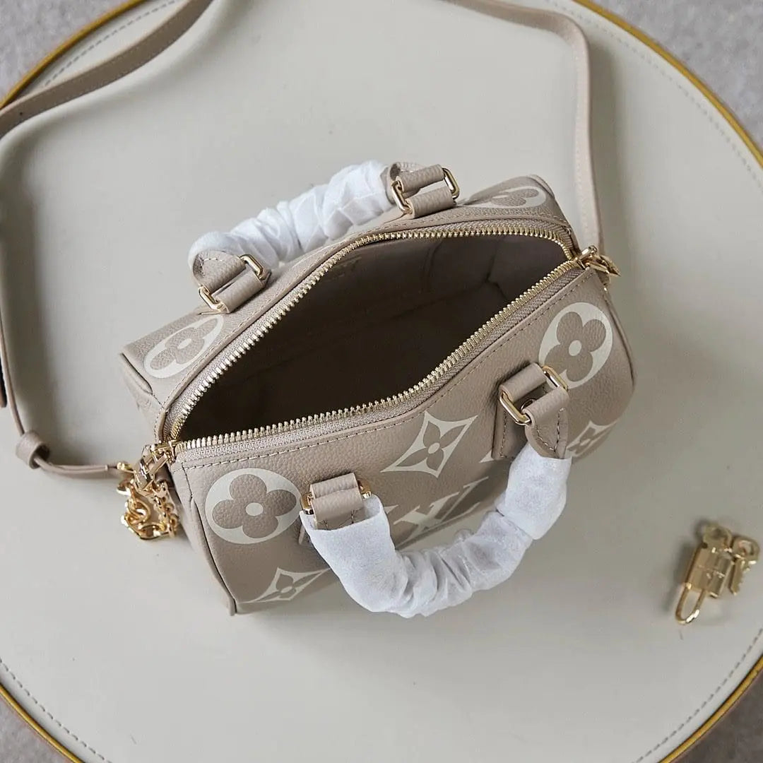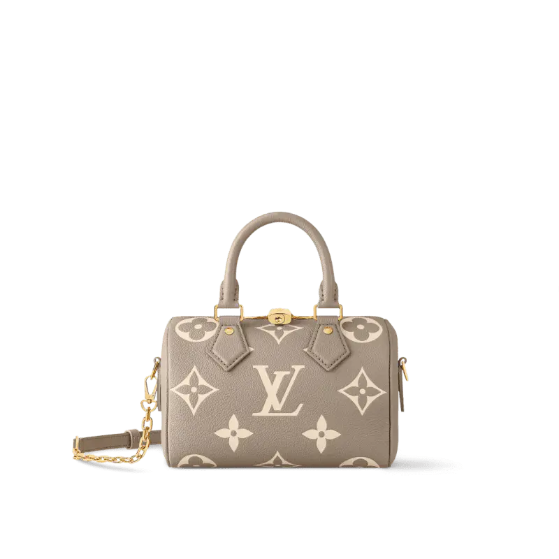 クリームカラーのLVとモノグラム・フラワーをあしらったツートンのモノグラム・アンプラントレザーを使用した「スピーディ・バンドリエール 20」は、モダンなクラシックバッグです。1930年代に発表されたメゾンのラゲージライン「スピーディ」からインスピレーションを得たこのバッグは、同じフォルムと可動式トップハンドルが特徴です。チェーンとレザーのストラップは、ショルダーバッグとしてもクロスボディバッグとしてもお使いいただけます。