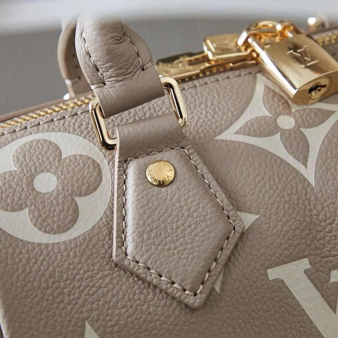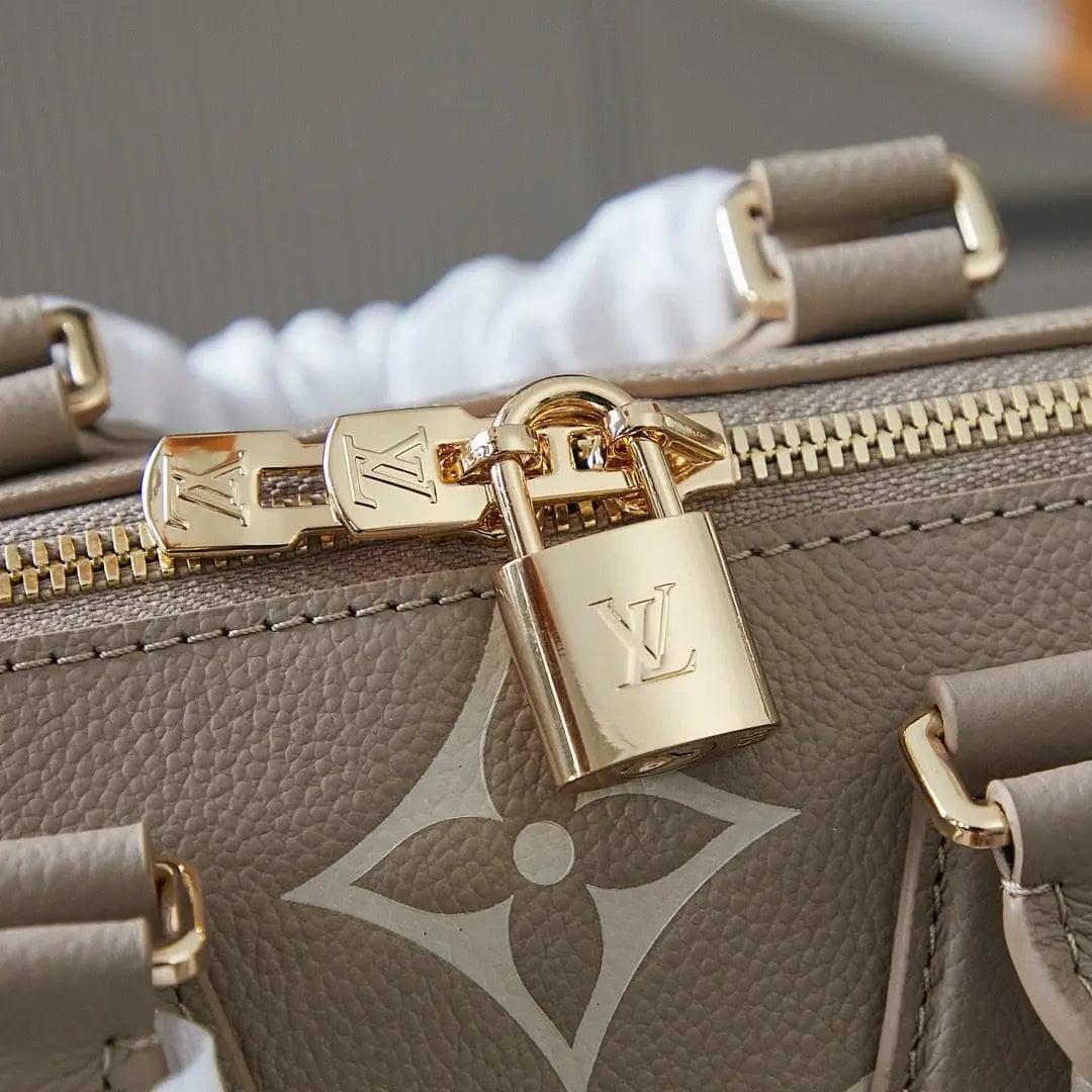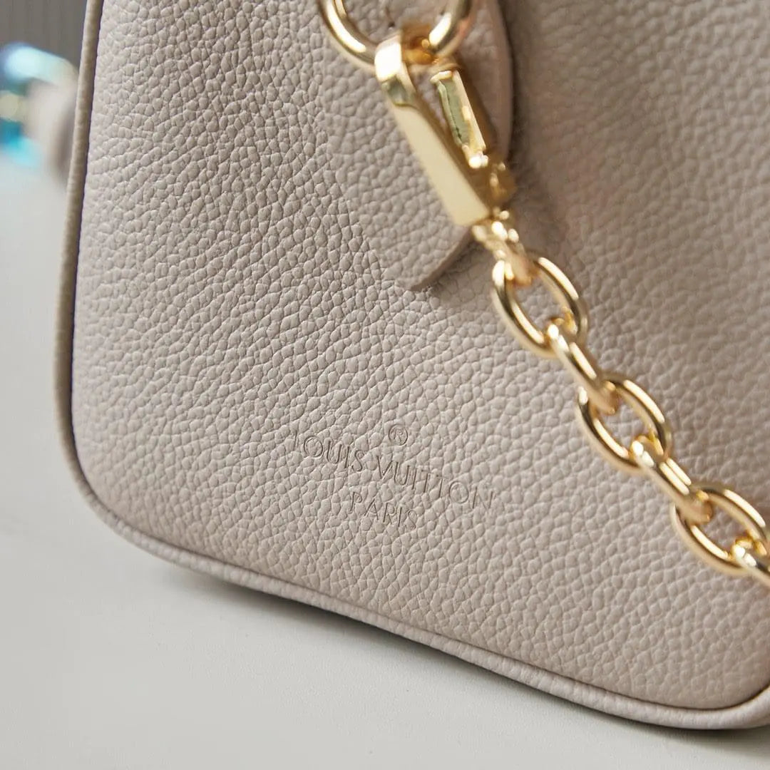 クリームカラーのLVとモノグラム・フラワーをあしらったツートンのモノグラム・アンプラントレザーを使用した「スピーディ・バンドリエール 20」は、モダンなクラシックバッグです。1930年代に発表されたメゾンのラゲージライン「スピーディ」からインスピレーションを得たこのバッグは、同じフォルムと可動式トップハンドルが特徴です。チェーンとレザーのストラップは、ショルダーバッグとしてもクロスボディバッグとしてもお使いいただけます。