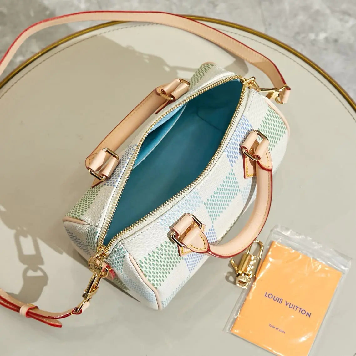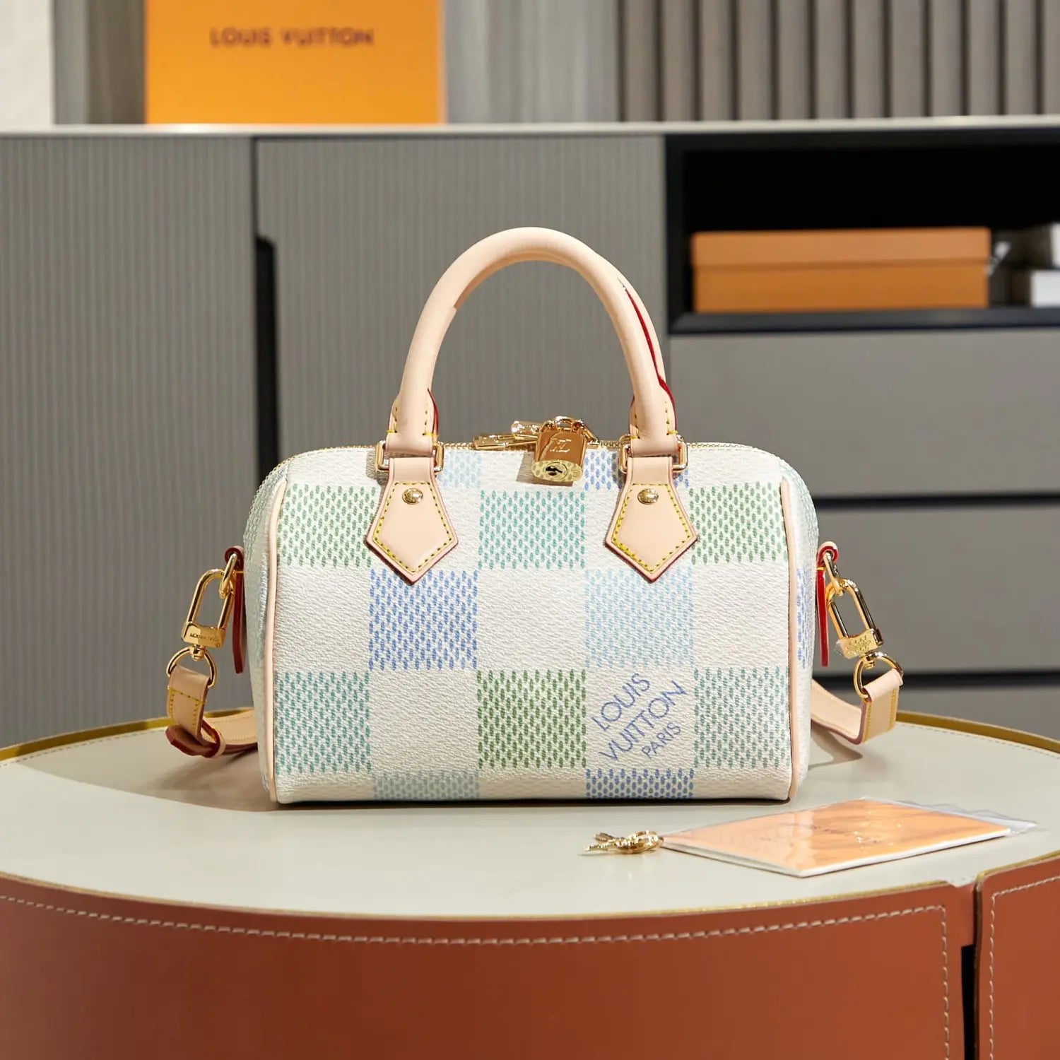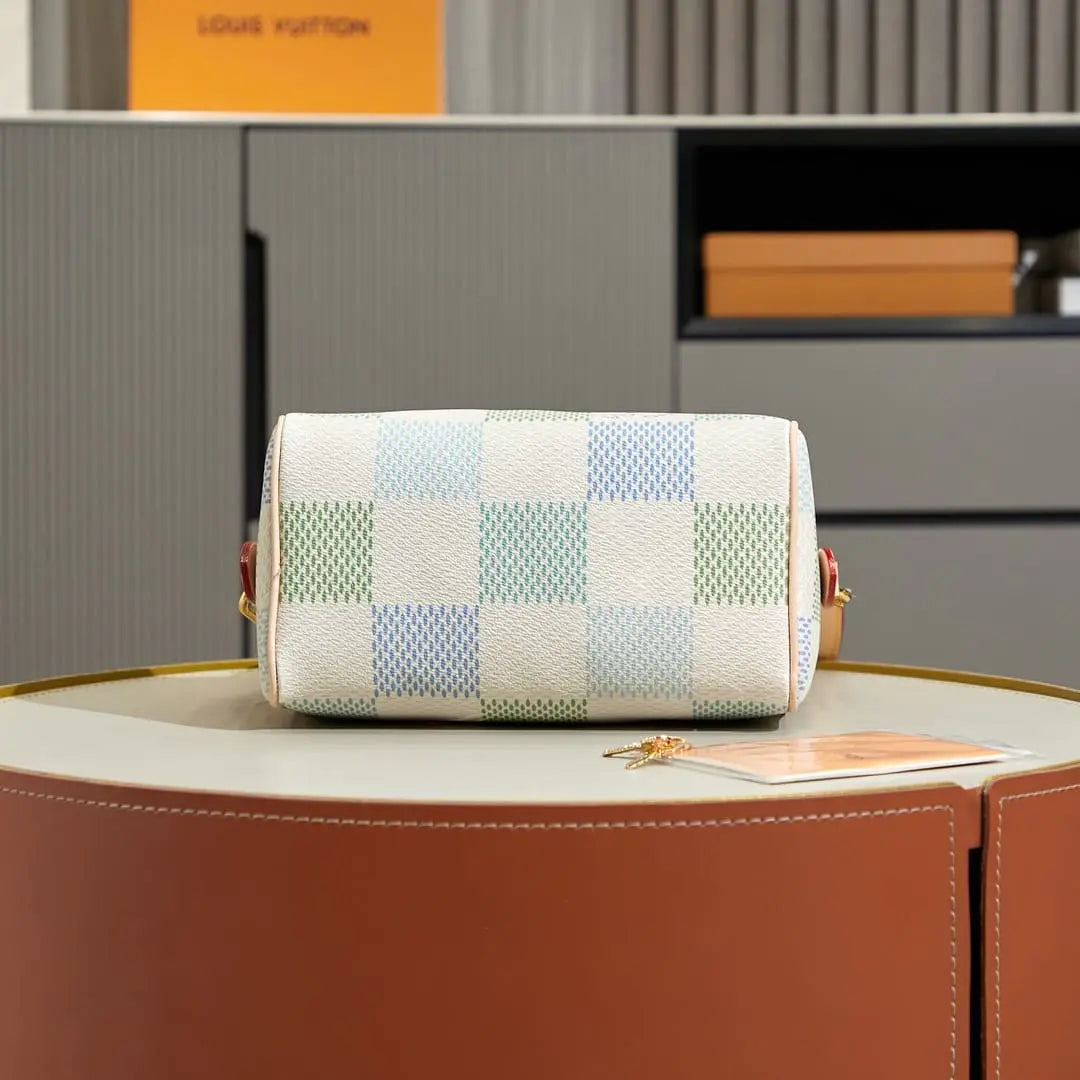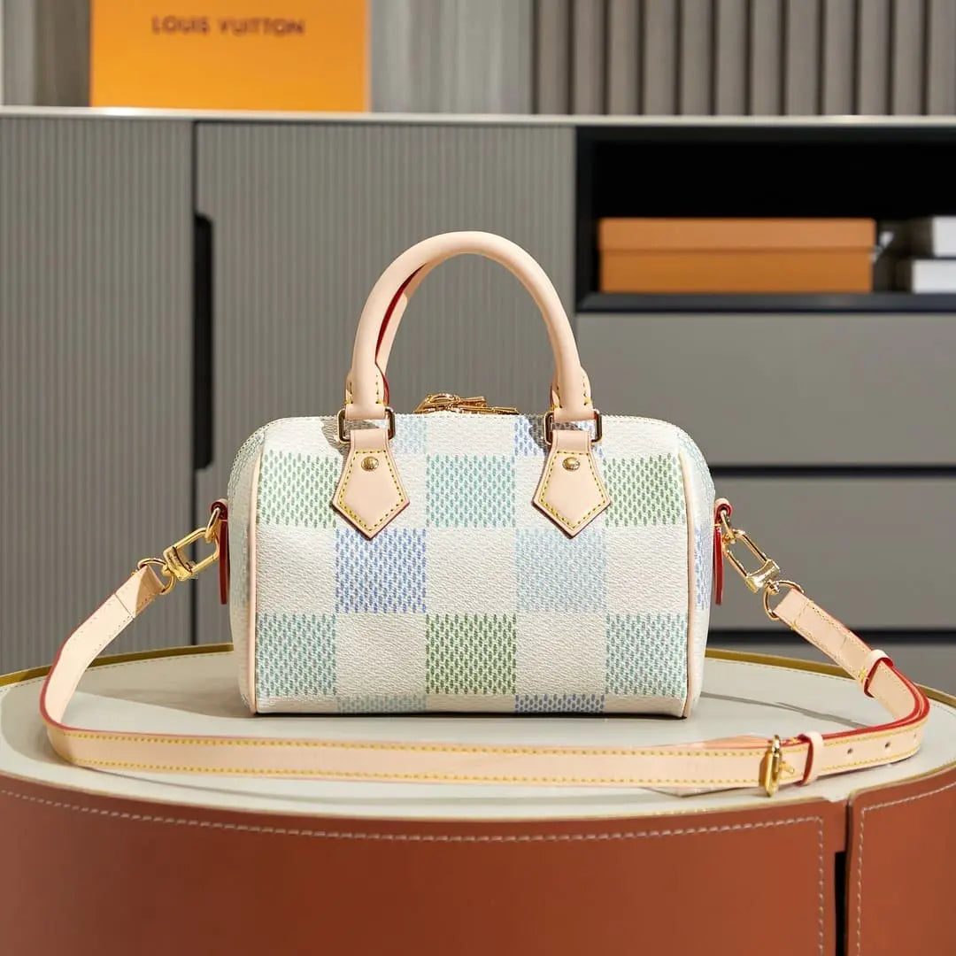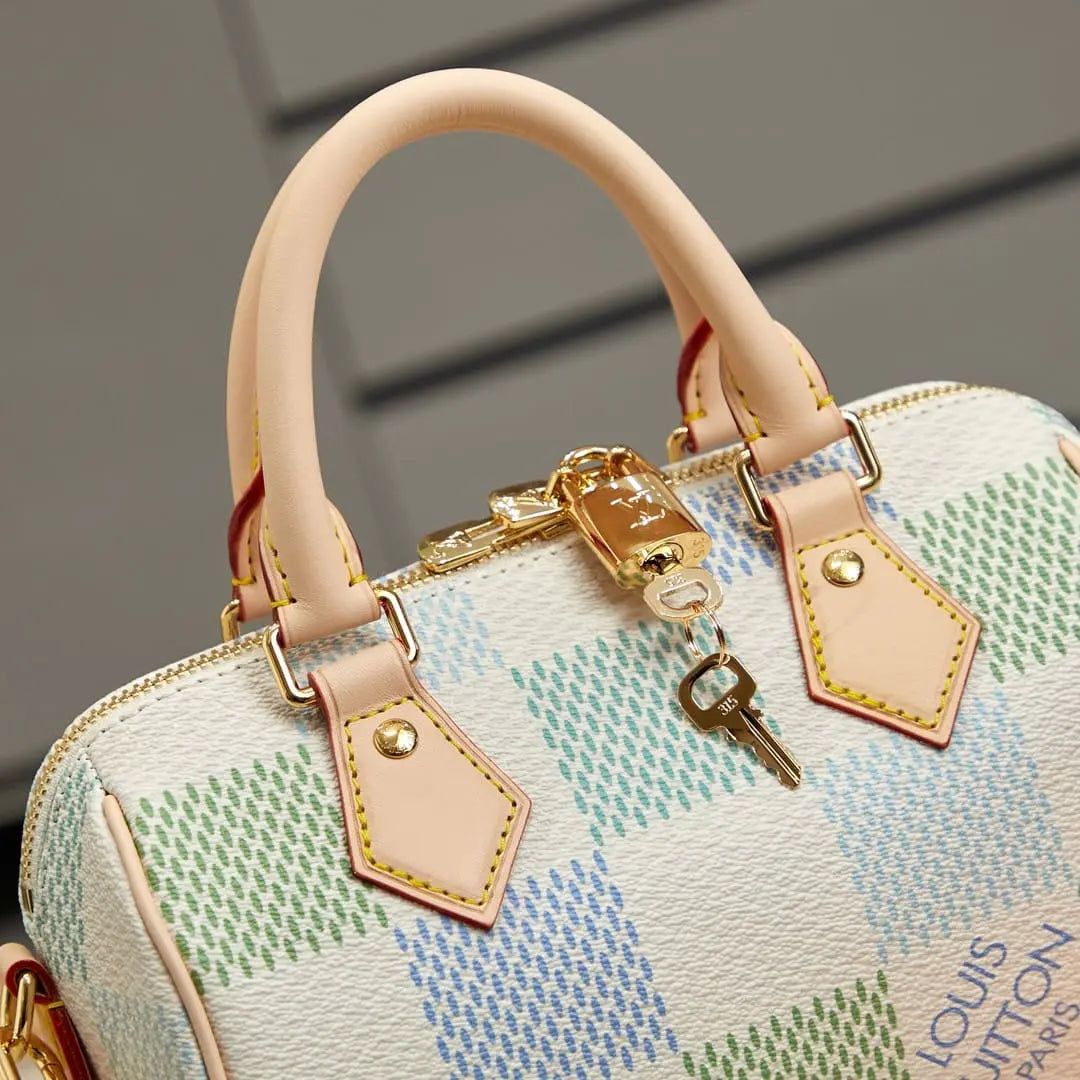 ダミエ・ジャイアント キャンバスを使用した「スピーディ バンドリエール 20」ハンドバッグは、精緻なデジタルプリント技術により、4つの異なるパステルカラーを組み合わせた新鮮なカラーウェイで仕上げられています。メゾンのクラシックなトラベルバッグからインスピレーションを得た、特徴的なフォルムには、2つのロールドレザートップハンドルと、取り外し・調節可能なストラップが付いており、ショルダーバッグとしてもクロスボディバッグとしてもお使いいただけます。