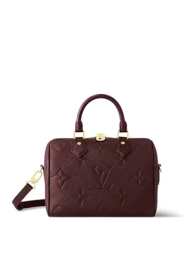 グレイン加工を施したモノグラム・アンプラント レザーに、控えめなジャイアントモノグラムパターンをエンボス加工した、コンパクトなスピーディ 25 ハンドバッグは、メゾンの時代を超えたアイコンです。個性的なシルエット、ロールドレザーハンドル、ゴールドカラーのパドロックが、一目でそれとわかる存在感を放ちます。取り外し可能なレザーストラップは、ショルダーバッグとしてもクロスボディバッグとしてもお使いいただけます。