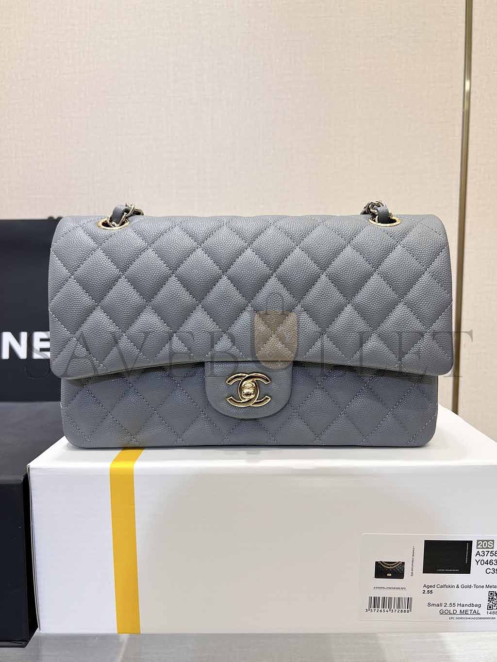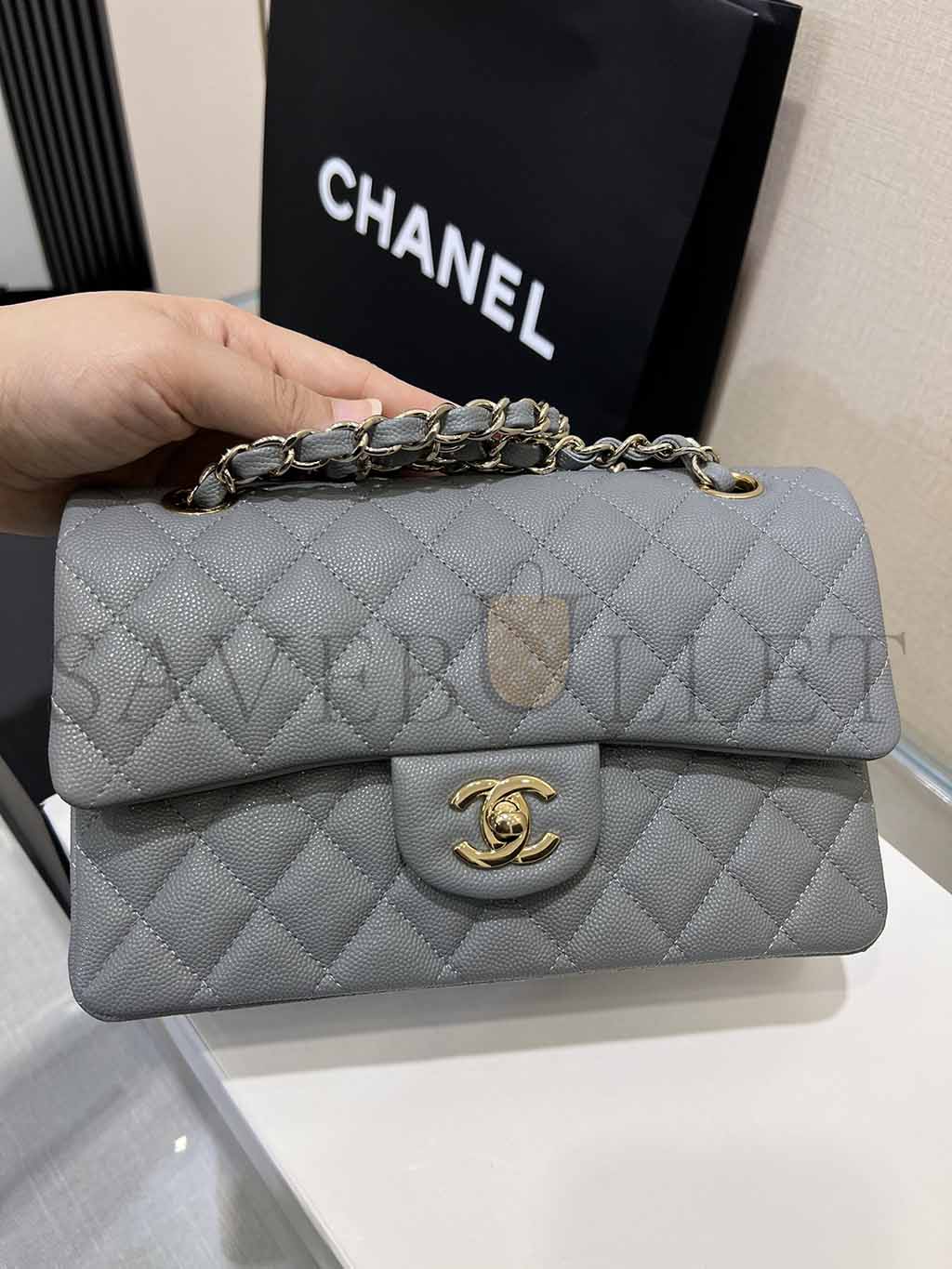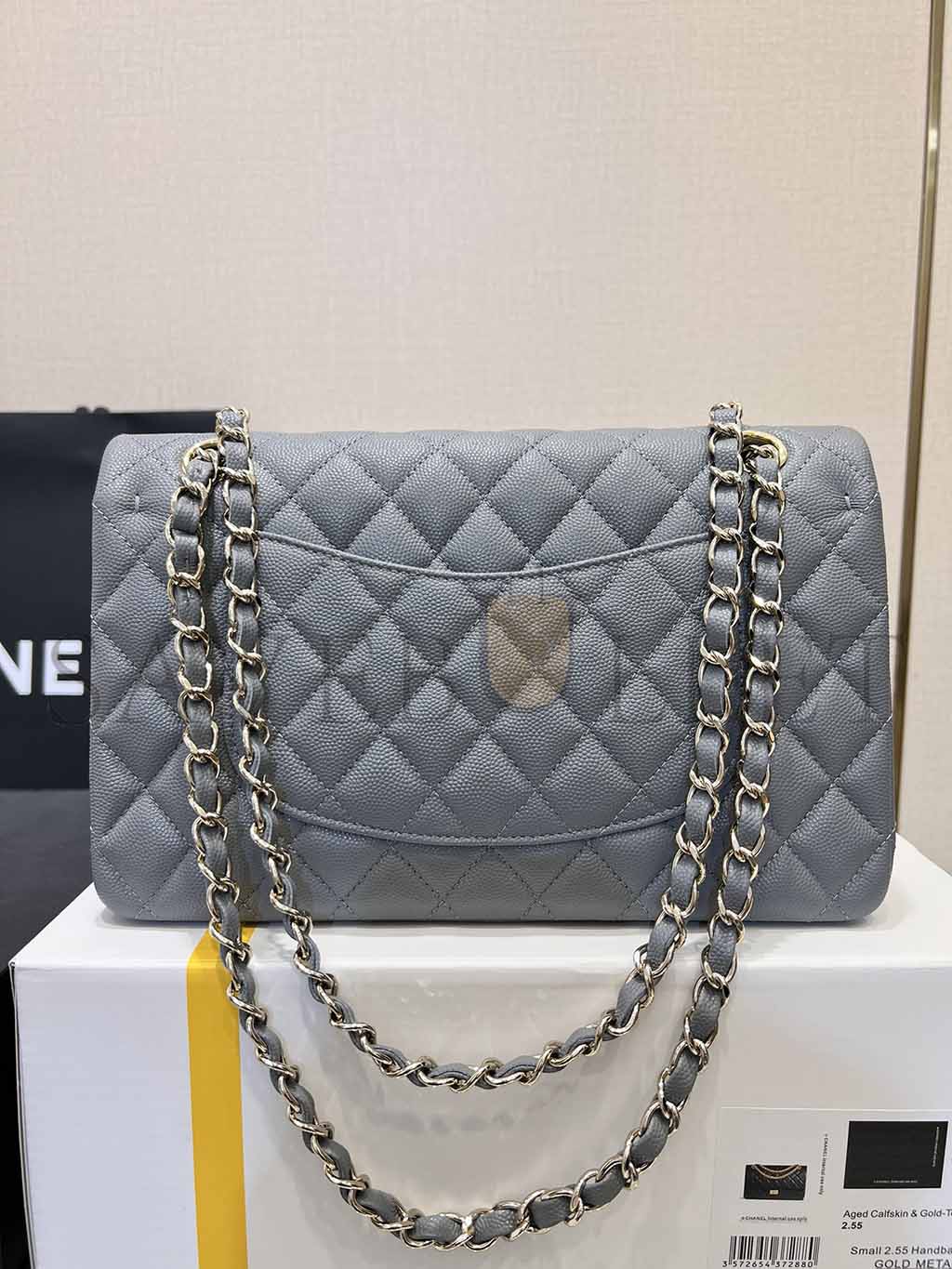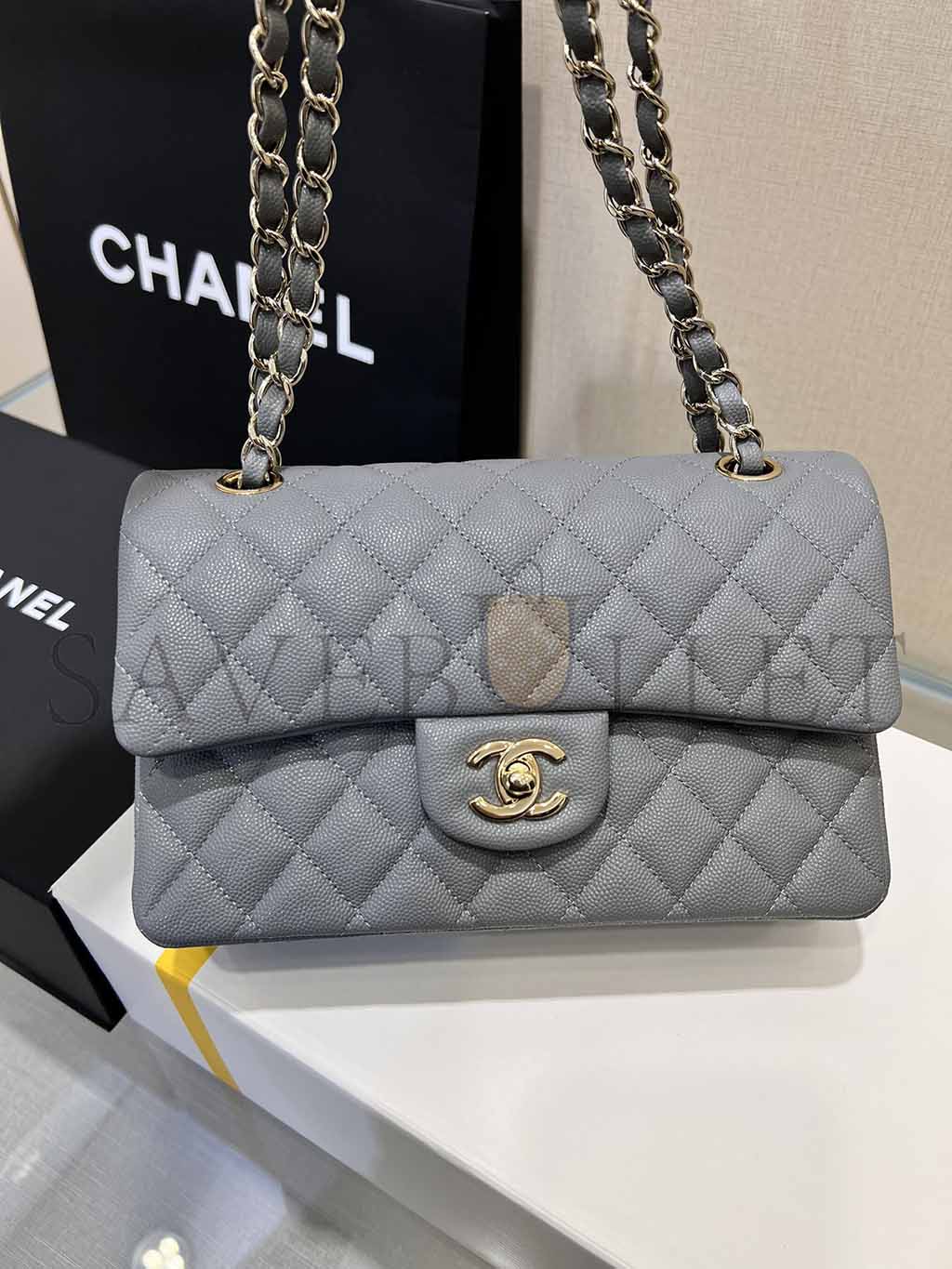シャネル クラシック ミディアム フラップ グレー キャビア ライトゴールド金具 A37586 (25.5×15.5×6.5cm)