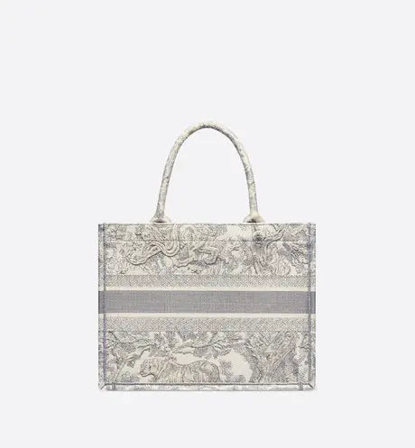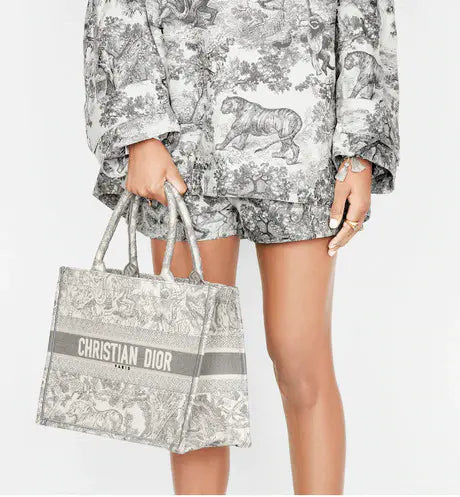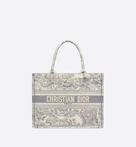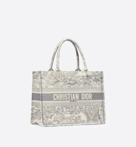 ディオール ブックトートは、ディオールのクリエイティブ・ディレクター、マリア・グラツィア・キウリによって発表されたオリジナル作品で、ディオールの美学を体現する定番アイテムとなっています。毎日の必需品をすべて収納できるようデザインされたこのバッグは、グレーのトワル・ド・ジュイのモチーフが全面に刺繍され、フロントには「CHRISTIAN DIOR」のシグネチャーがあしらわれています。メゾンのサヴォアフェールを体現したこの小ぶりなトートバッグは、手持ちでも肩掛けでもお使いいただけます。