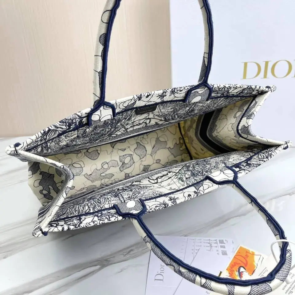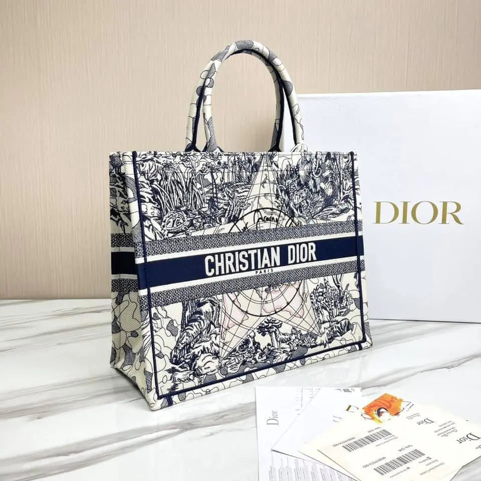 クリスチャン・ディオールのクリエイティブ・ディレクター、マリア・グラツィア・キウリによって発表された「ディオール ブックトート」は、ディオールの美学を体現する定番アイテムとなっています。毎日の必需品をすべて収納できるようデザインされたブラックのバッグには、ホワイトの「Dior Around the World」モチーフが刺繍であしらわれ、光沢のある糸とマットな糸を組み合わせた遊び心のあるデザインが魅力です。フロントには「CHRISTIAN DIOR」のシグネチャーがあしらわれ、メゾンのシグネチャーであるサヴォアフェールを体現しています。このトートバッグは、手持ちでも肩掛けでもお使いいただけます。