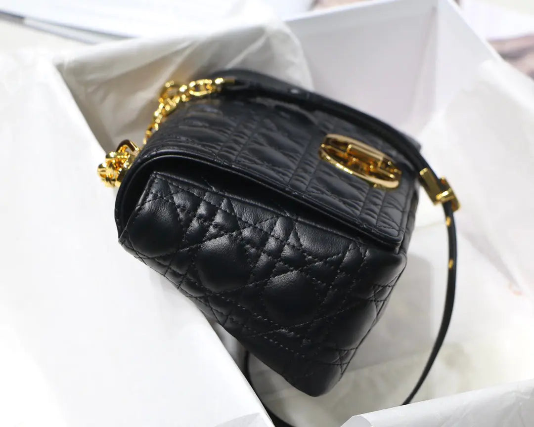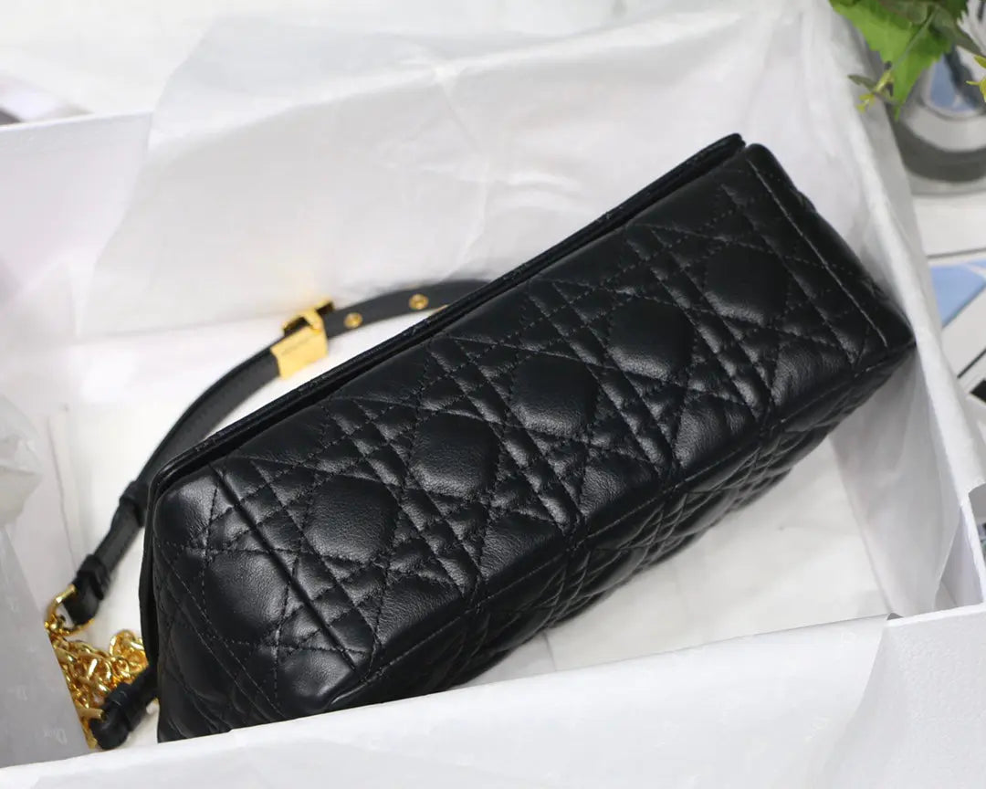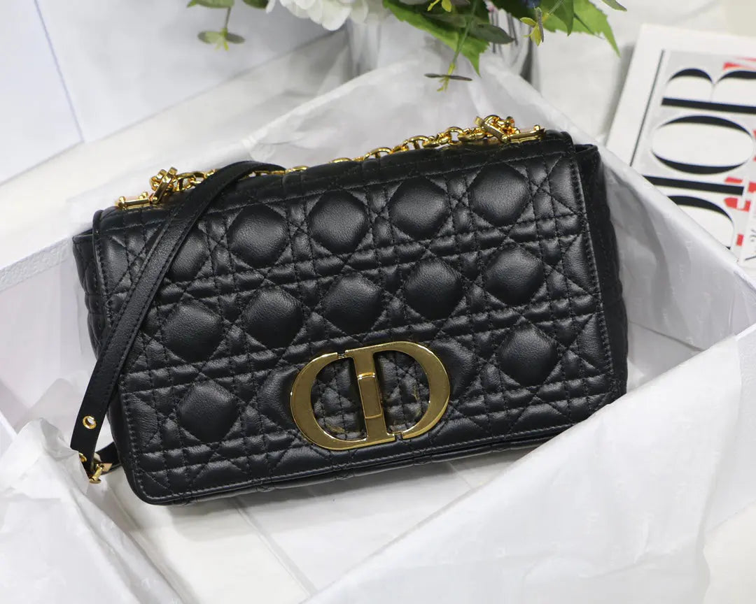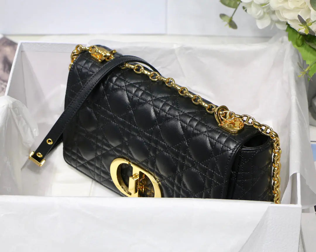 ディオール カロ バッグは、モダンさとタイムレスなエレガンスを融合させたバッグです。ブラックのカーフスキンにカナージュステッチを施したデザイン。しなやかなフラップには、クリスチャン・ディオールの香水ボトルのシールからインスピレーションを得た、アンティークゴールド仕上げのメタル製「CD」ツイストクラスプがあしらわれています。「CD」のシグネチャーリンクが付いた取り外し可能なチェーンショルダーストラップは、ミディアムサイズで、手持ちでも肩掛けでもお使いいただけます。また、デイタイムやイブニングスタイルに合わせて、メゾンならではの幅広の刺繍ストラップに交換することも可能です。